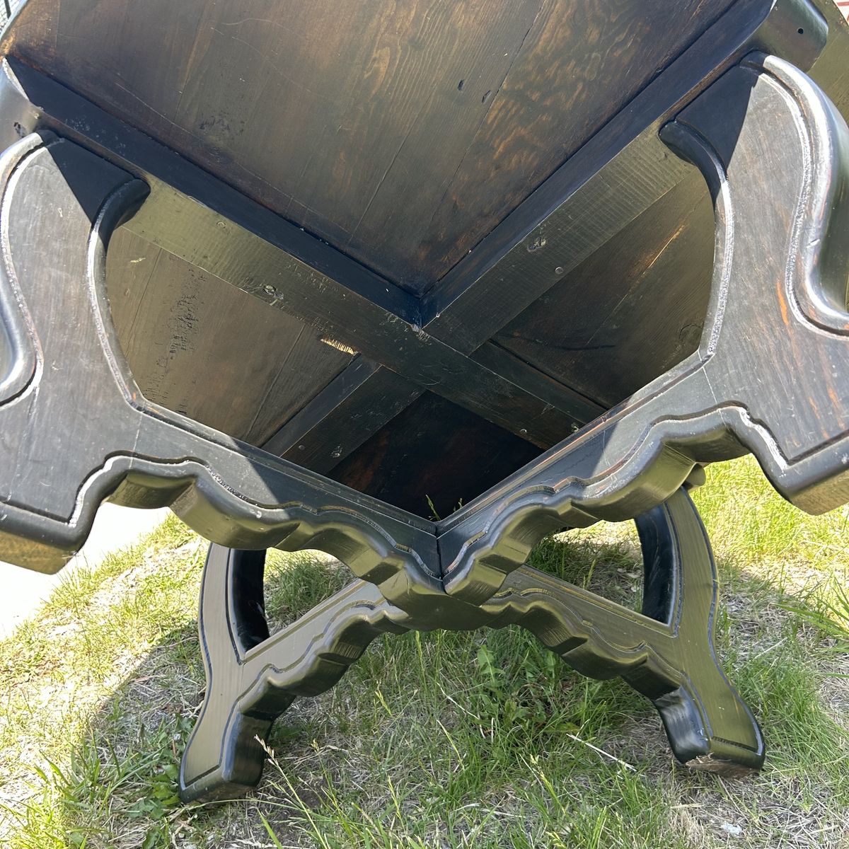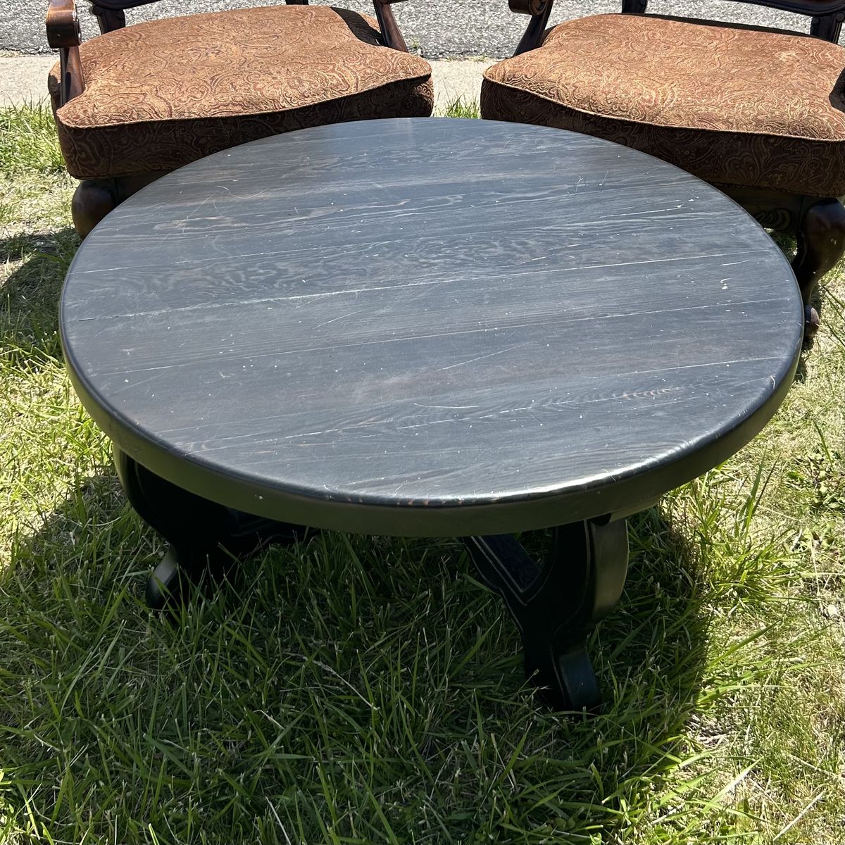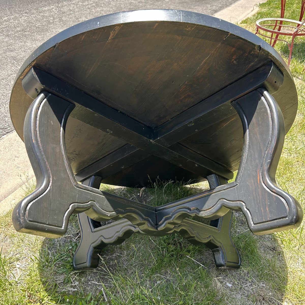 Solid Pine thick and sturdy heavy COFFEE TABLE that is Stained Black, but easy to refinish or paint. I always used this table To give my standard poodle a hair cut, and she weighed 75 lbs. It’s so sturdy full Grown adults of 150 lbs could probably stand on it. It’s a high quality table & super well made. Being a round table with rounded edges is safer for adults that frequently fall or for small children.