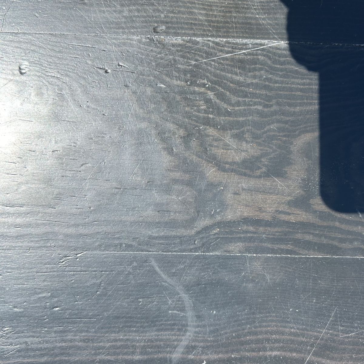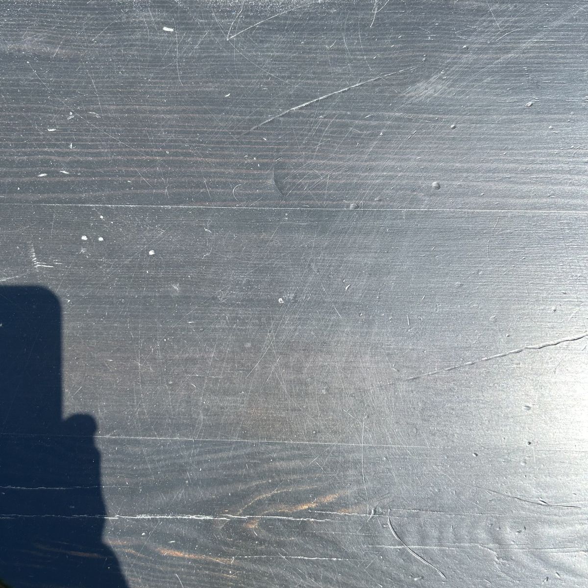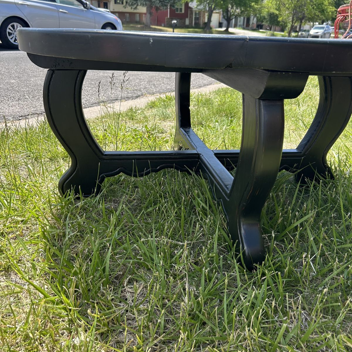 Solid Pine thick and sturdy heavy COFFEE TABLE that is Stained Black, but easy to refinish or paint. I always used this table To give my standard poodle a hair cut, and she weighed 75 lbs. It’s so sturdy full Grown adults of 150 lbs could probably stand on it. It’s a high quality table & super well made. Being a round table with rounded edges is safer for adults that frequently fall or for small children.