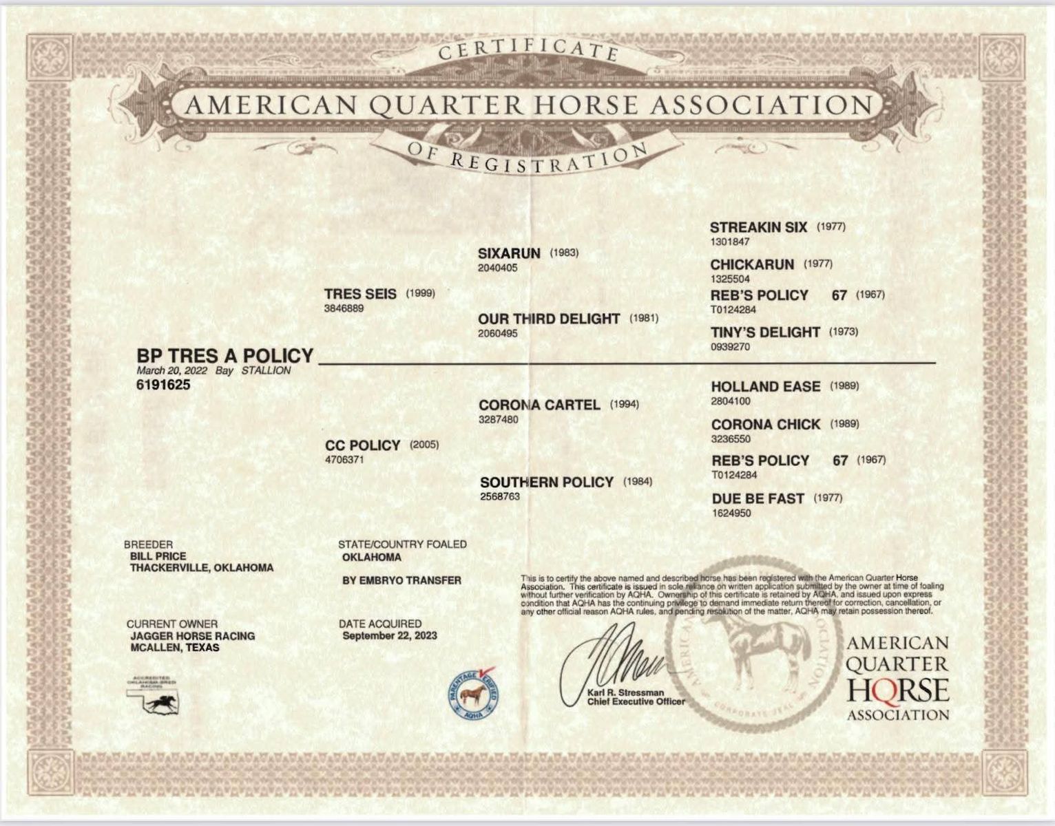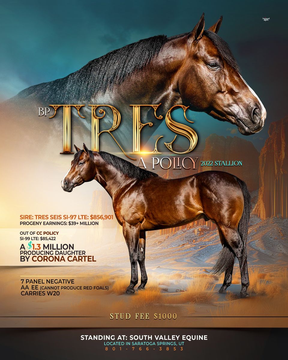 CC Policy is a proven producer of many amazing prodigy. BP Tres Seis Policy (full sister to Pol) with an SI of 120 and an LTE of $71,014 and her progeny earnings are $460,017+. CC Policy has also produced BP Cartel Policy SI-104 $634,094 and still racing, BP Valiant Policy LTE: $106,854, BP Its My Policy LTE: $100,294