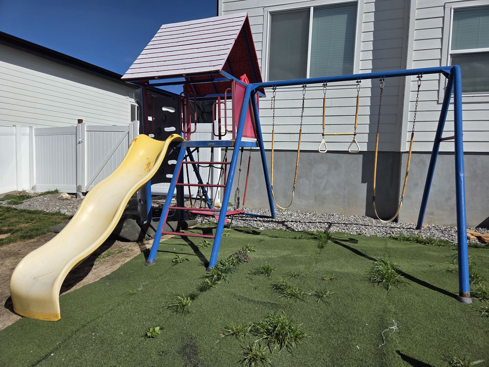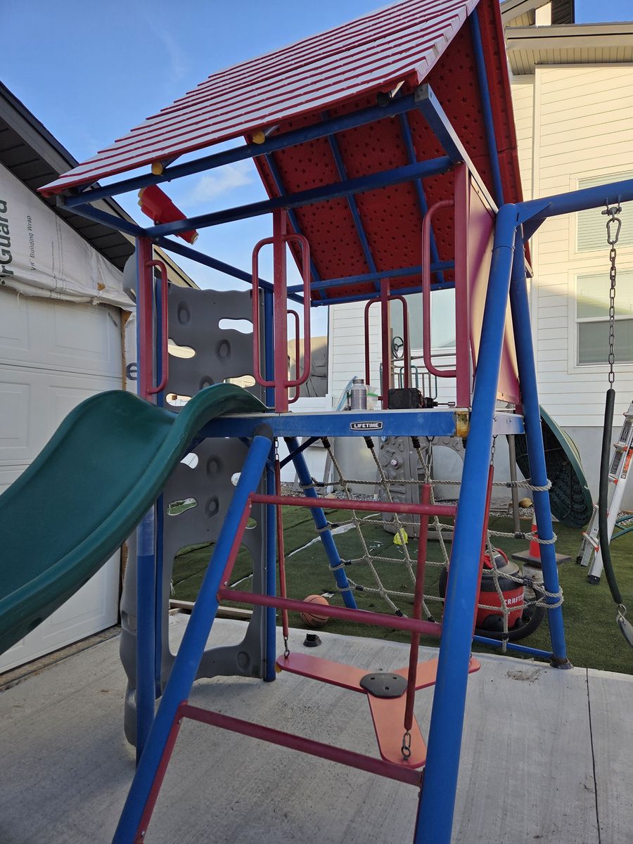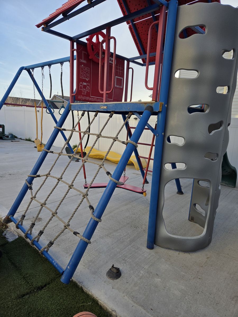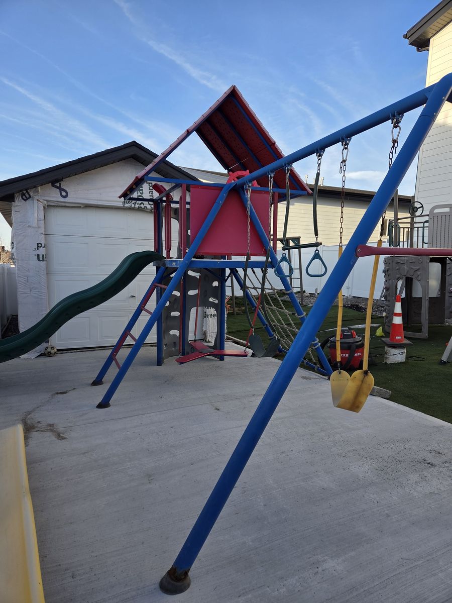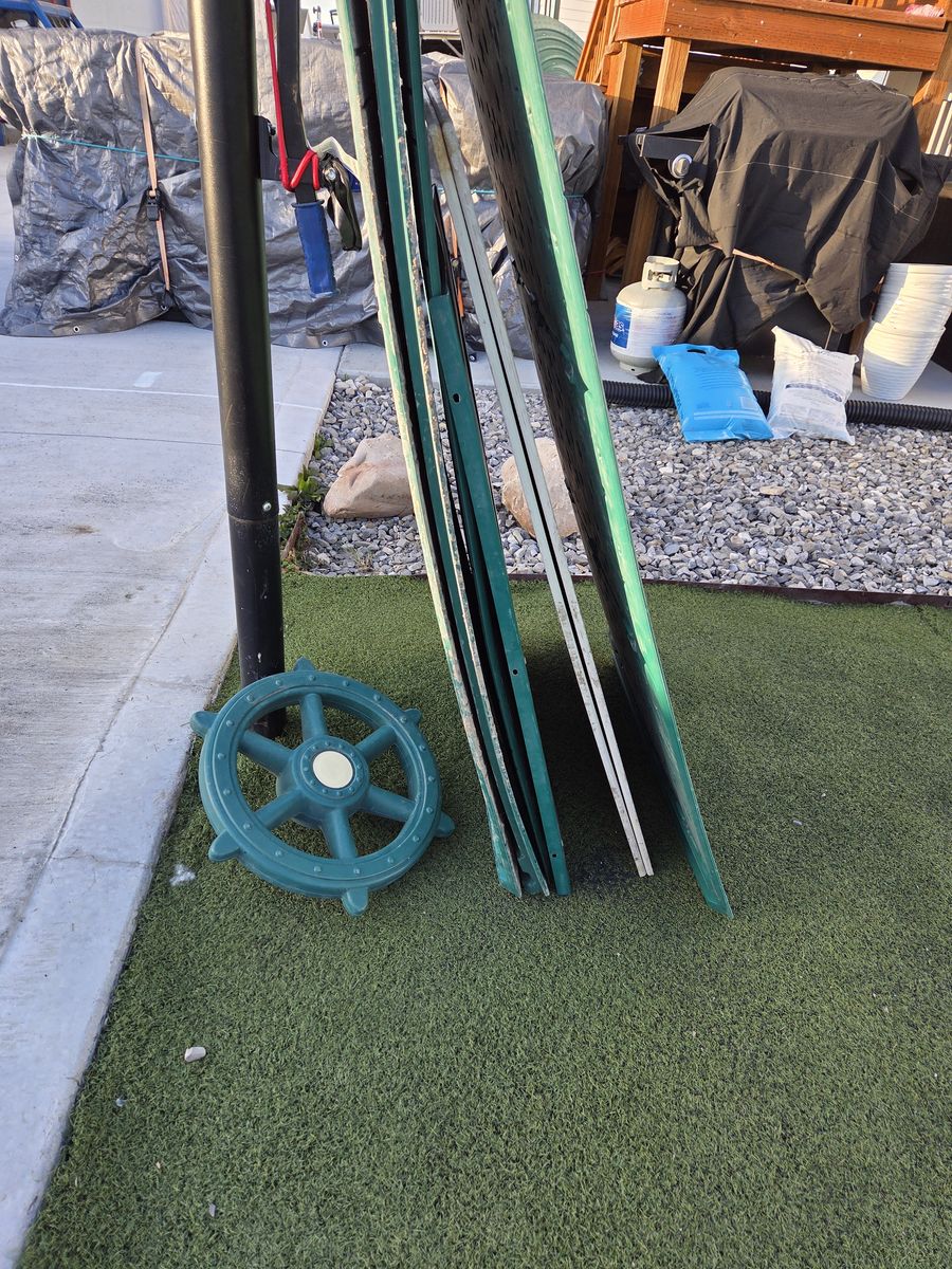Well loved with lots of life left. Has some rust. We have replaced a few parts like the slide and a few swings so the colors are different (green instead of yellow). We also have a green replacement roof, steering wheel and some extra panels if you want you are more than welcome to take them as well as the original parts. Cash only please!