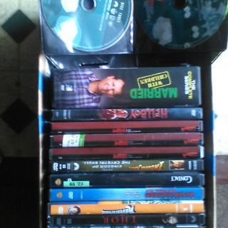 LIST WITH REPLACED CASES, 12 DISCS, SEE MAIN PIC BOTTOM ROW: Adventureland unrated, Blade Runner: The Final Cut 2-disc, Contact, Hellboy 1 & 2 (6-disc with multiple case artwork), Indiana Crystal Skull, Star Trek 1 Abrams 2-disc reboot, Thor 1. LOOSE DISCS, 10: Dodgeball, Gremlins 1, The Hobbit Jackson 2-disc reboot, Rain Man, South Park Season 3 3-disc, World War Z.