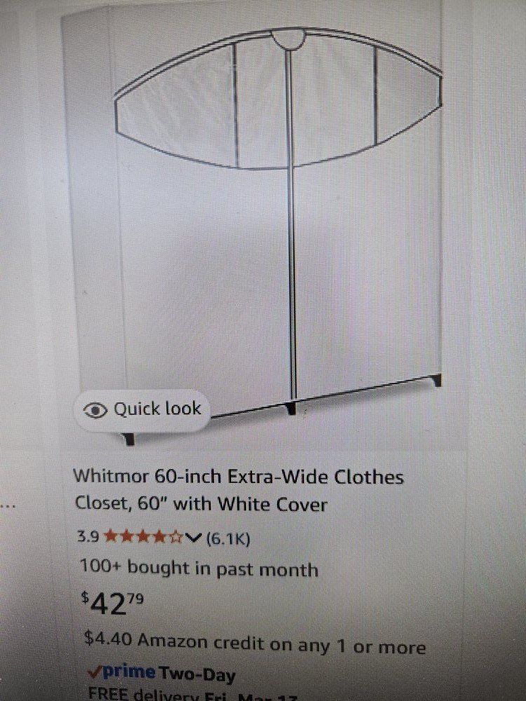 Venmo60" Portable clothes closet wardrobe with cover. I bought this to put clothes in while remodeling. It is in perfect condition. No tears and comes from smoke free hone.