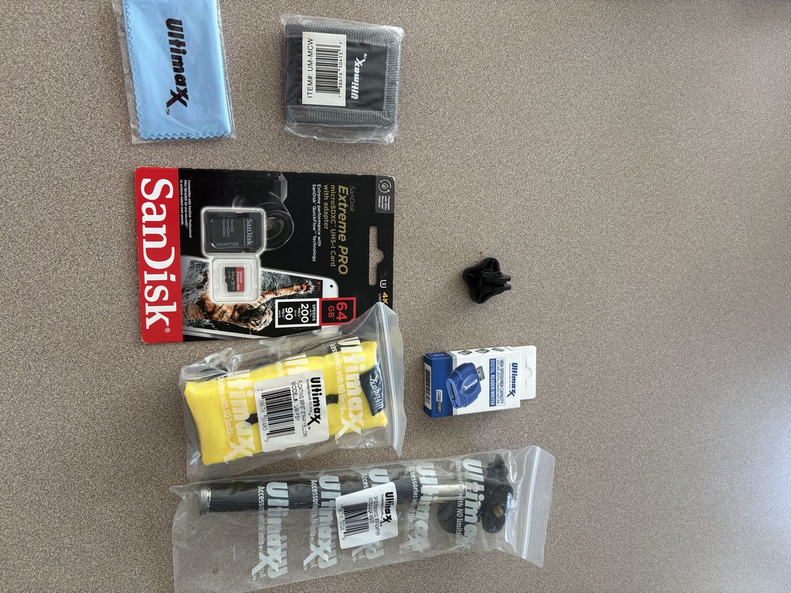 PayPalAwesome Go Pro camera accessories bundle! Got a bunch of new Ultimaxx gear, still in packaging. Comes with a SanDisk Extreme PRO 64GB microSDXC card and adapter, an Ultimaxx floating hand strap, a chest strap, a GP floaty bobber, a tripod/monopod adapter, a digital reader/writer, a wrist strap, a cleaning cloth, and a small camera bag. All new, never used.