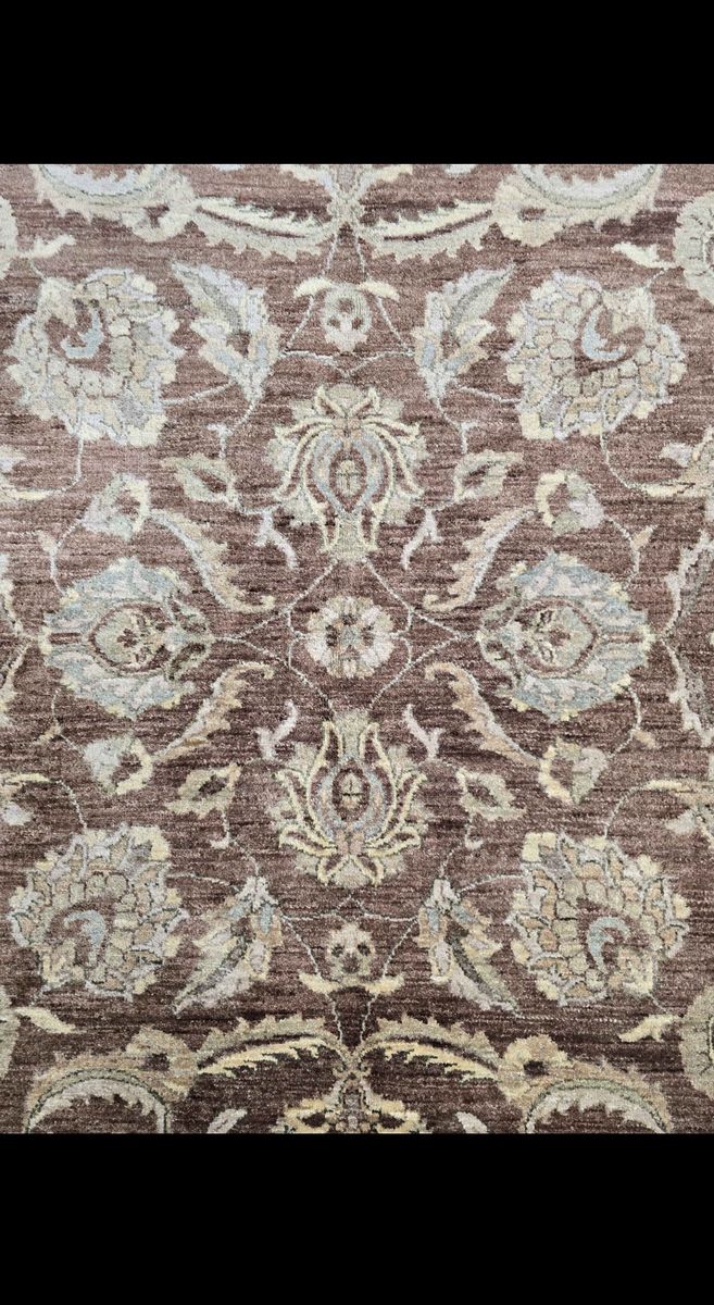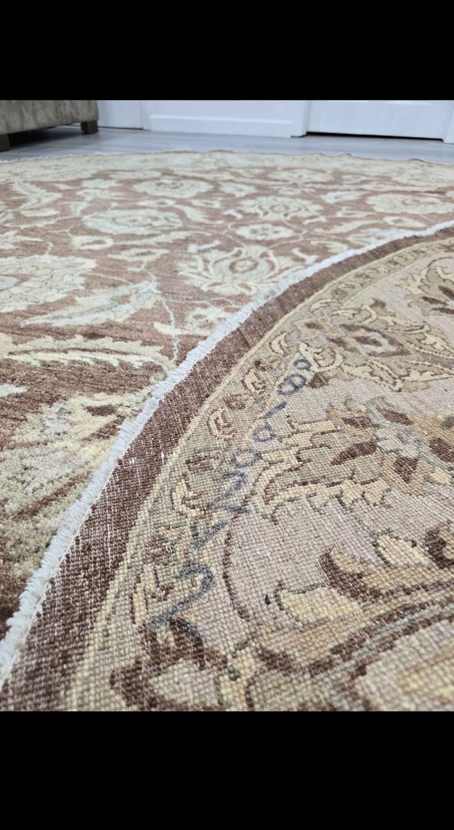 ZelleRound rug featuring a warm brown field layered with floral patterns in beige/tan, sage, and hints of light blue. The gently distressed look adds texture and character. The earthy palette pairs beautifully with warm neutrals, creams, muted blues, and soft greens.