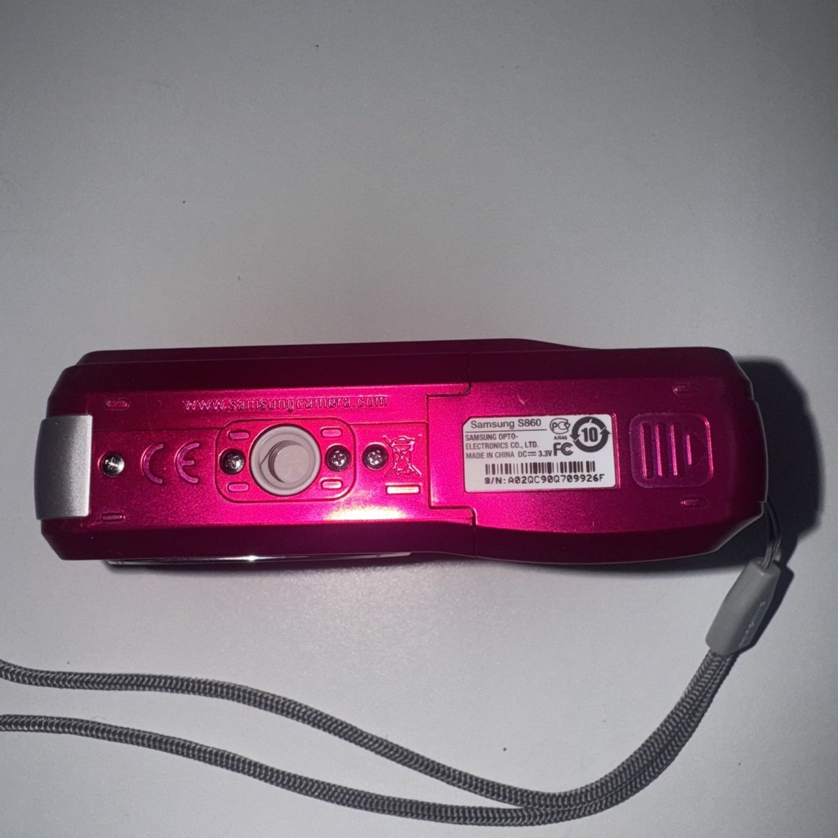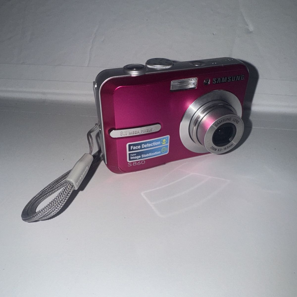 This vintage working pink Samsung S860 Digimax digital camera features 8.1 MP maximum resolution, a compact design, and face detection capabilities. The camera is easy to use with USB connectivity and a built-in flash for capturing quality photos. Powered by AA batteries, this camera does not require a charger for convenience. Perfect for photography enthusiasts looking for a stylish and functional digital camera from a trusted brand like Samsung.