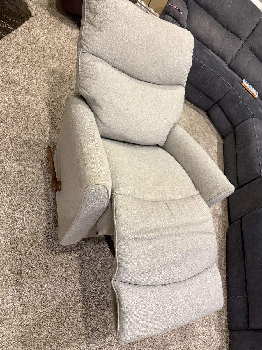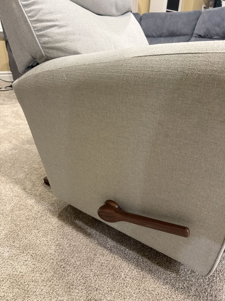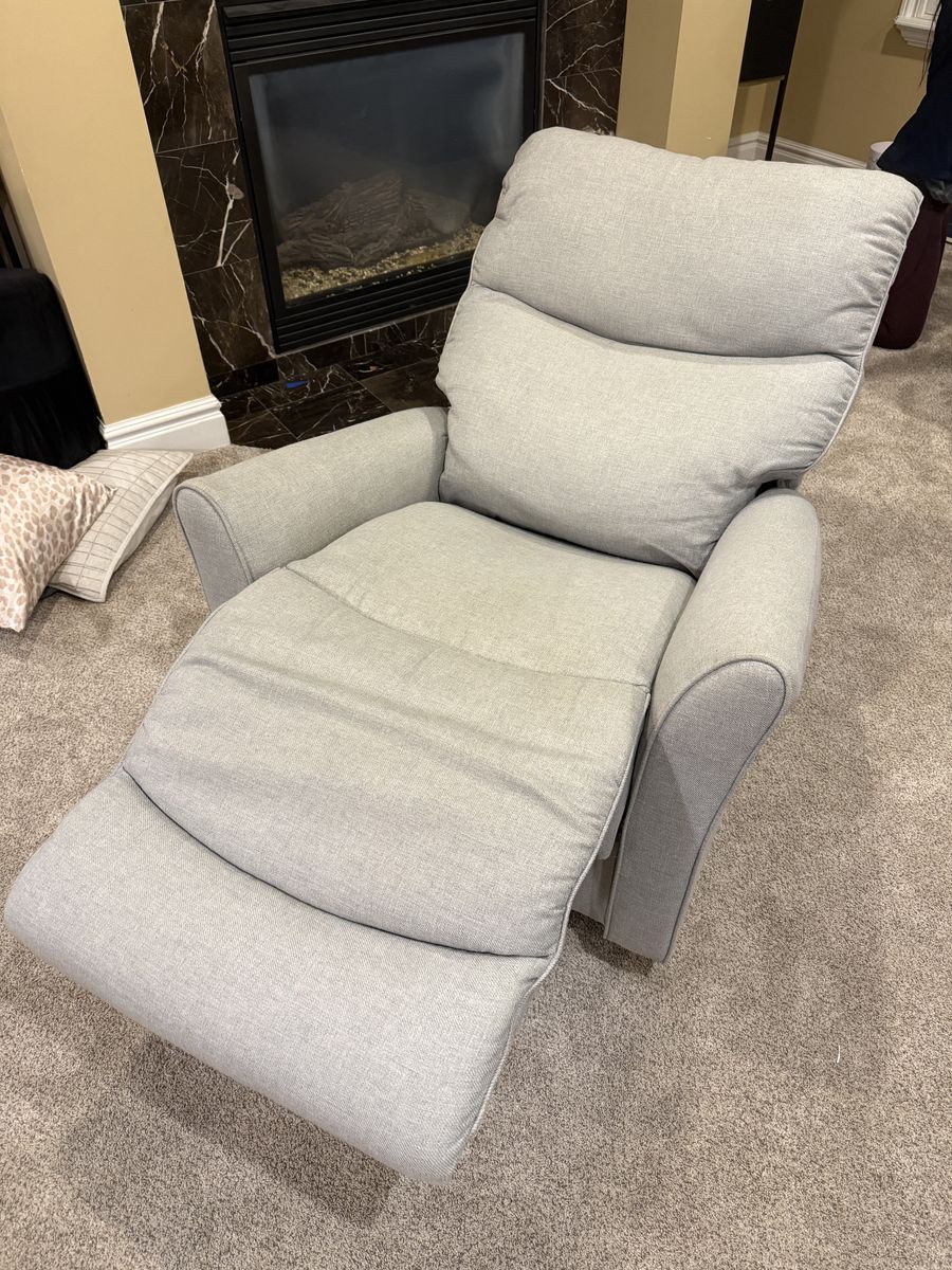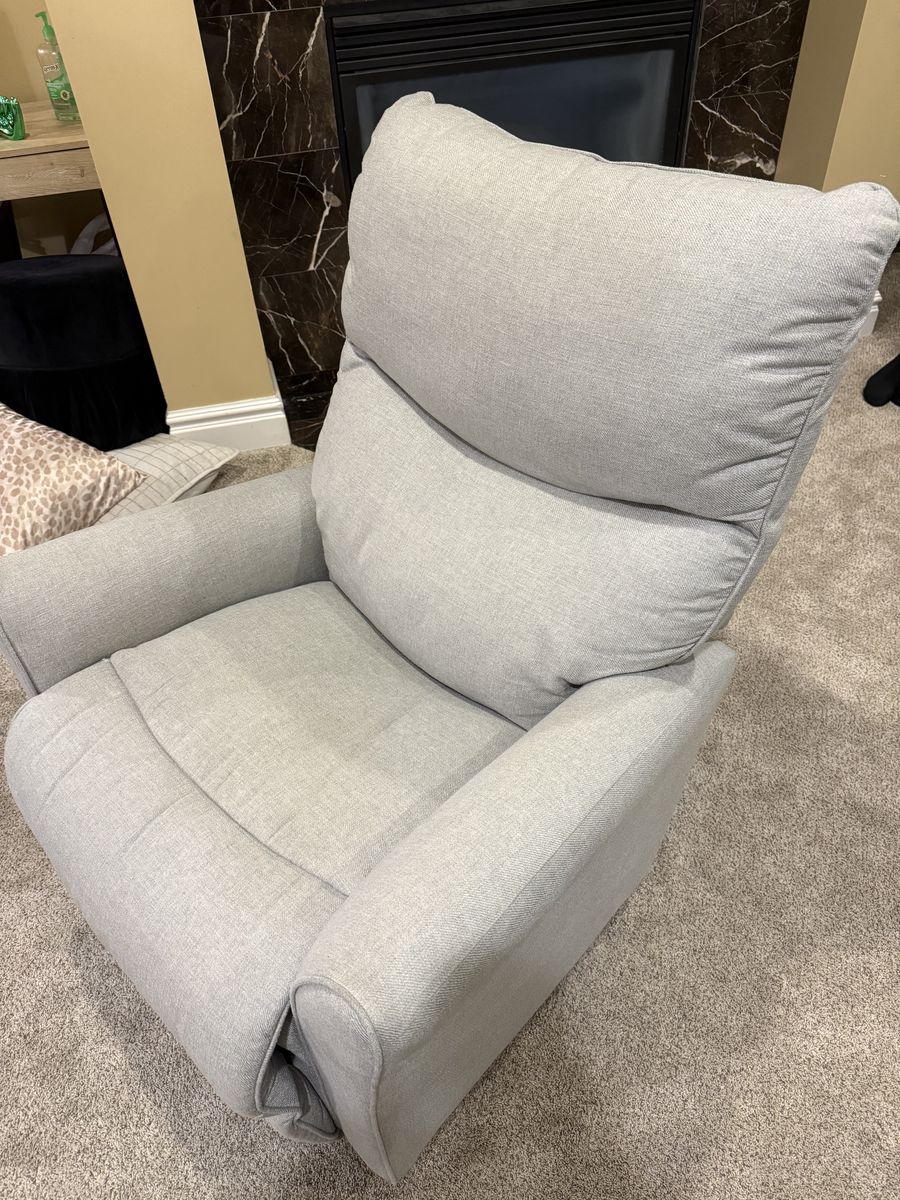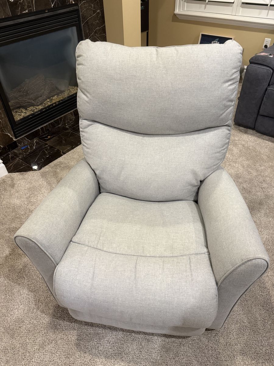 Gray rocker manual recliner. Had for about 5 years only used minimally in a baby nursery. Smaller recliner about 32” x 32” when upright.