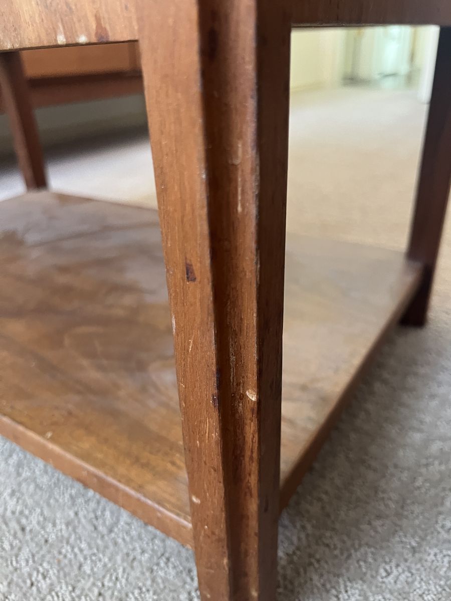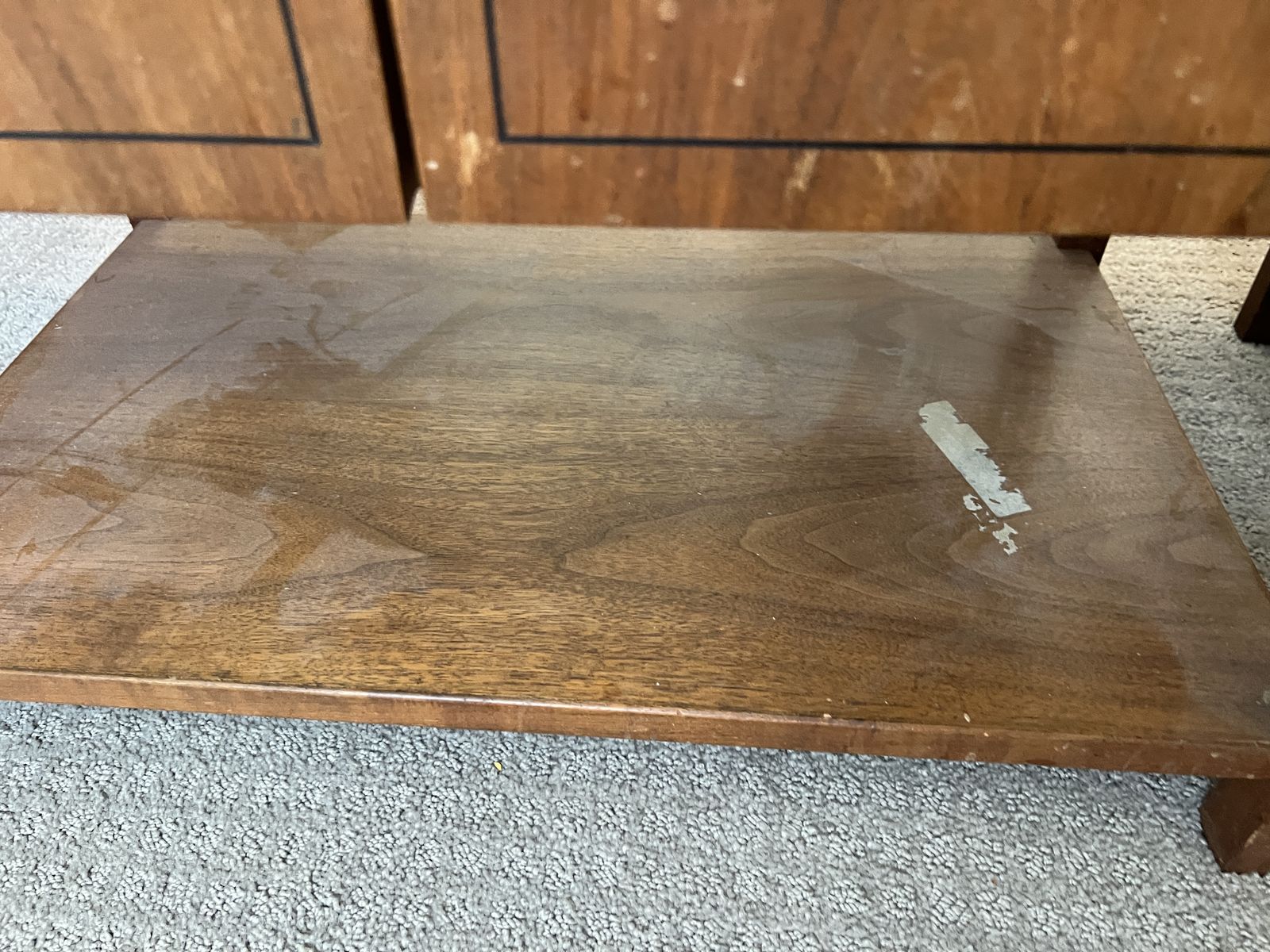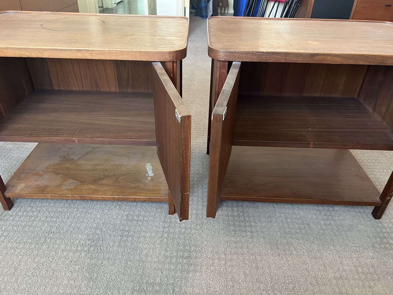VenmoThese are most likely Jack Cartwright bedside tables for Founders. (There are other Jack Cartwright pieces in the house that seem to coordinate). The top has a rim around it. The doors are inlaid with a darker color and there is an open shelf under the cupboard section. They have some condition issues shown in the photos and that is reflected in the price. They are still in sound, sturdy, working order. 26 wide 16 deep 22.5 tall Pick up in Herriman. From pet and smoke free home. Cash or Venmo. $400. listed for a client