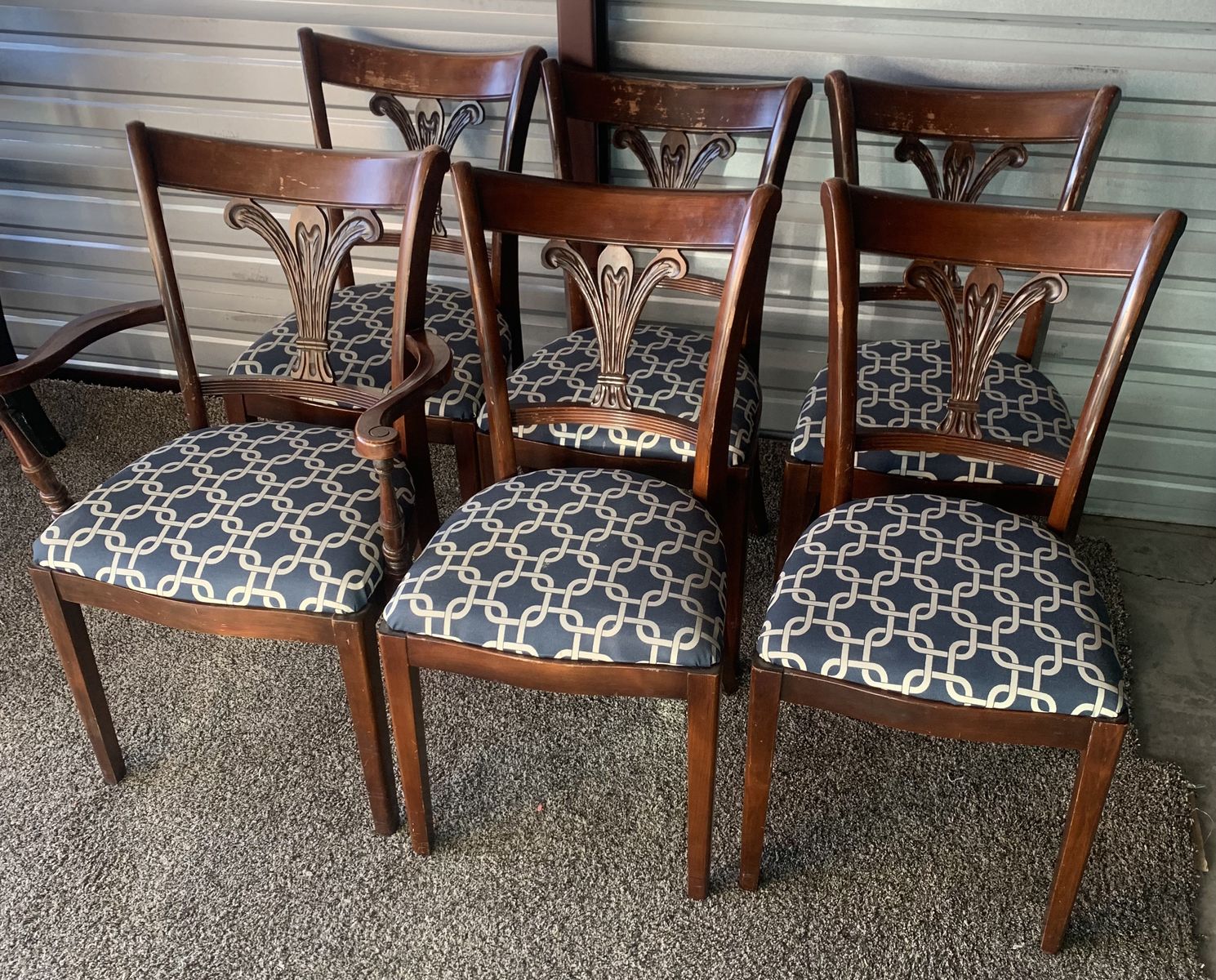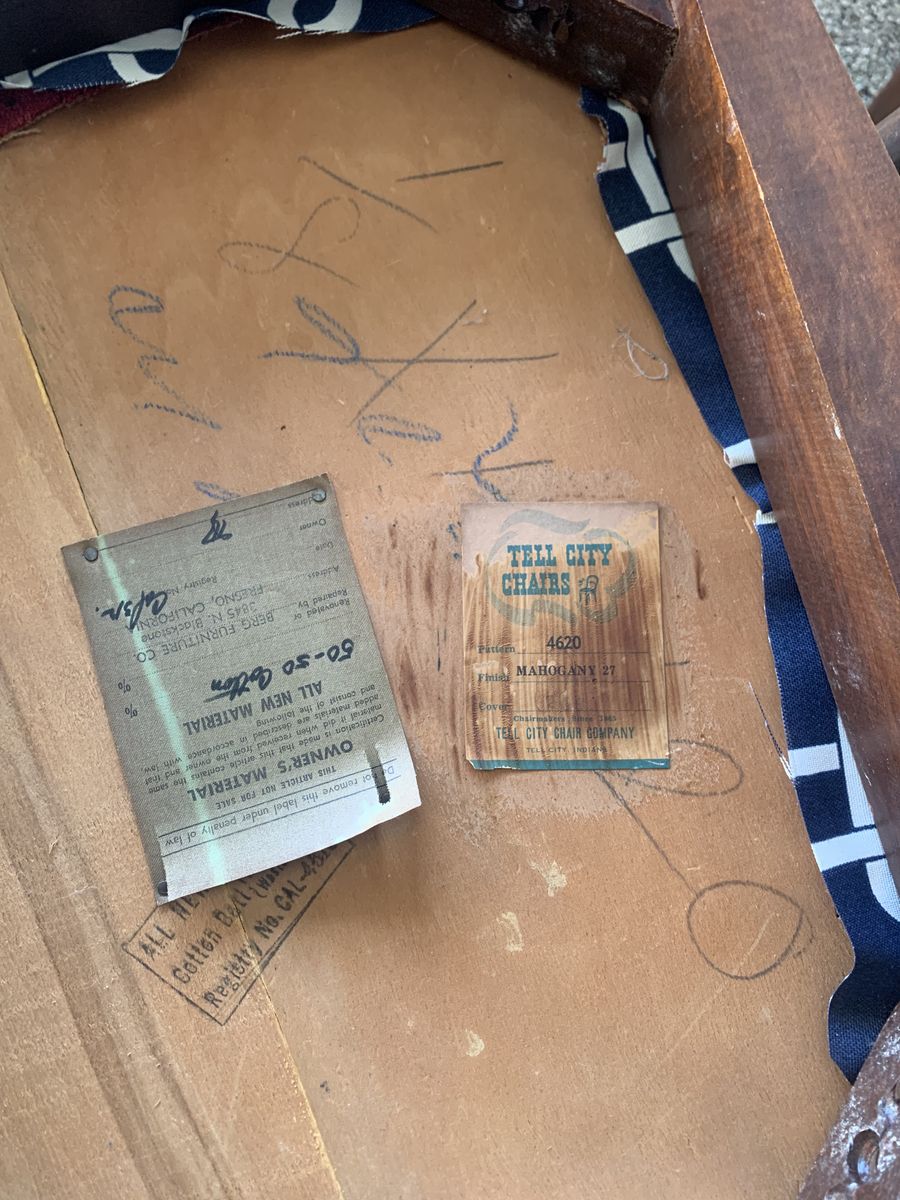 Venmo6 Tell City Mahogany Side Chairs. These are in the very rare FLUER DE LUER BACK Style Chairs. They have the Tell City Label Showing #4620 and Finished in the Mahogany 27. These chairs are in very good condition with normal wear from age and use. Finish still looks great but you will see a blemish here and there. Very minor scratches here or there, all normal for age and use. I think they are well worth the price and you wont be disappointed. The seats are all clean and no stains. I have the table that came with the set, if interested let me know. I usually sell separate