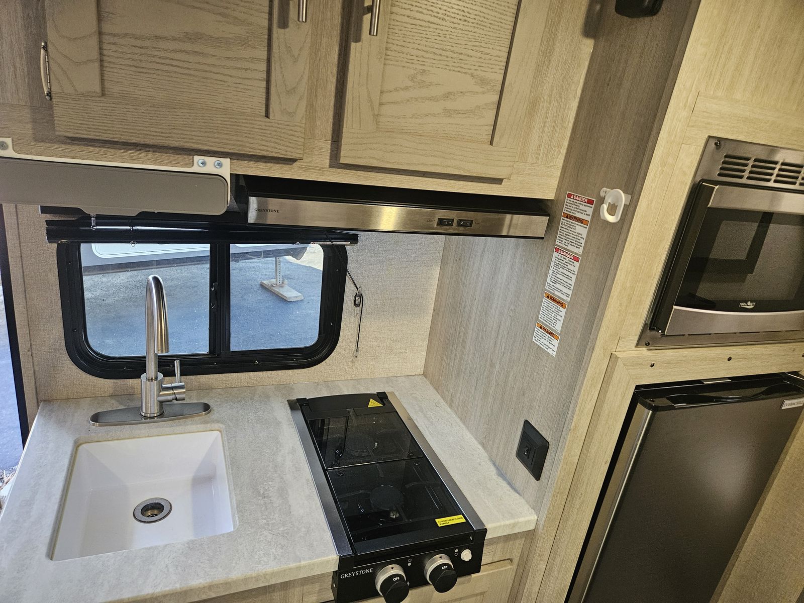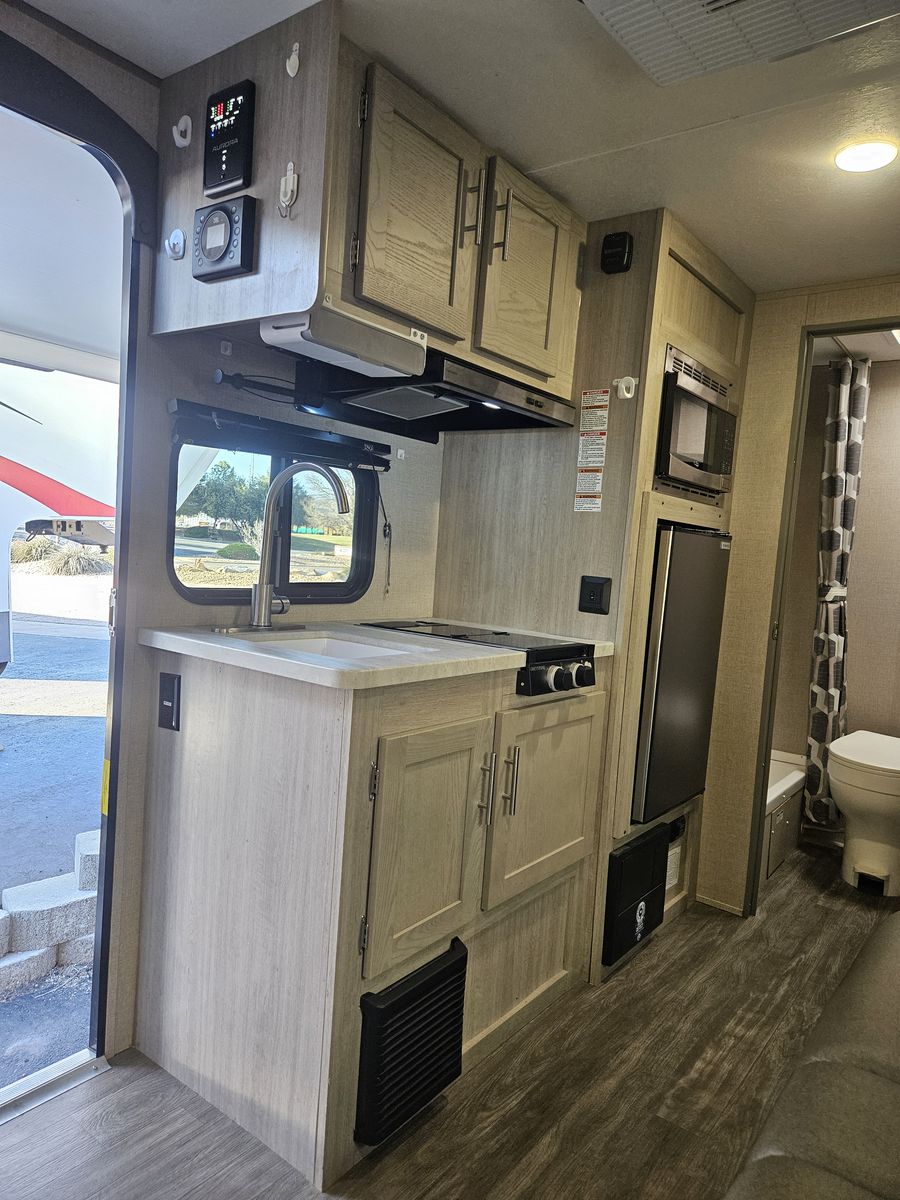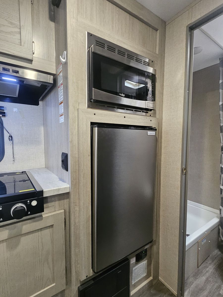 Kitchen with 3.0 cu ft Fridge, 2 Burner Cooktop with Range, Microwave, and Sink!