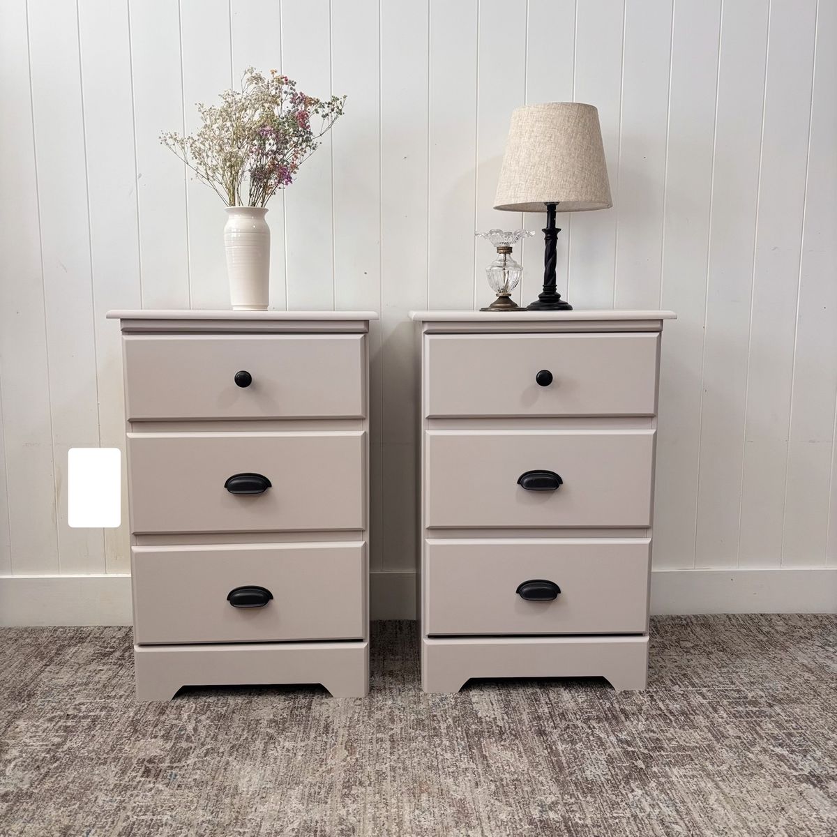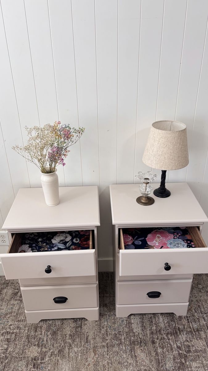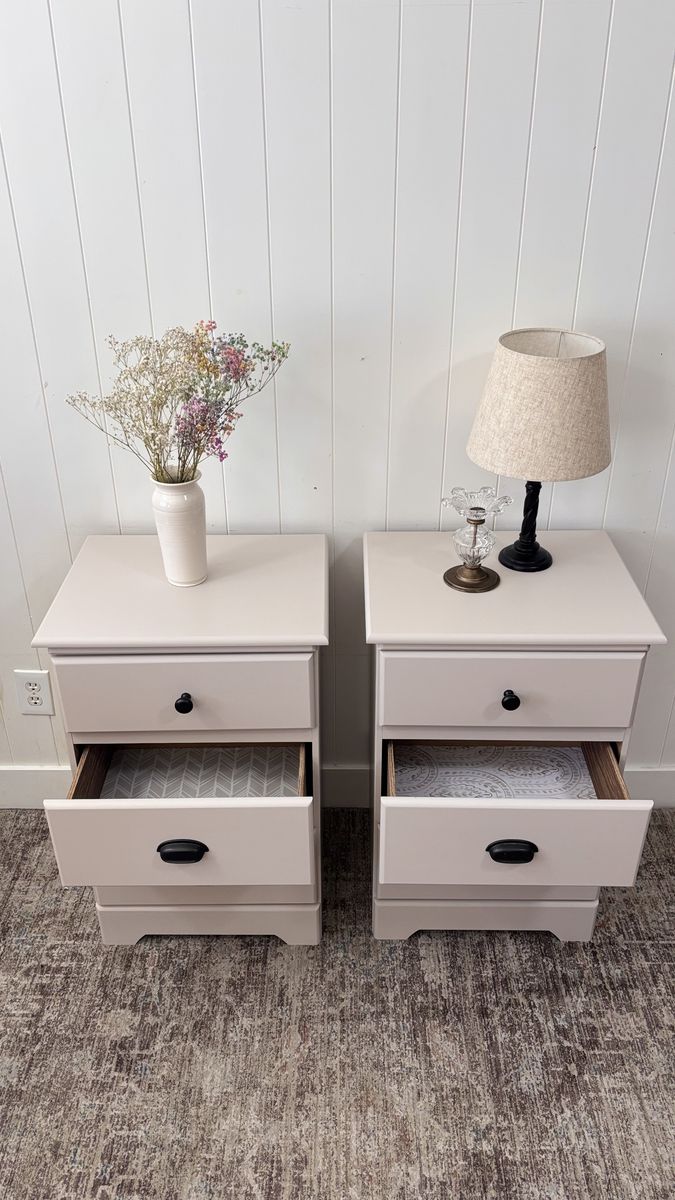 Beautiful neutral nightstands with dark hardware for a timeless, versatile look.