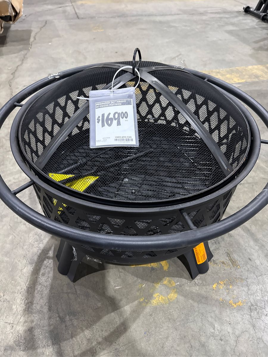 The Piedmont fire pit from Hampton Bay features a two-in-one design ideal for outdoor heating or grilling. Its unique features include a cooking grate for convenient grilling, a mesh screen for safety, and a poker. The deep bowl design offers plenty of room for firewood and a 360° view of the fire. Durable steel construction for strength and durability. 12 in. deep bowl is coated with high temperature paint for longer life. Includes rotating cooking grid for barbequing. Safety ring surrounds the pit and doubles as a handle. Mesh cover to help reduce the number of escaping sparks. Assembly Required: Yes. Color Family: Black. Color/Finish: Black. Features: 360 Fire View. Fire Pit Shape: Round. Housing Material: Steel. Outdoor Living Product Type: Fire Pit. Power/Fuel Type: Wood. Product Weight (lb.): 22 lb. Style: Classic, Cottage, Farmhouse. Assembled Depth (in.): 29.60 in. Assembled Height (in.): 23.00 in. Assembled Width (in.): 29.6 in. Bowl Depth (in.): 12.01. Bowl Length (in.): 24.41. Bowl Width (in.): 24.41.