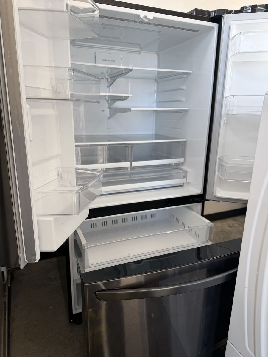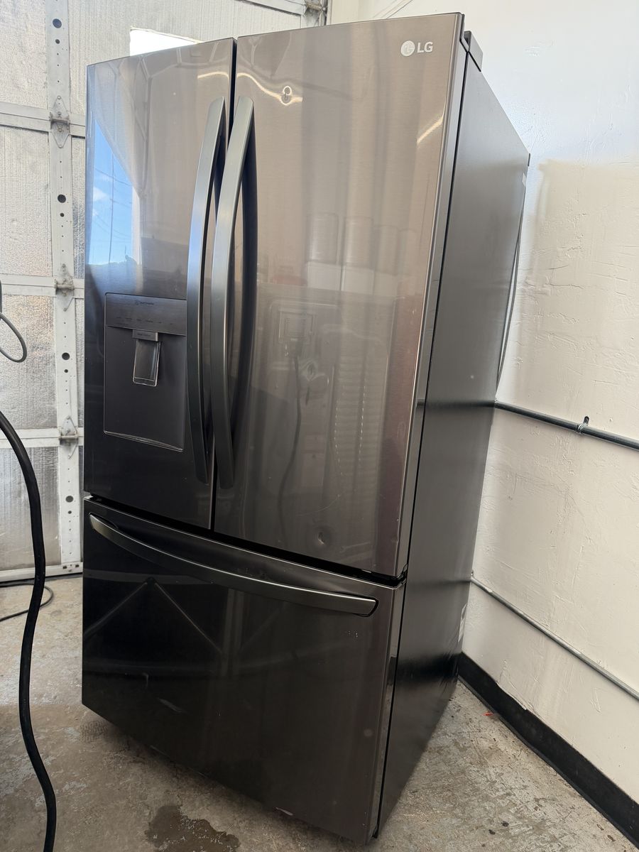 Beautiful LG black stainless steel refrigerator with French doors, bottom freezer, and water dispenser. Clean and working perfectly. Hermoso refrigerador LG black stainless de puertas francesas, congelador abajo y dispensador de agua. Limpio y funcionando perfectamente.