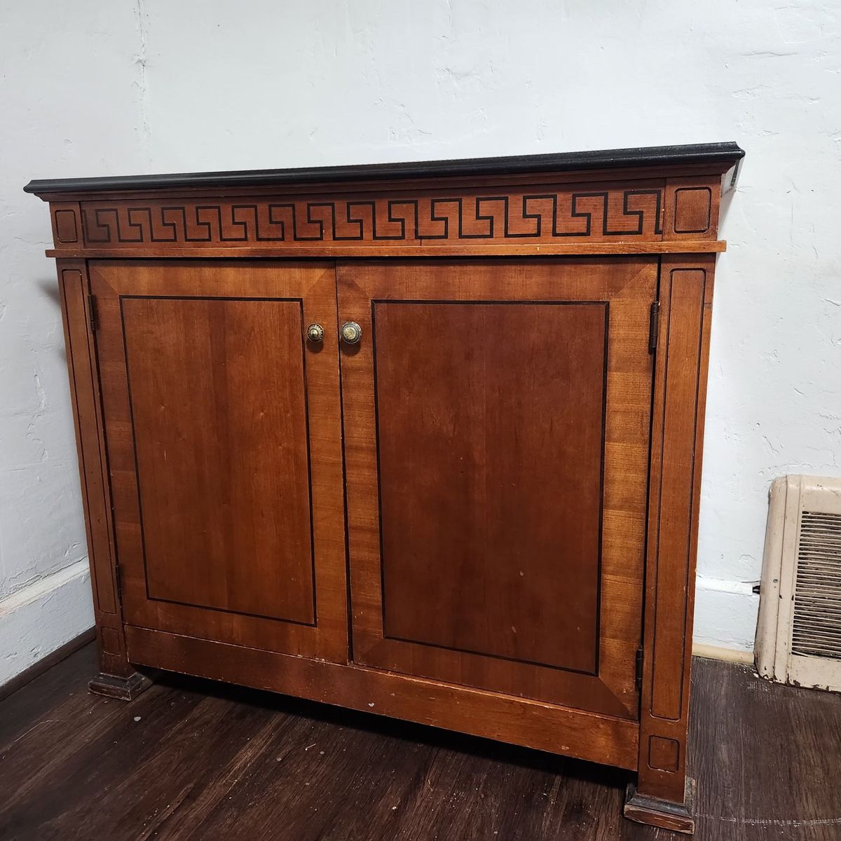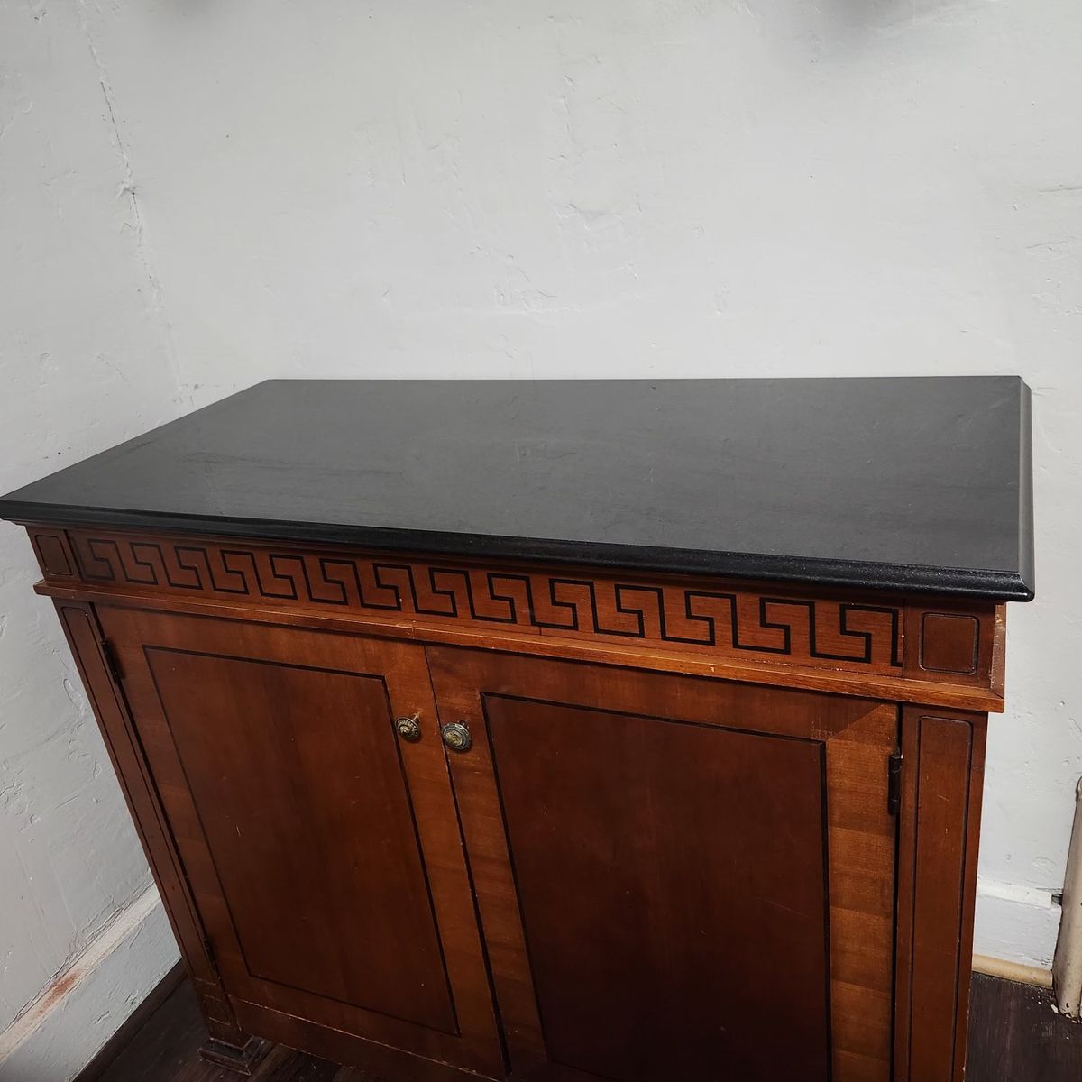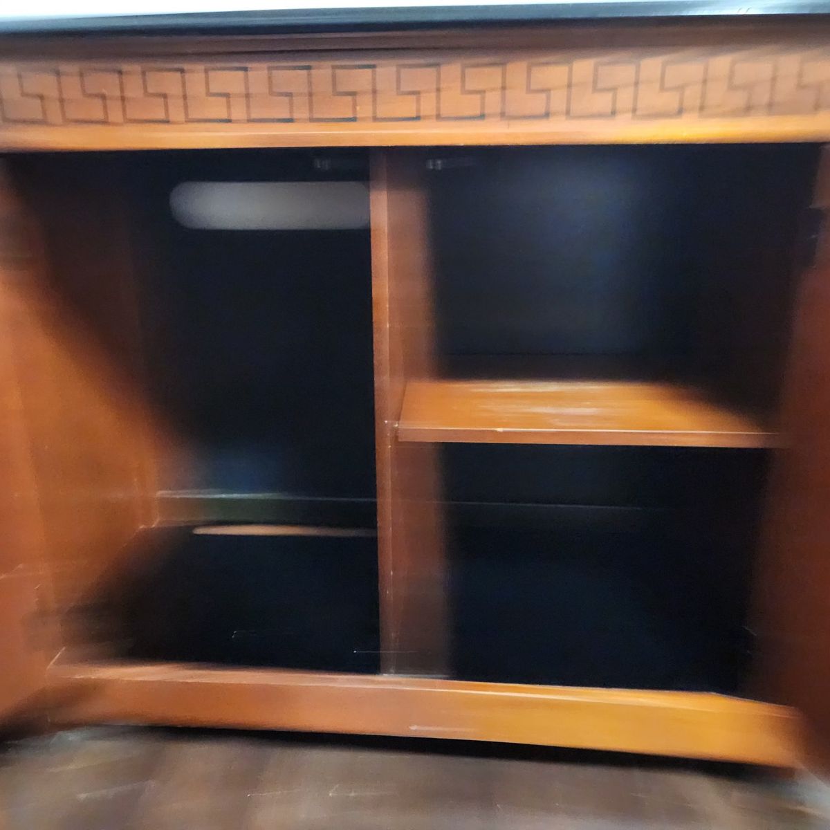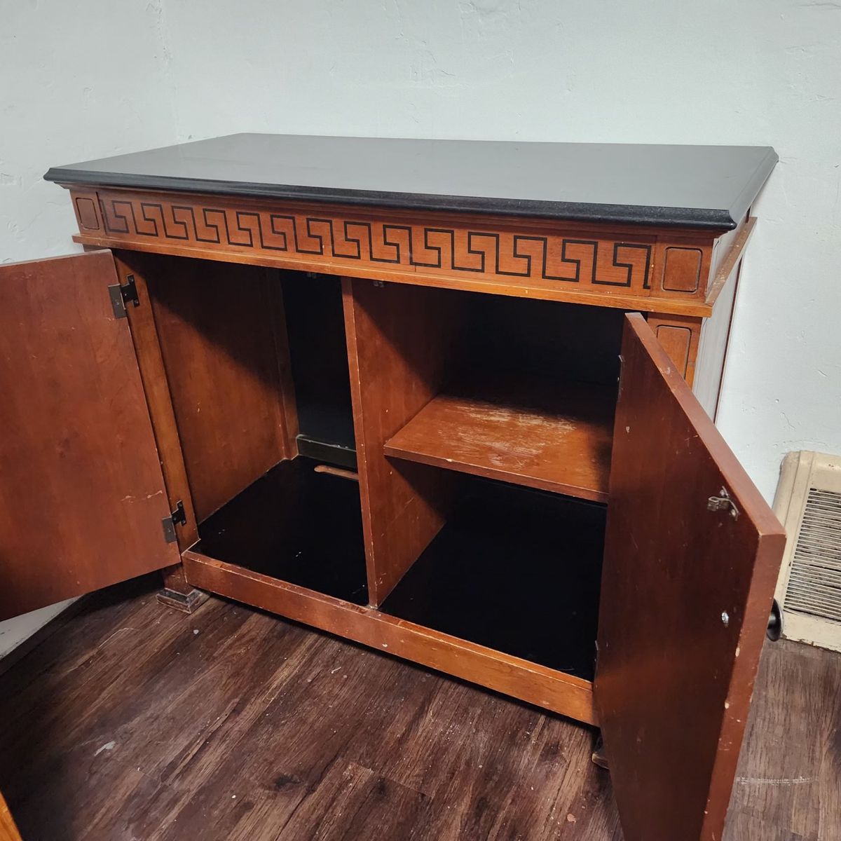 Cupboard stone counter top. great addition for apartments. Midnight blue stone counter top color. No scratches on the stone. In good condition and extremely sturdy. Has a spot for a mini fridge but I just used it for my food storage. It was missing one handle when I got it so I just replaced it with something I already had. The handles don't match. Had it for 5 years and loved it. I moved and dont have room for it.