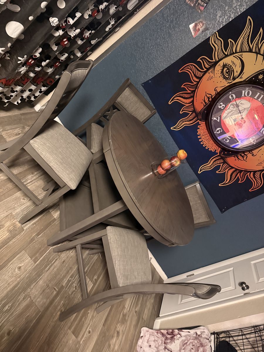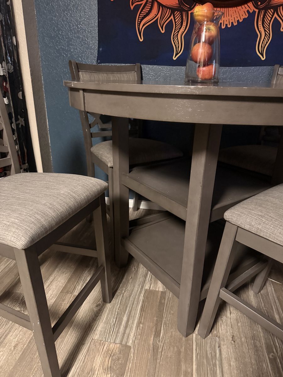 Beautiful only been set at once table with cubby space four beautiful bar chairs beautiful condition first come first serve. Let me know if you’re interested.