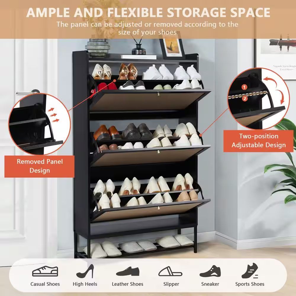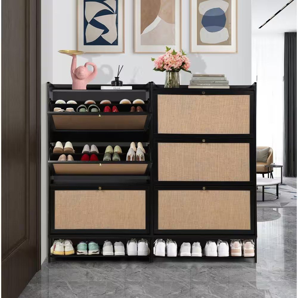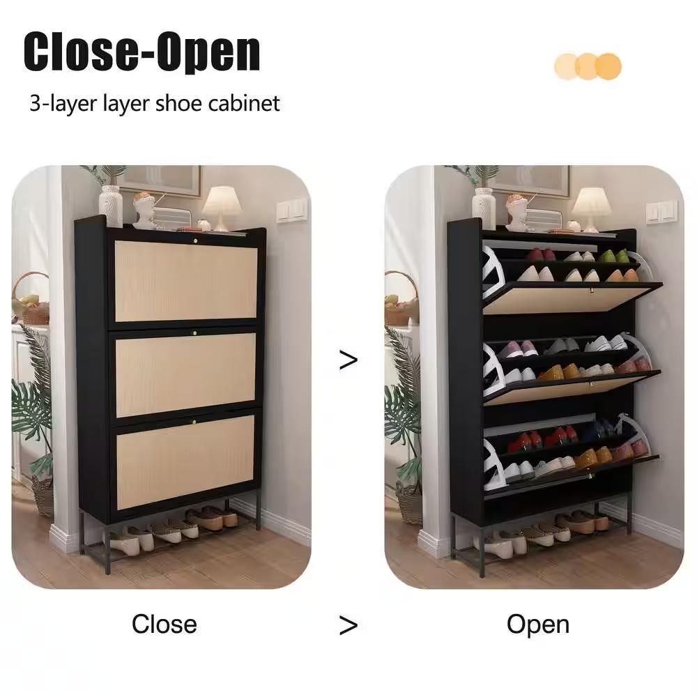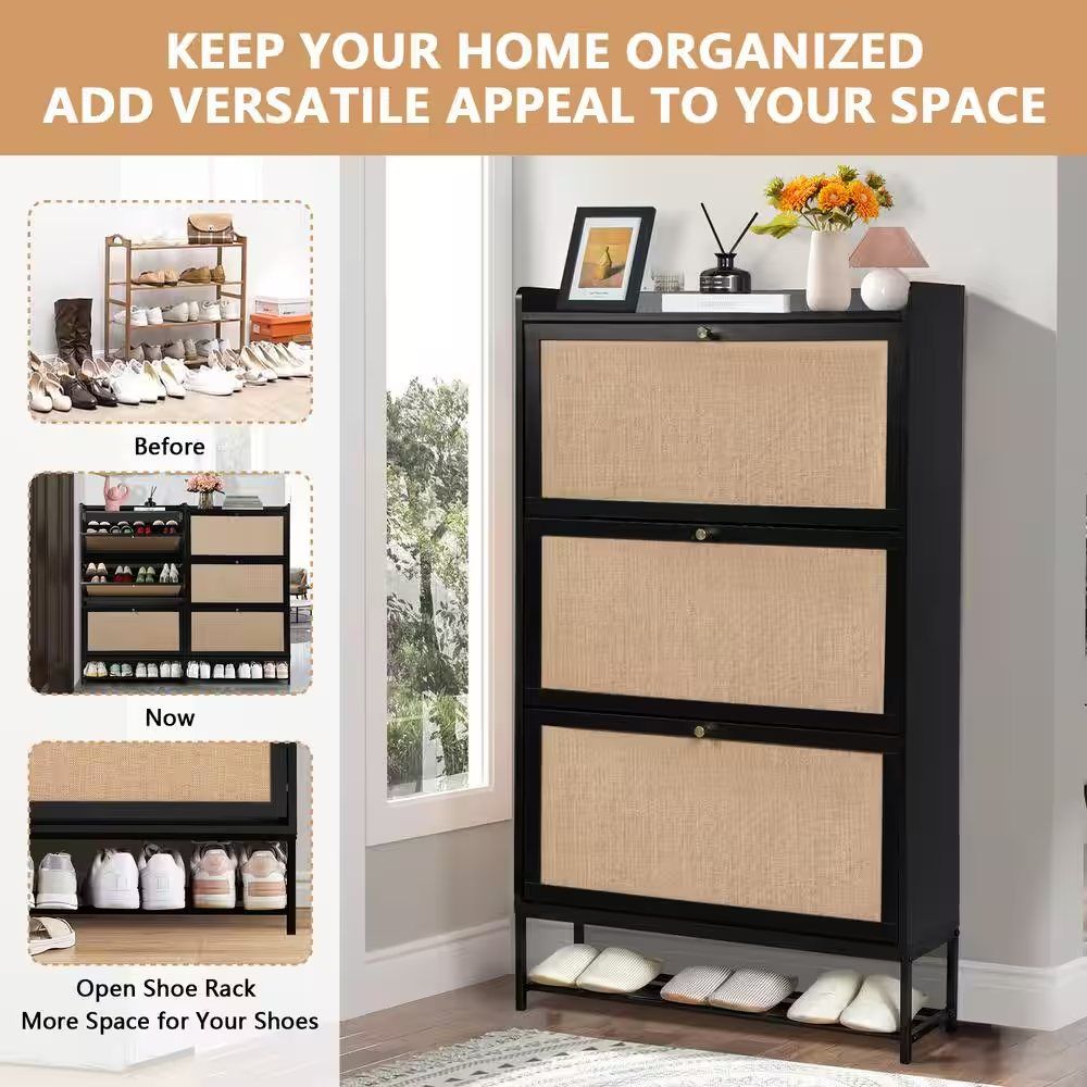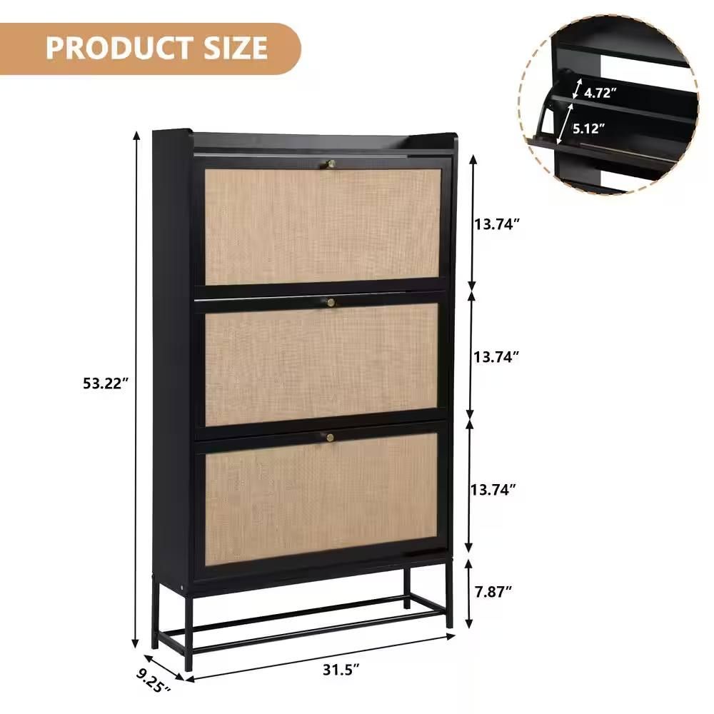 The free-standing flip-up 3-drawer storage shoe cabinet has a simple and durable surface made of natural linen. The overall storage space is very sufficient, the main 3-large drawers have internal dividers to adjust the space according to the shoe size, the desktop at the top of the cabinet can hold daily items; the metal shoe rack at the bottom can hold frequently worn shoes. The shoe cabinet is mainly available in 3-colors: natural, black and walnut, which not only allows for shoe storage, but also decorates your space well.. Assembly Required: Yes. Color Family: Black. Color/Finish: Black. Included: Shelves. Material: Wood. Number of Compartments: 6. Returnable: 90-Day. Storage Product Type: Shoe Storage. Assembled Depth (in.): 9.25 in. Assembled Height (in.): 31.5 in. Assembled Width (in.): 53.22 in. Assembled Width (in.): 53.22 in. Assembled Height (in.): 31.5 in. Material: Wood. Assembled Depth (in.): 9.25 in. Product Type: Shoe Storage