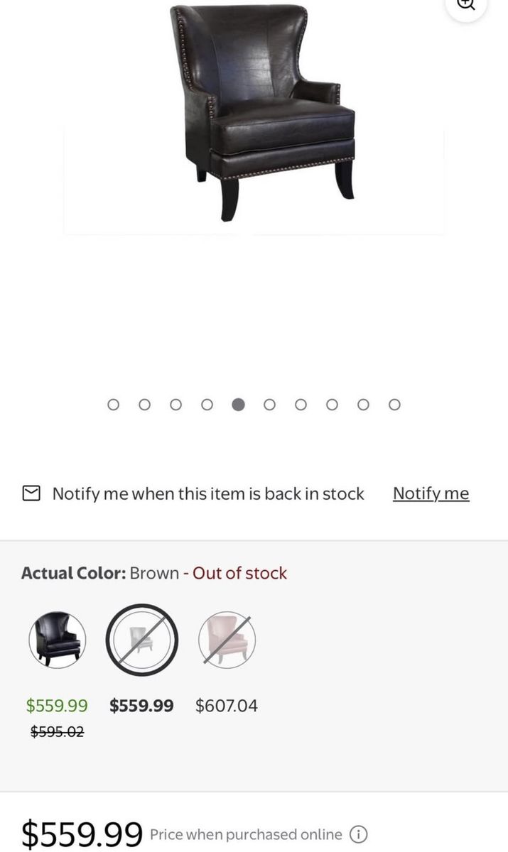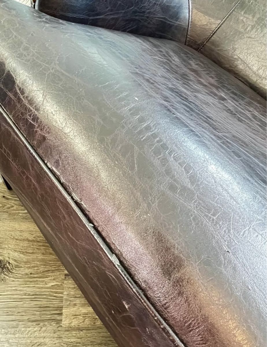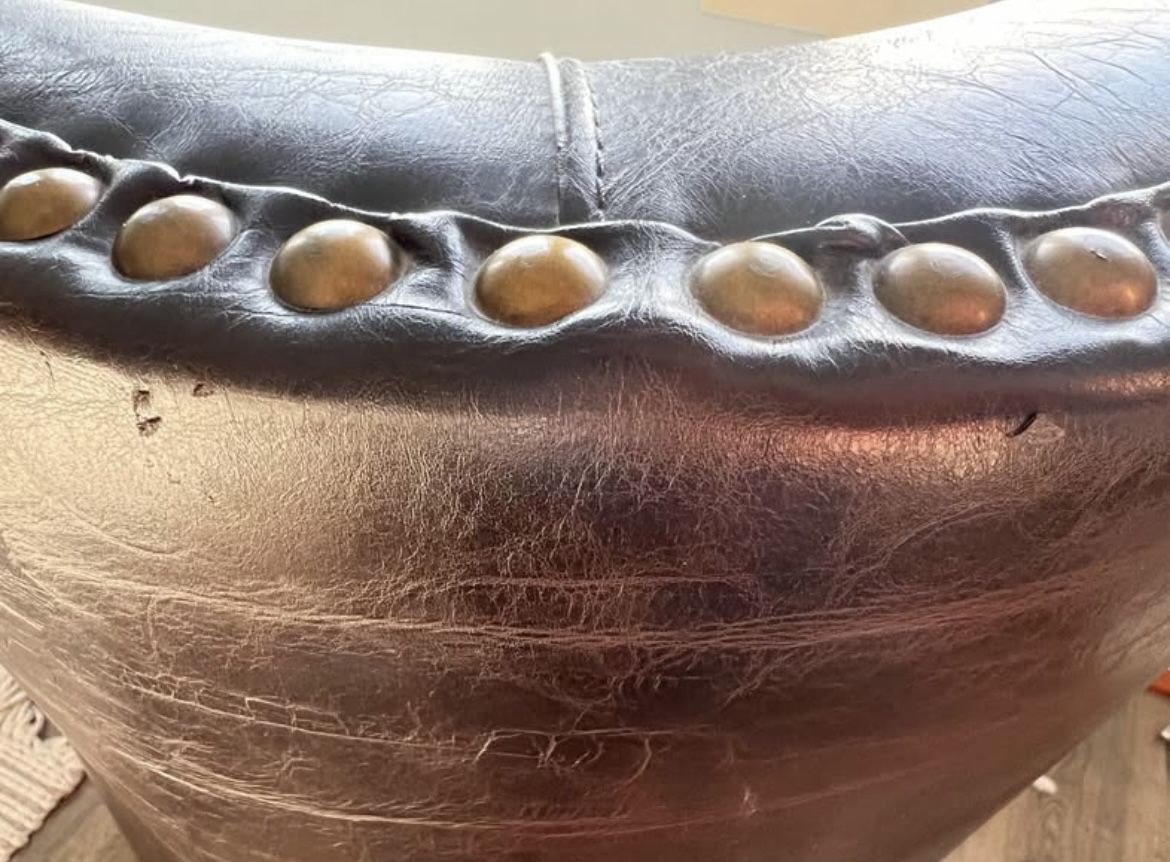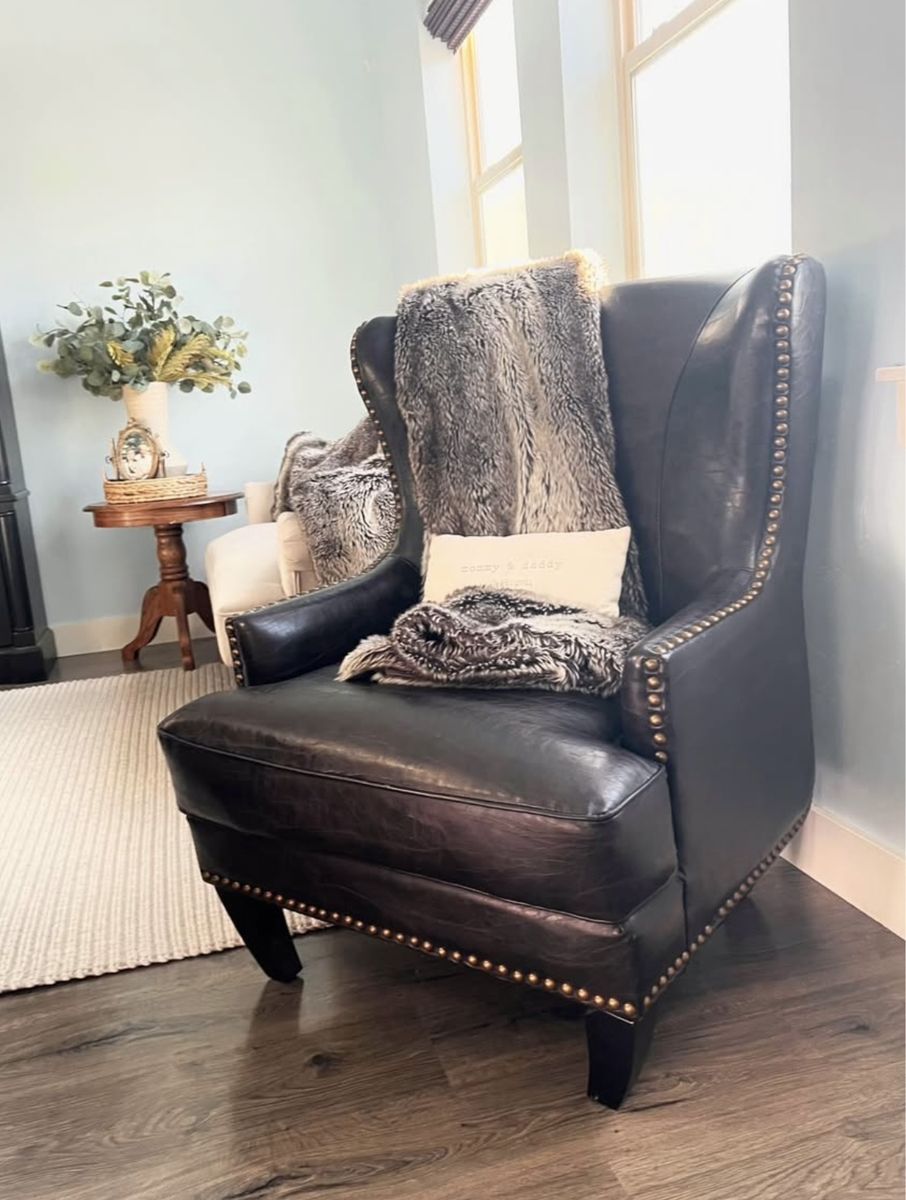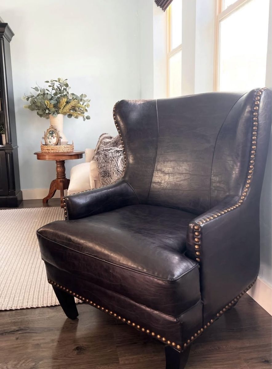 Genuine crackle leather look. Wingback design with bronze nailhead trim. Solid wood legs. Beautiful and neutral dark brown espresso color that works with many styles. Very comfortable and supportive