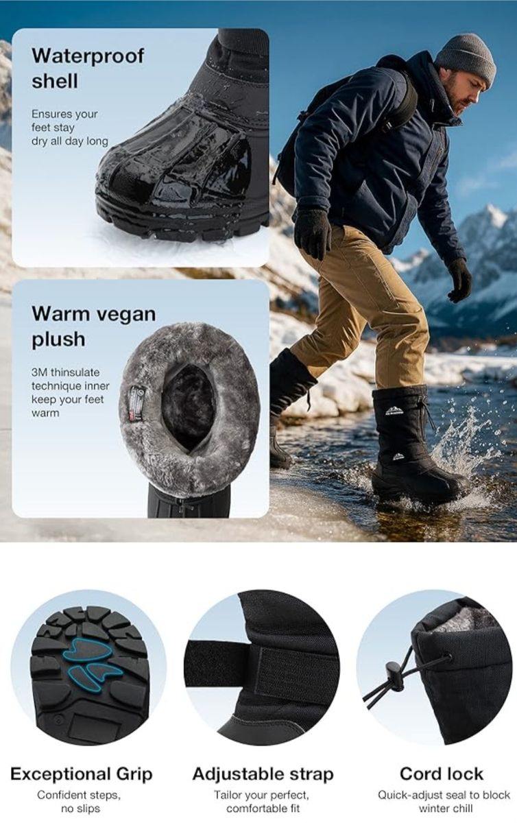 COMFORT AND WARMTH: Cushioned footbed for supportive comfort. All-cold weather protection and a toasty layer of insulation. FIT AND EASIER ENTRY: Easy pull on with both a drawstring and ankle velcro strap. WATERPROOF CONSTRUCTION: Seam-sealed, waterproof outsole keeps feet dry in wet conditions. Perfect for all outdoor winter activities. KEEP OUT THE ELEMENTS: Stomp around town even when the rain and cold tries to slow you down with ALEADER winter boots. OCCASIONS: When the cold weather is coming, it will be a choice for wearing our snow boots in snowy or wet condition for easy walking, crossing the stream in the cold winter or daily work.
