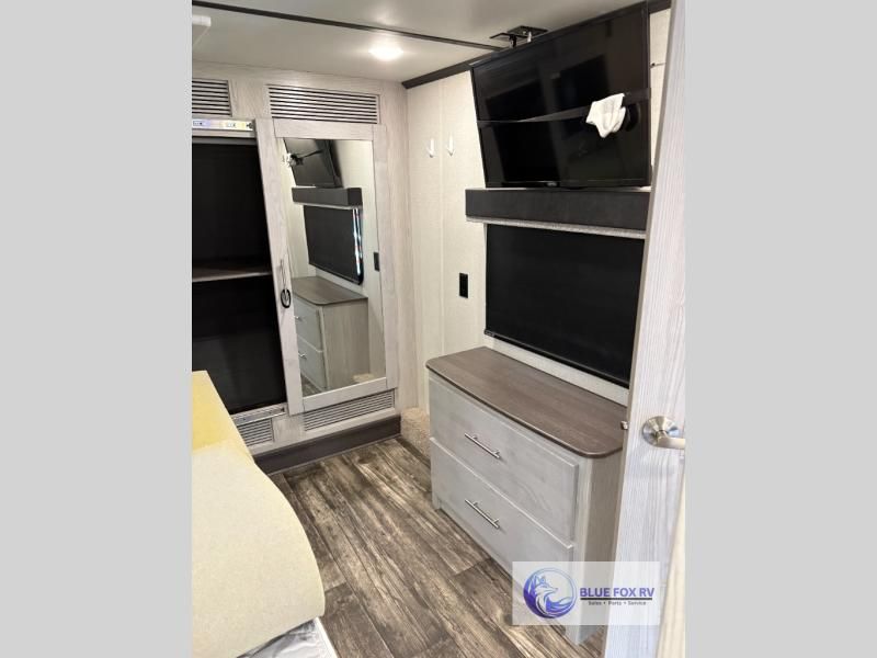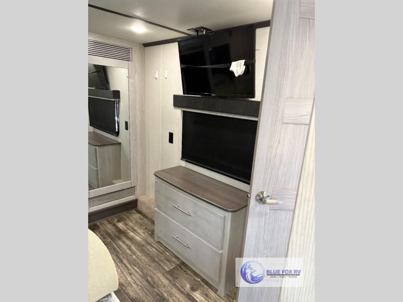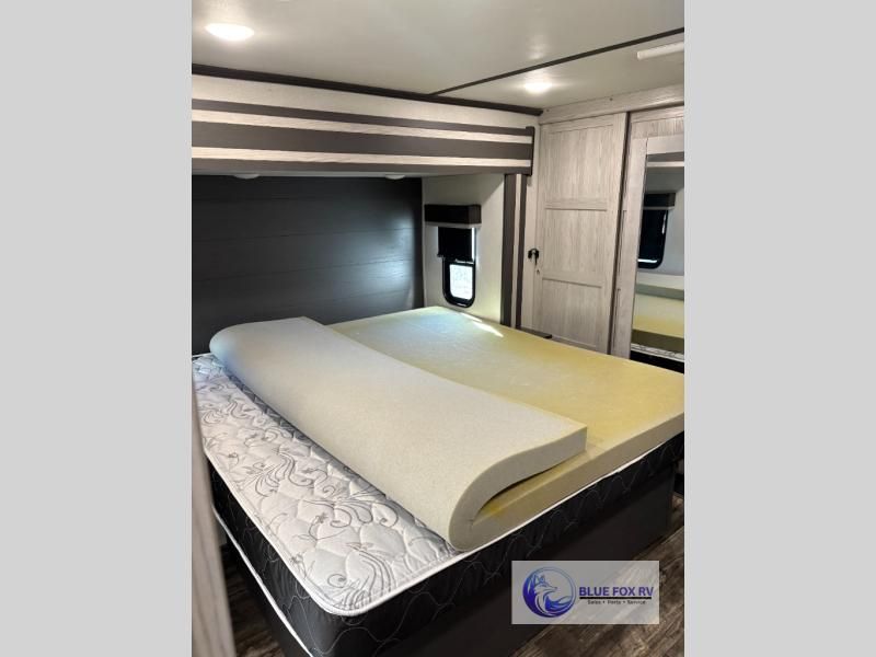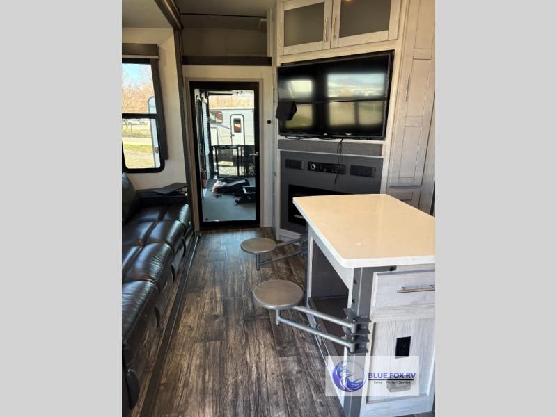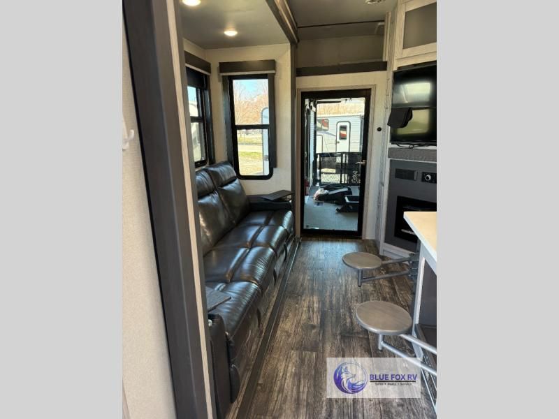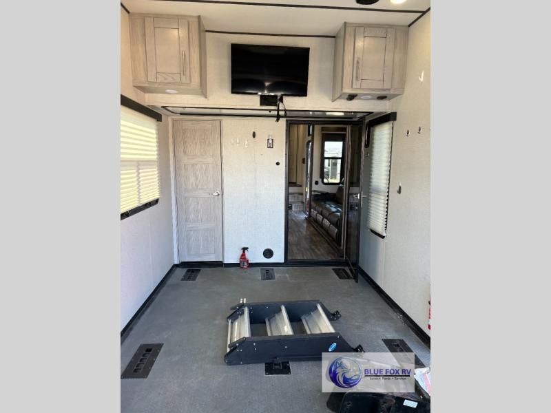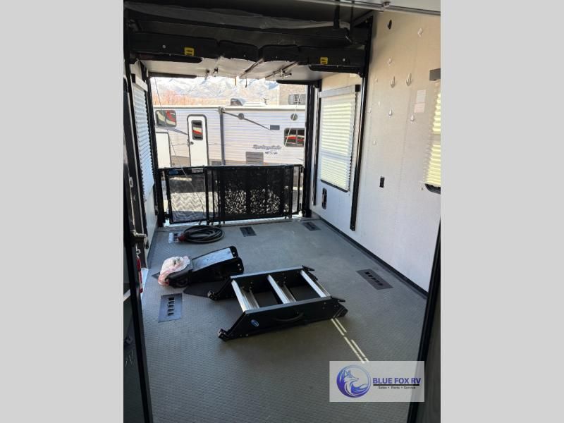 How does a bath and a half, triple slides, plus a 15' garage sound in this toy hauler? The 8' ramp door will make unloading a breeze, and the dual entry doors will create a smooth flow of traffic. The kids or your guests are sure to love the loft with a bunk mat, and you will feel right at home in the front master bedroom. Everyone can gather in the main living area to play a game of cards at the table with swing out stools, or watch a show on the large sofa. There is an LED TV here and a fireplace, plus two pantries for snacks galore!