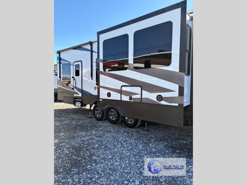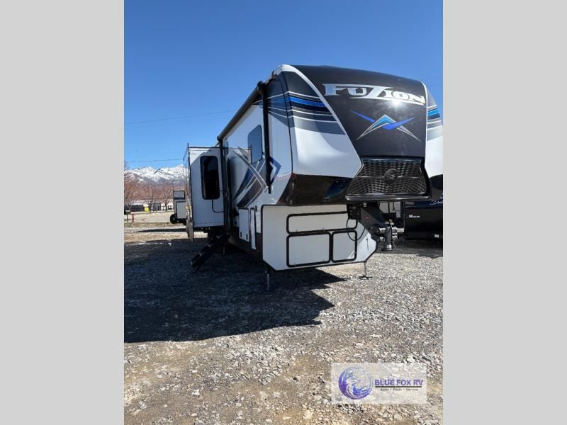 Seek new thrills and see new sights in a Fuzion toy hauler fifth wheel by Keystone. A few of the advantages you'll find with these models are Adjust-A-Track frame-welded tie-downs, Tru-fit slide construction, 12V color-coded wiring, plus much more. The Max Turn technology makes turning and parking easier than ever, and the MORryde CRE 3000 suspension will provide smooth towing to the campground. You will stay comfortable year around with the in-floor heating ducts and the Blade high performance air flow system that gives 20% more air flow. Each model includes many interior comforts, including residential-style furniture, extra tall ceilings with crown molding, and fiberglass backed linoleum floors. The garage features gas and oil resistant tuff-fly flooring, an 8' ramp door, a fuel station with dual 30 gallon tanks, and double electric beds with dual opposing sofas so you can invite more friends along!