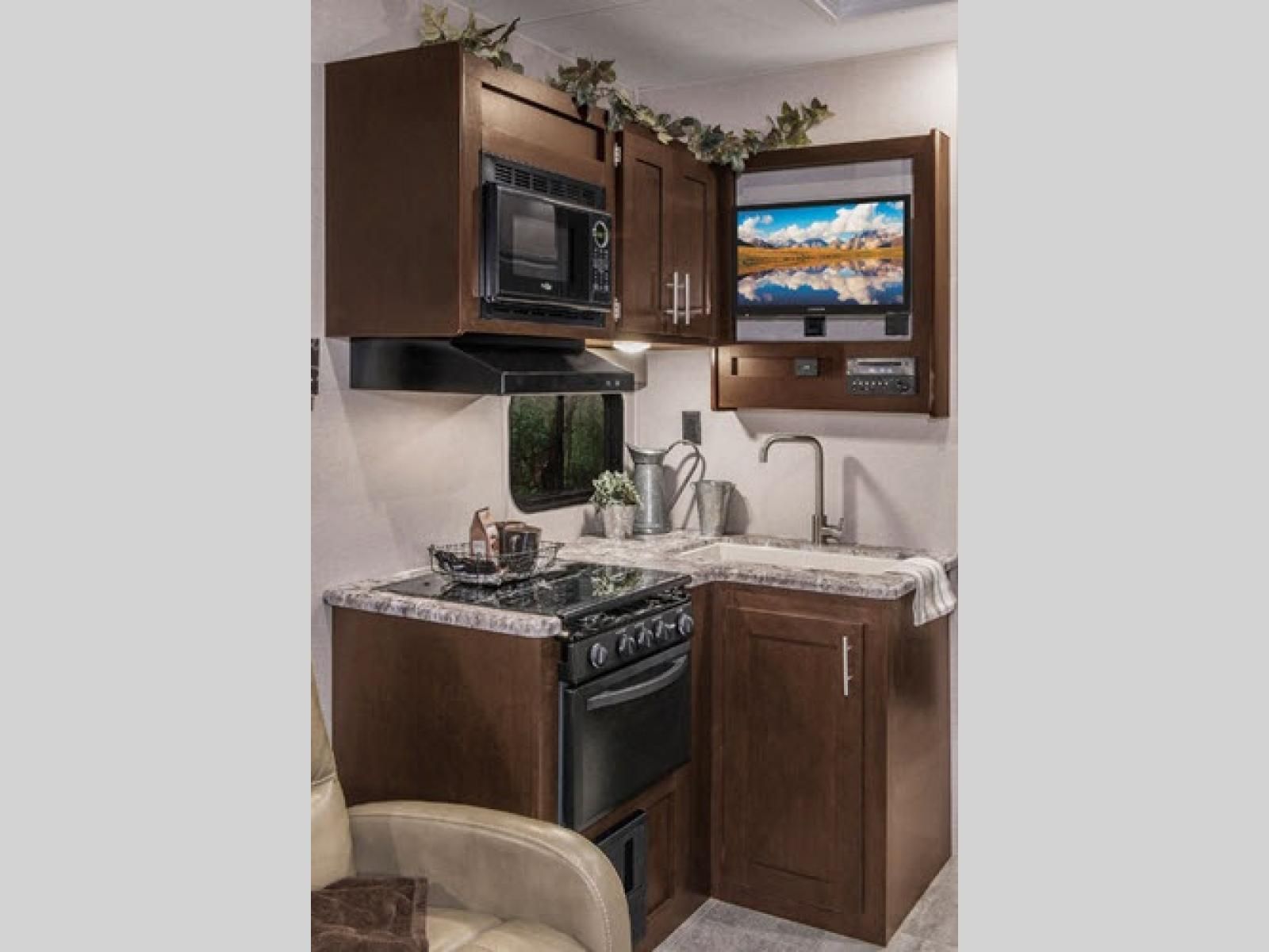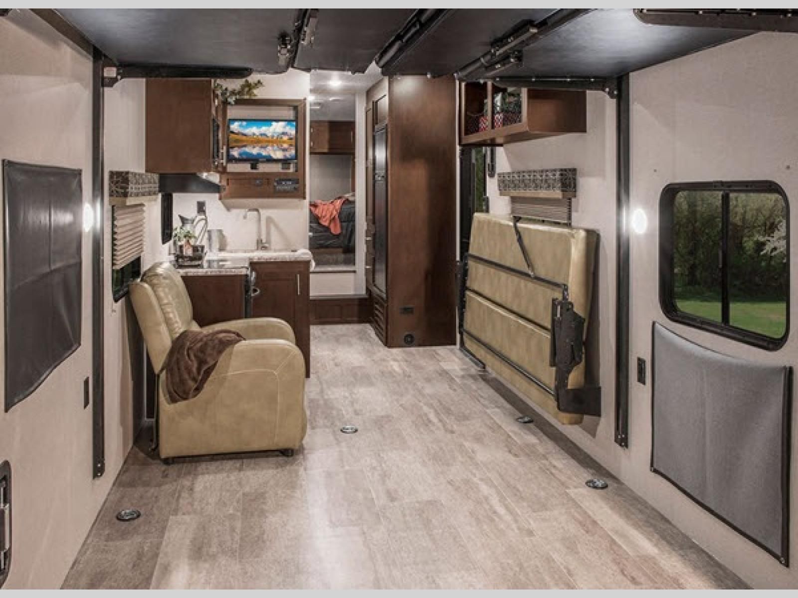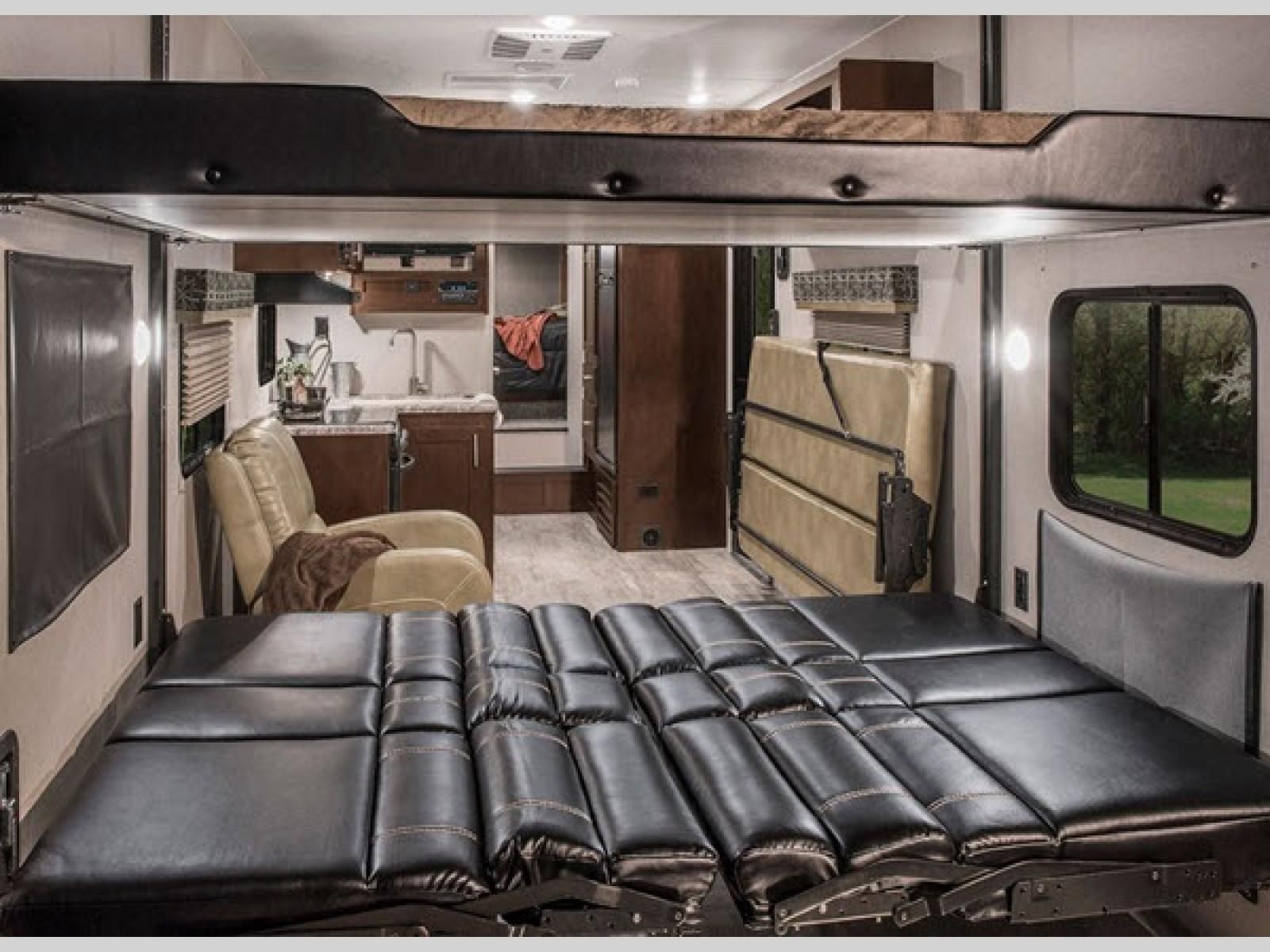 You won't find wasted space inside any of the Sportster fifth wheel toy haulers by KZ! They feature rollover sofas that fold up, pillowtop mattresses, a deep under-mounted sink with high-rise faucet, a microwave with turntable, and a 8 cu. ft. refrigerator. There is also Armstrong® ToughGuard® Linoleum throughout which is backed by a Dehco 3-year cold crack warranty. These toy haulers were built to last with the K-Z Exclusive Tough Shield .030 exterior metal, 8' wide body frame, 3/8 fully walk-on roof decking, a one-piece seamless roof with SuperFlex roofing material, and Equaflex suspension. You can enjoy your new RV with no worries because of the K-Z 24-month limited warranty that covers more than 1,500 operations codes.