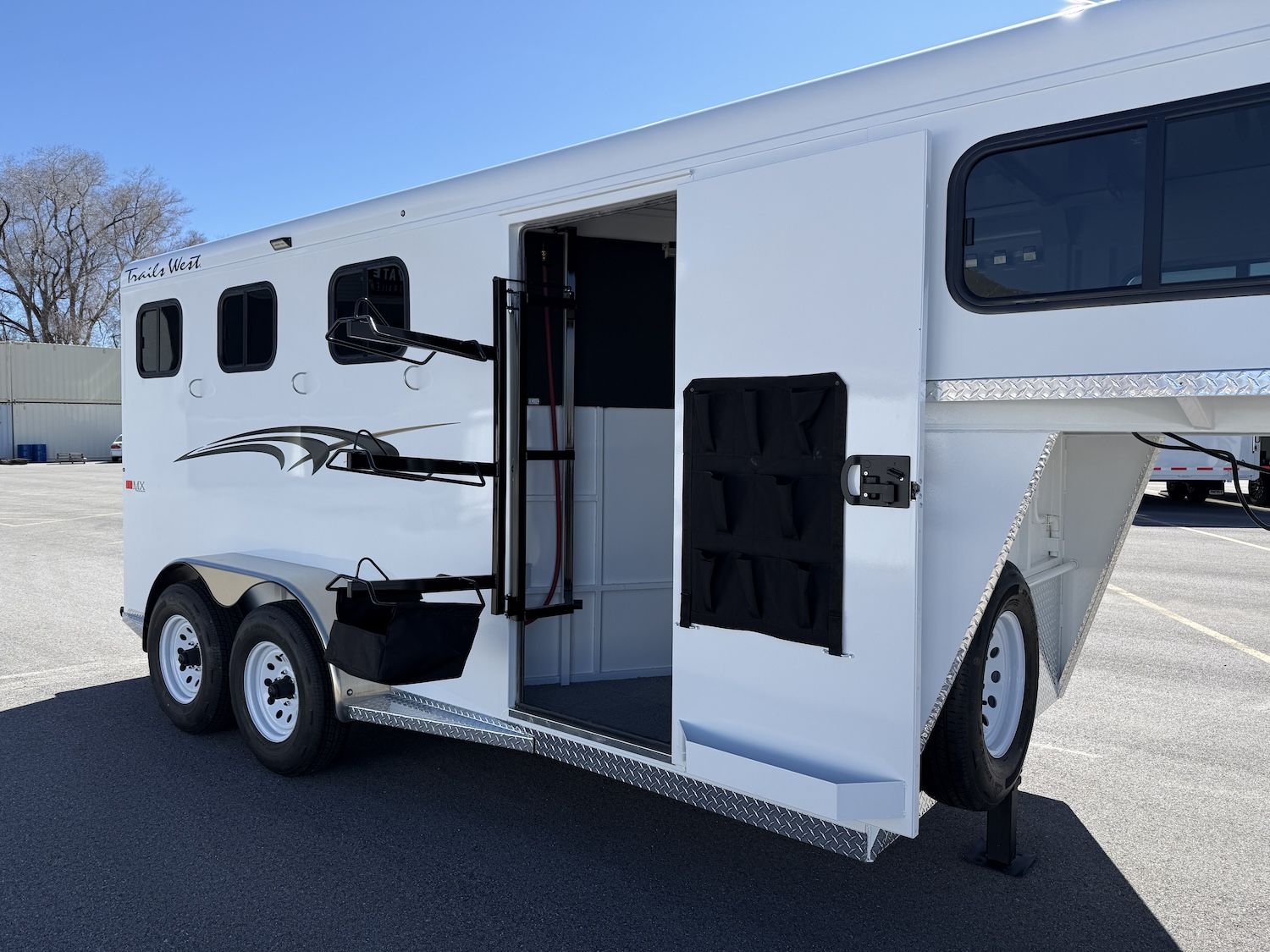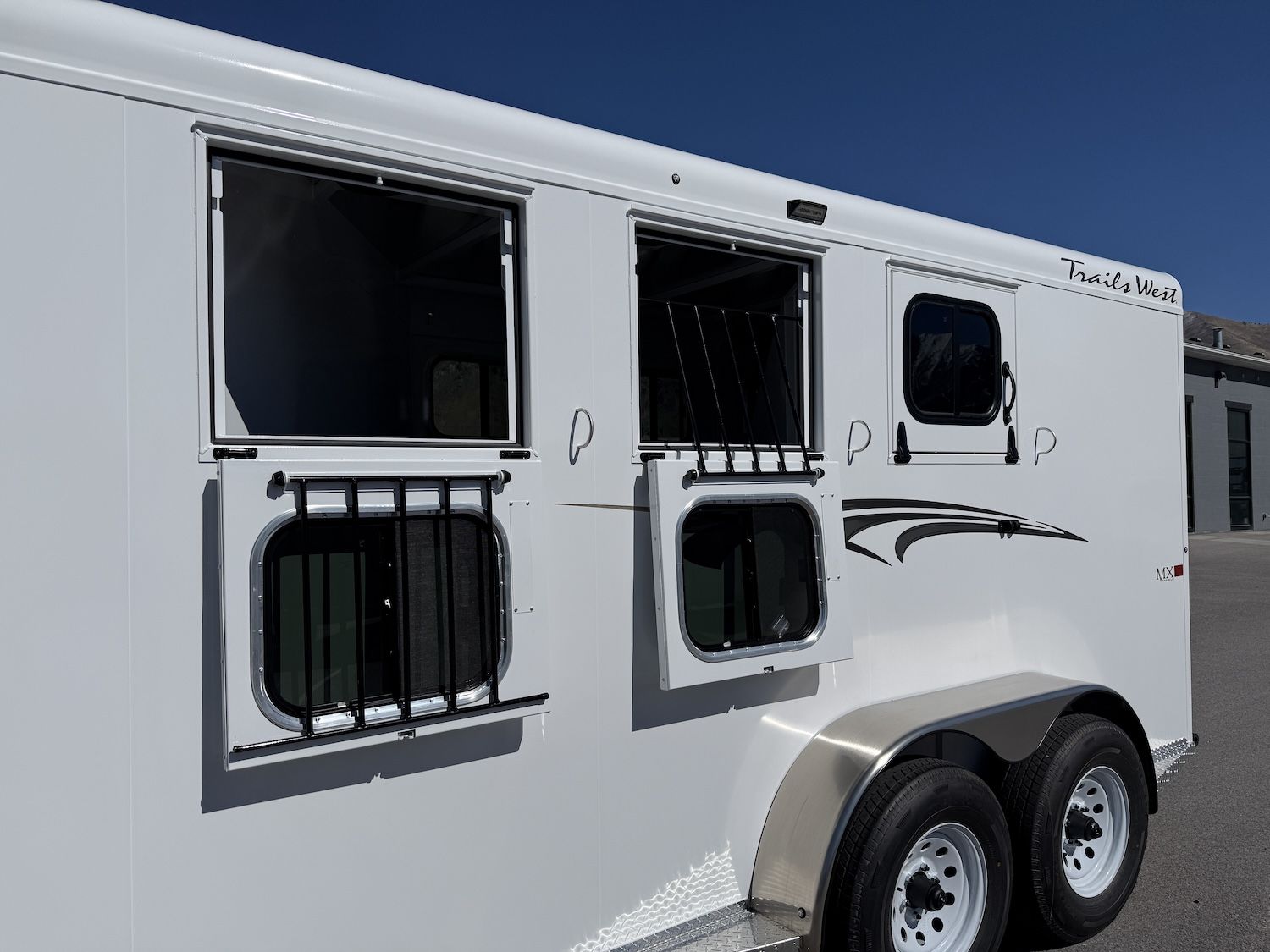 The Adventure MX trailer from Trails West is the best priced steel framed aluminum skinned trailer in the industry. It has the perfect combination of style, user friendly features, and value. This trailer has newly designed aerodynamic front, head side drop down feed windows, tail side sliding windows and rubber wall mats all the way around the horse compartment making it the best equipped trailer in its class.