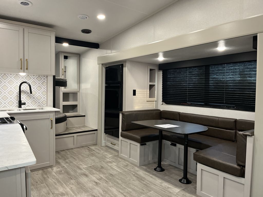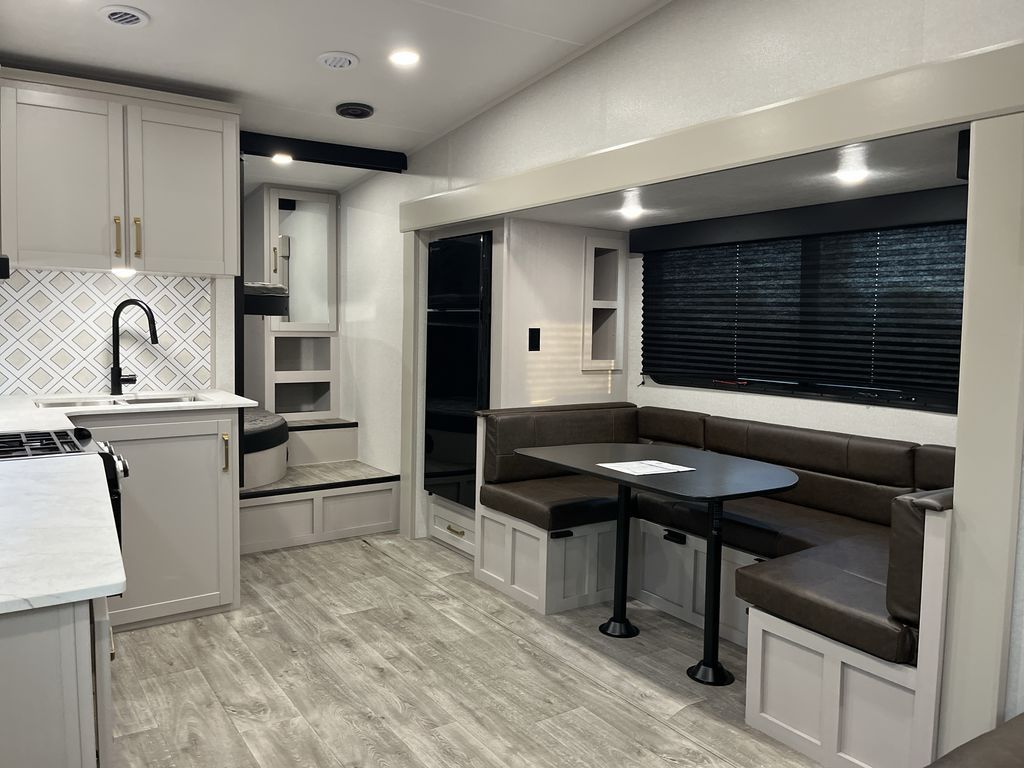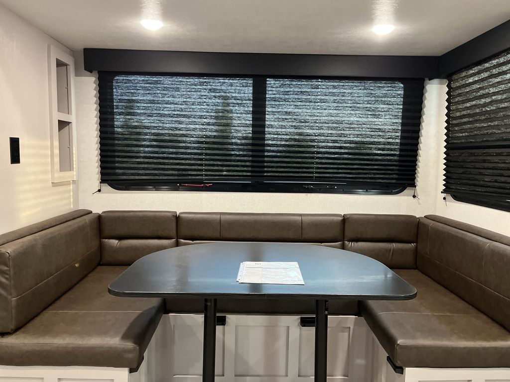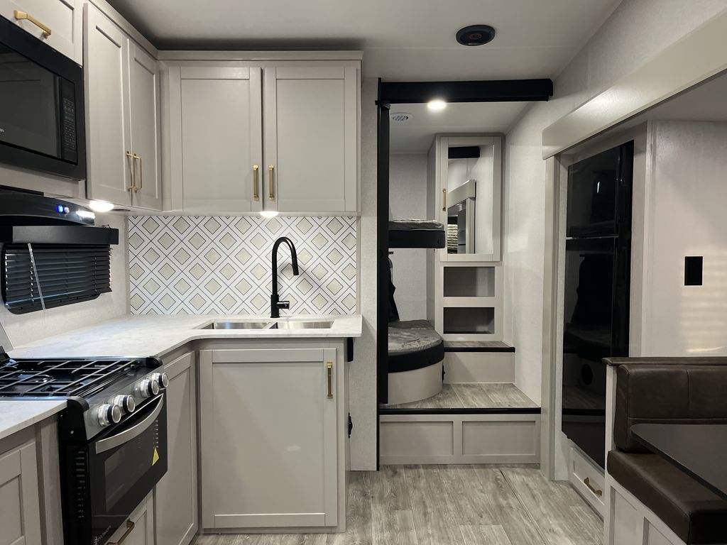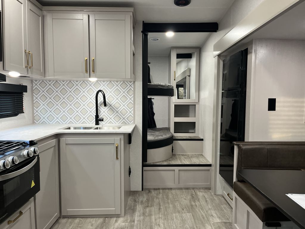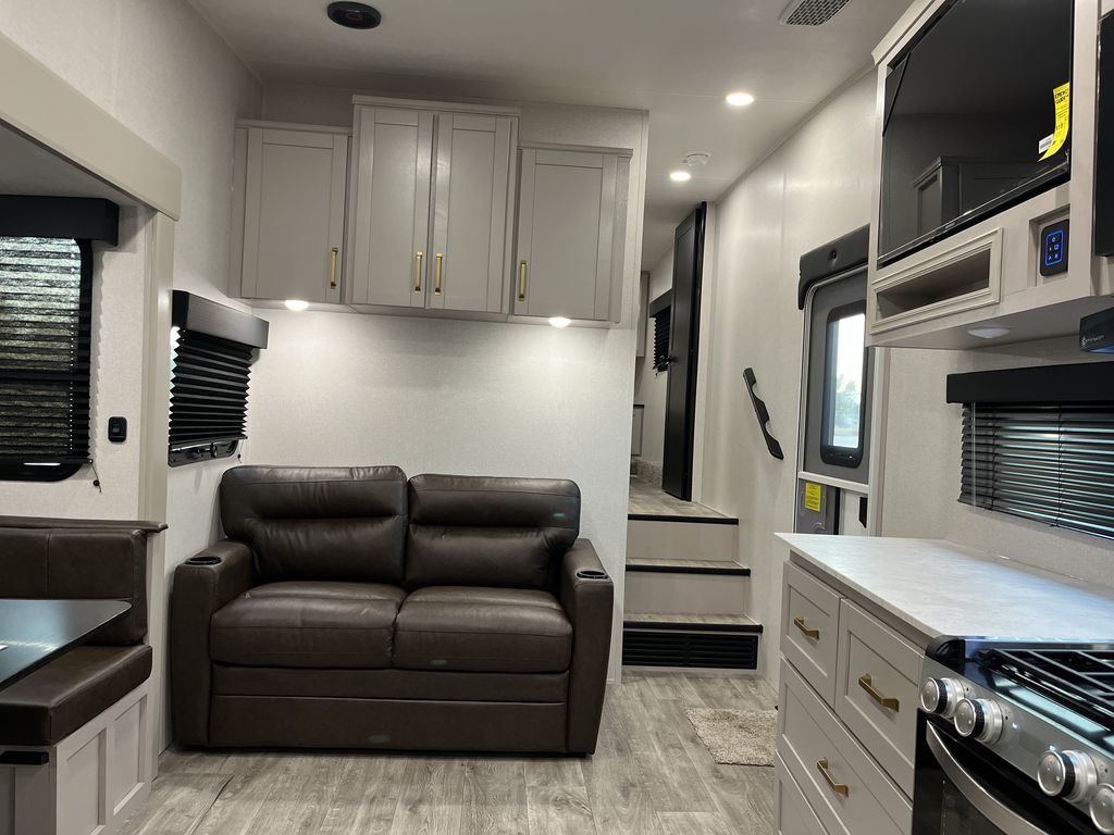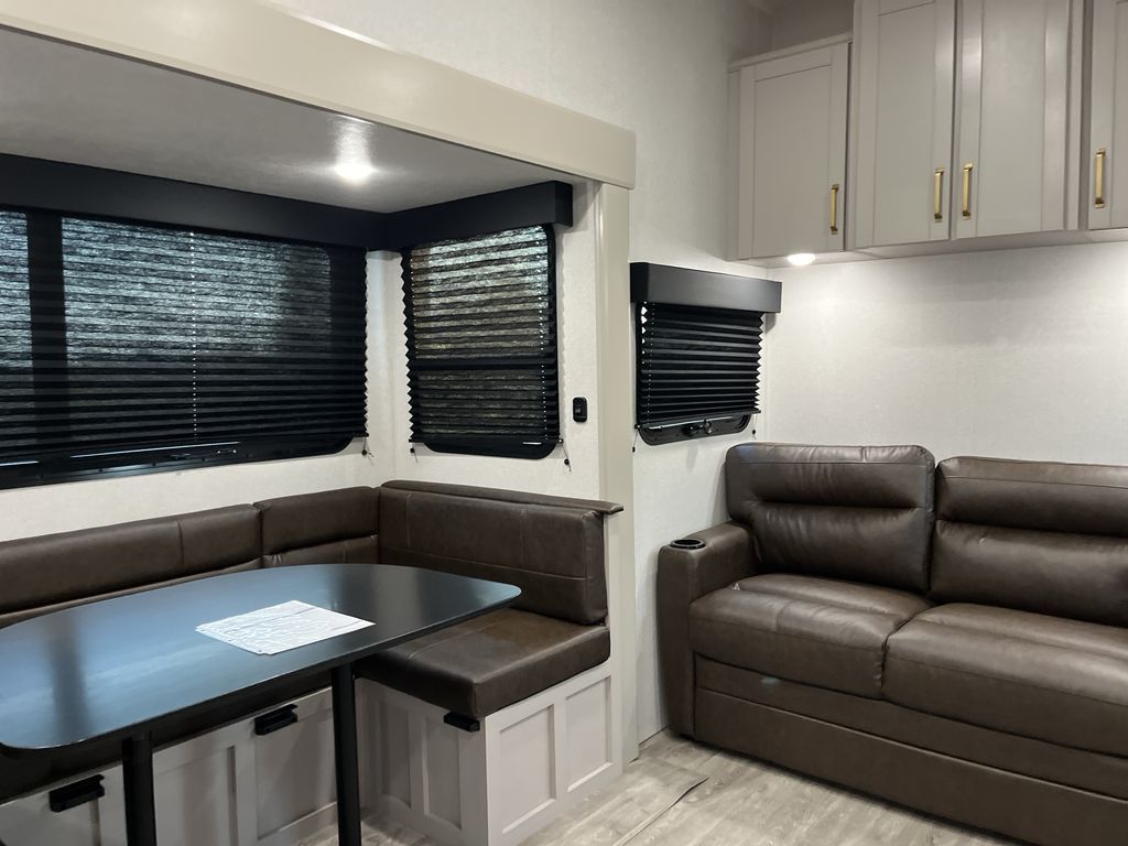 This fifth wheel's spacious interior boasts double-sized bunk beds designed for kids or guests, providing a comfortable sleeping space. A U-shaped dinette that offers ample seating and dining space for meals or even more sleeping space, as well as the 60” tri-fold sofa, which provides additional seating and can be converted into a comfortable sleeping area. In the kitchen area, you will find many amenities to cook delicious meals, such as a microwave, refrigerator, and overhead cabinets that will allow you to keep everything organized. The front bed is spacious, featuring a queen bed ideal for sleeping tight, and the full bath will complete the at-home experience since you will be able to take a refreshing shower on hot days!