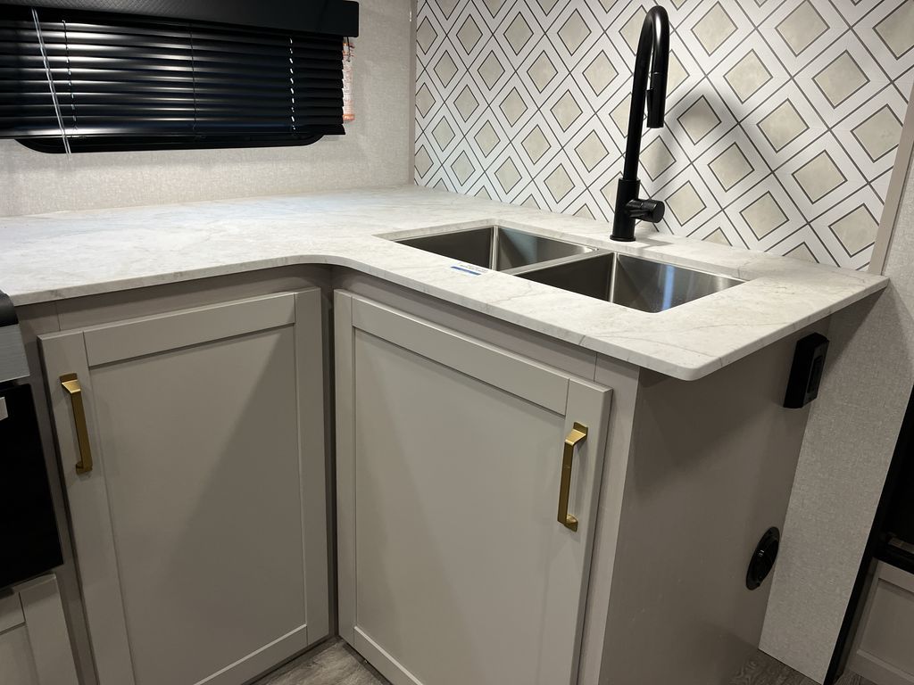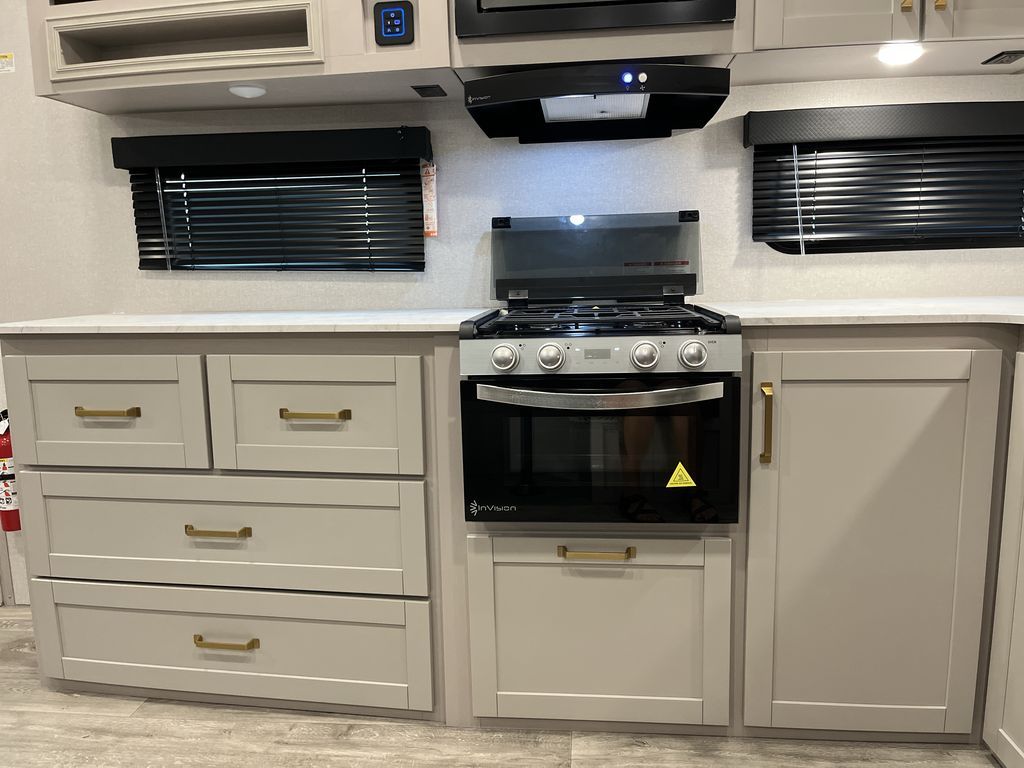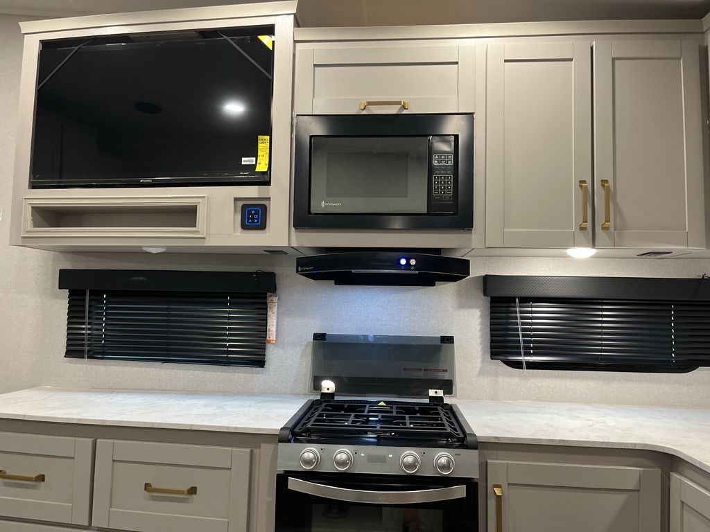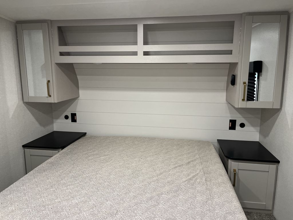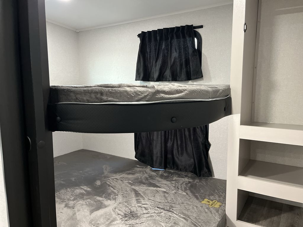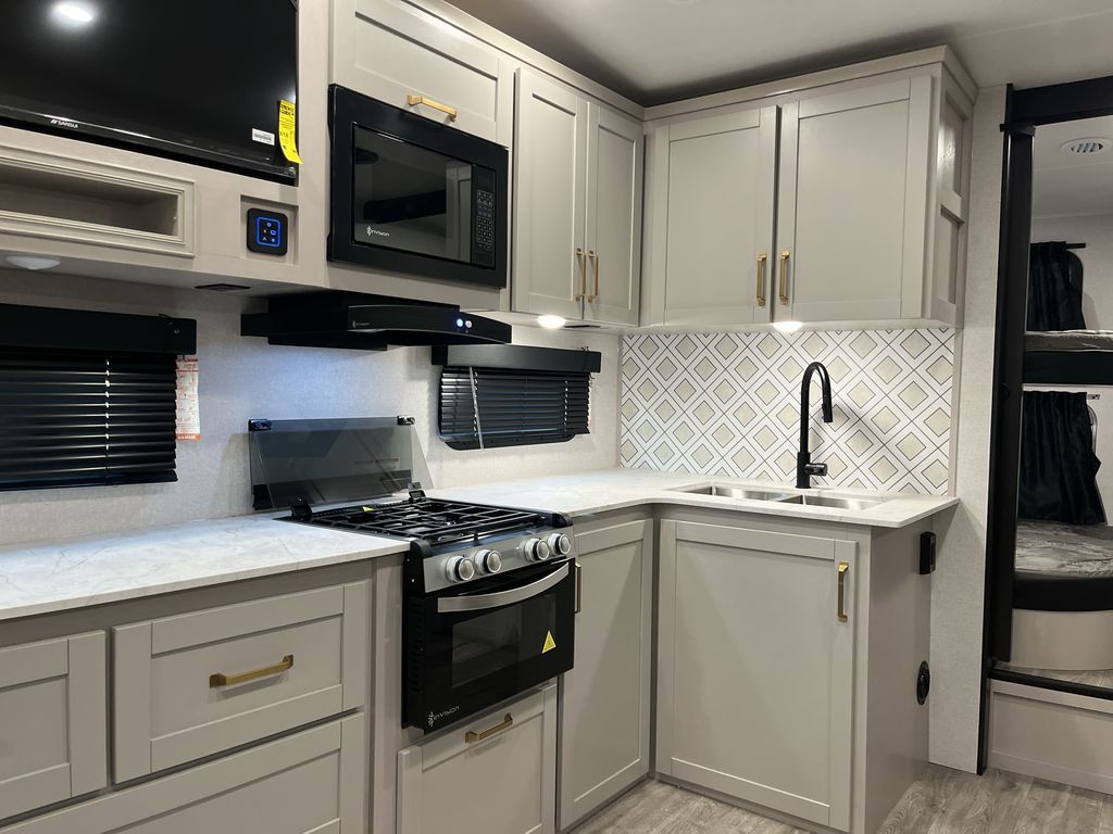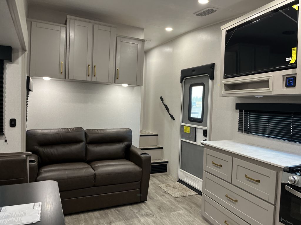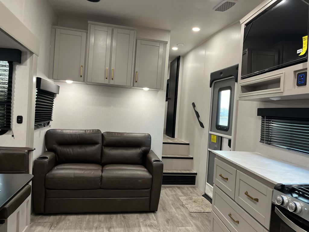 This fifth wheel's spacious interior boasts double-sized bunk beds designed for kids or guests, providing a comfortable sleeping space. A U-shaped dinette that offers ample seating and dining space for meals or even more sleeping space, as well as the 60” tri-fold sofa, which provides additional seating and can be converted into a comfortable sleeping area. In the kitchen area, you will find many amenities to cook delicious meals, such as a microwave, refrigerator, and overhead cabinets that will allow you to keep everything organized. The front bed is spacious, featuring a queen bed ideal for sleeping tight, and the full bath will complete the at-home experience since you will be able to take a refreshing shower on hot days!