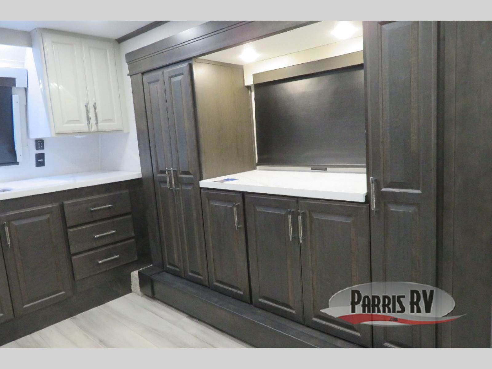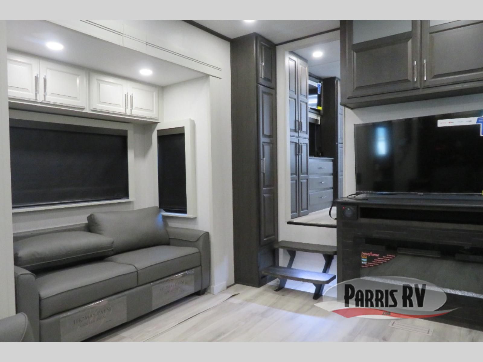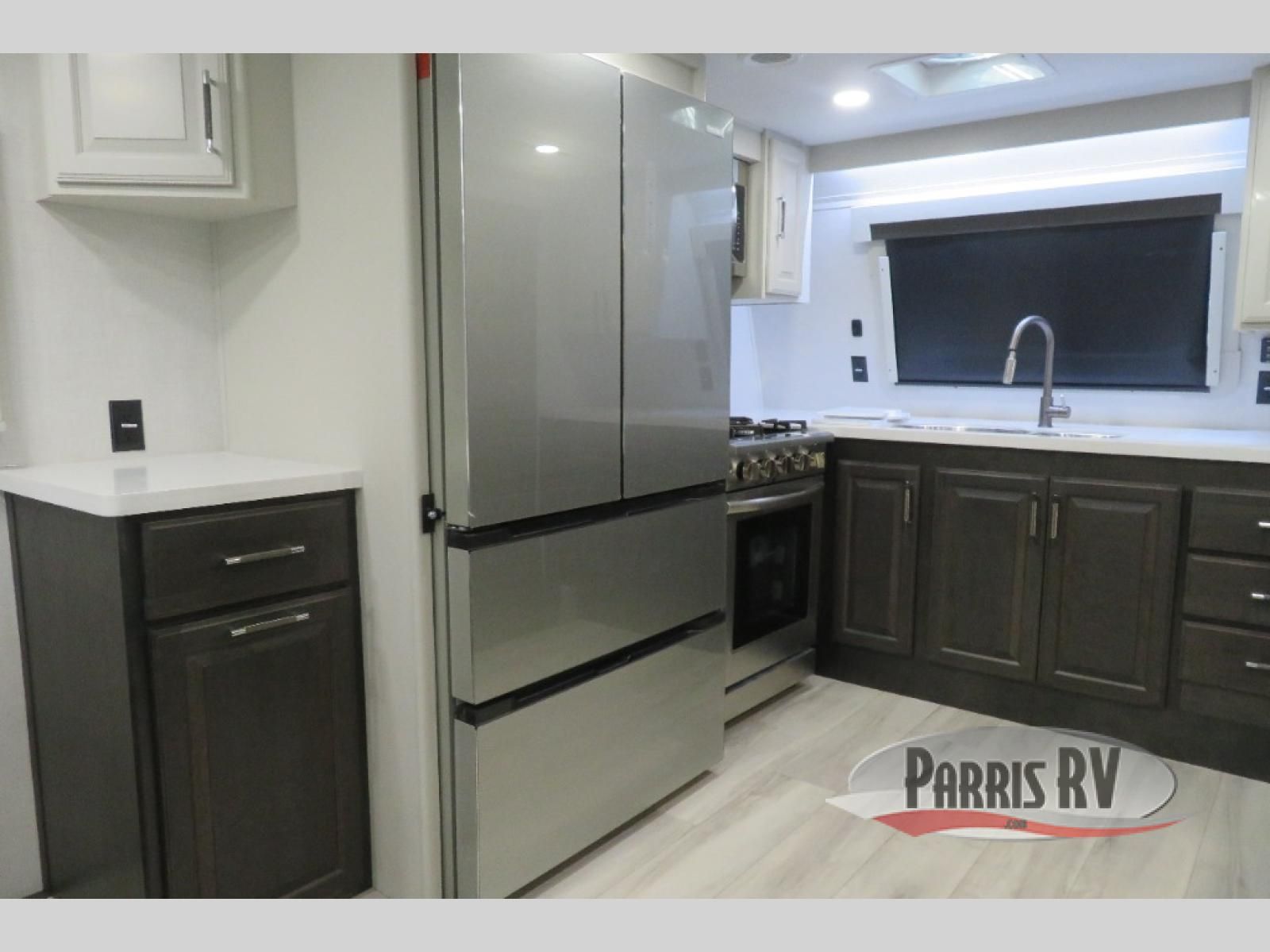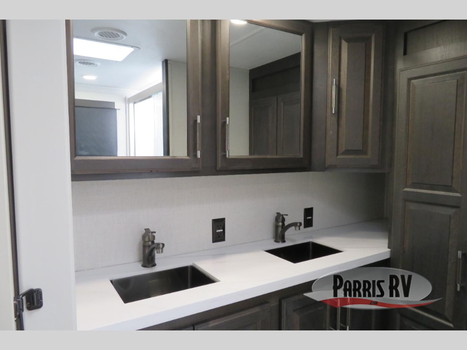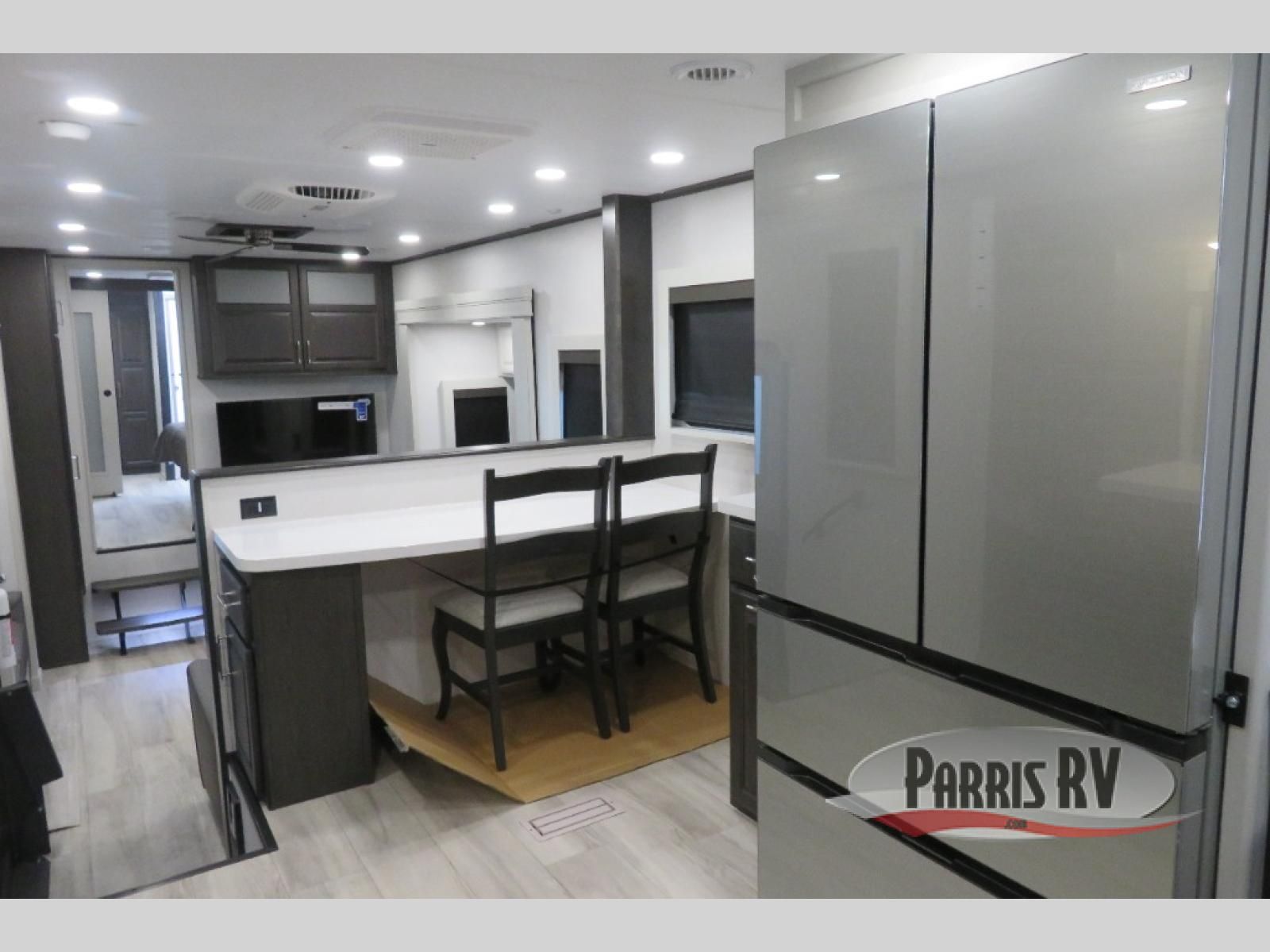 This fifth wheel is decked out in luxuries! The full rear bathroom has a walk-in shower to freshen up in each morning, a dual sink vanity for two to get ready at once, plus washer and dryer prep. You will enjoy a good night's rest on the king bed slide inside the private bedroom and others can sleep on the opposing tri-fold sofa sleeper slides in the living room. There is also a theater seating here, along with a fireplace and 50" LED TV for movie nights. The front kitchen is where it's really at in this fifth wheel; ample counter space, a bar top with stools, pull-out drawers, plus a pantry and closet for even more storage!