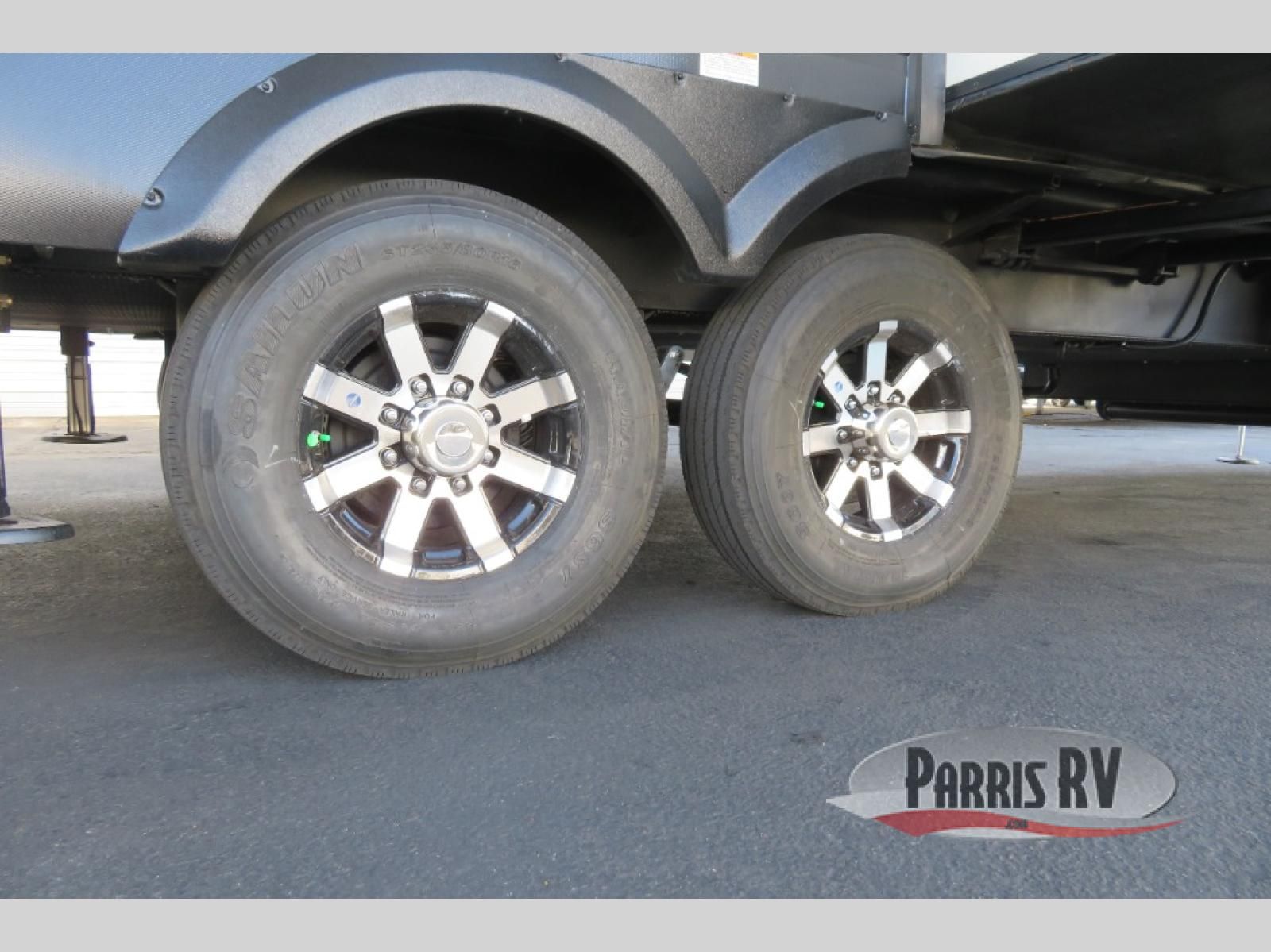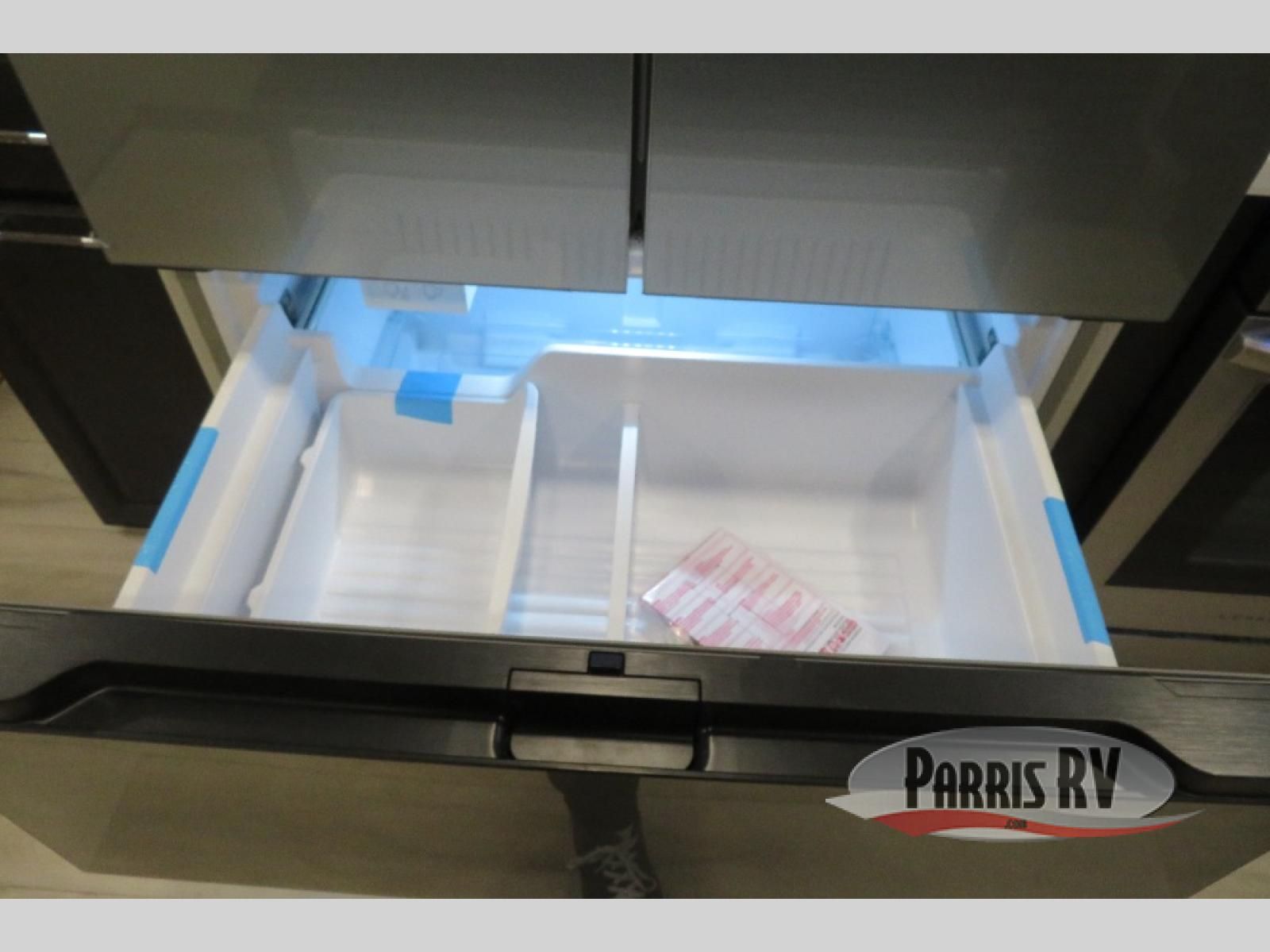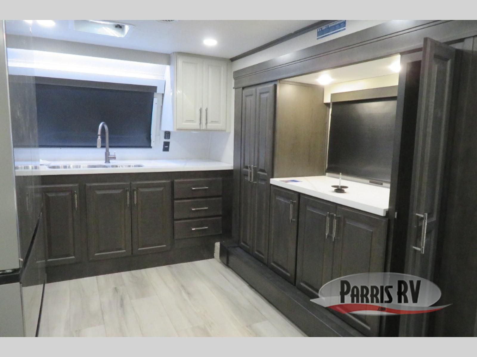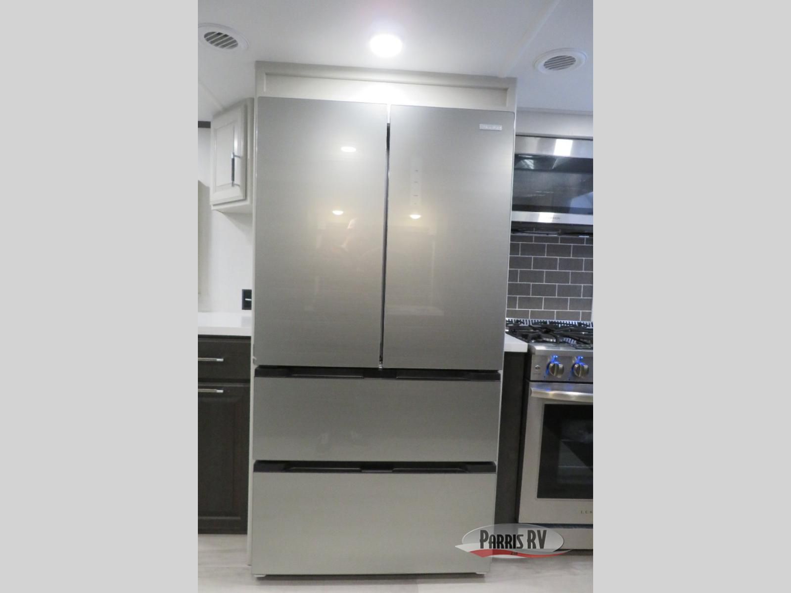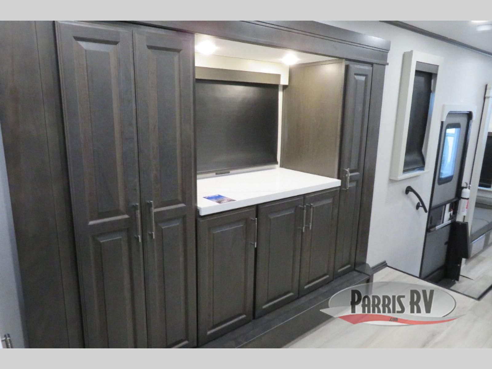 This fifth wheel is decked out in luxuries! The full rear bathroom has a walk-in shower to freshen up in each morning, a dual sink vanity for two to get ready at once, plus washer and dryer prep. You will enjoy a good night's rest on the king bed slide inside the private bedroom and others can sleep on the opposing tri-fold sofa sleeper slides in the living room. There is also a theater seating here, along with a fireplace and 50" LED TV for movie nights. The front kitchen is where it's really at in this fifth wheel; ample counter space, a bar top with stools, pull-out drawers, plus a pantry and closet for even more storage!
