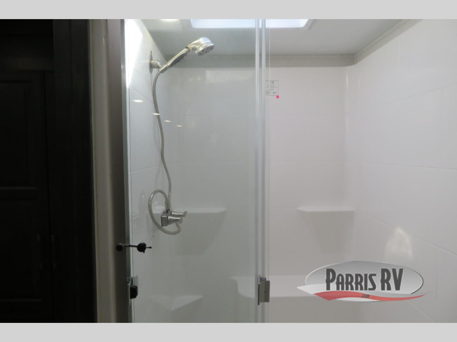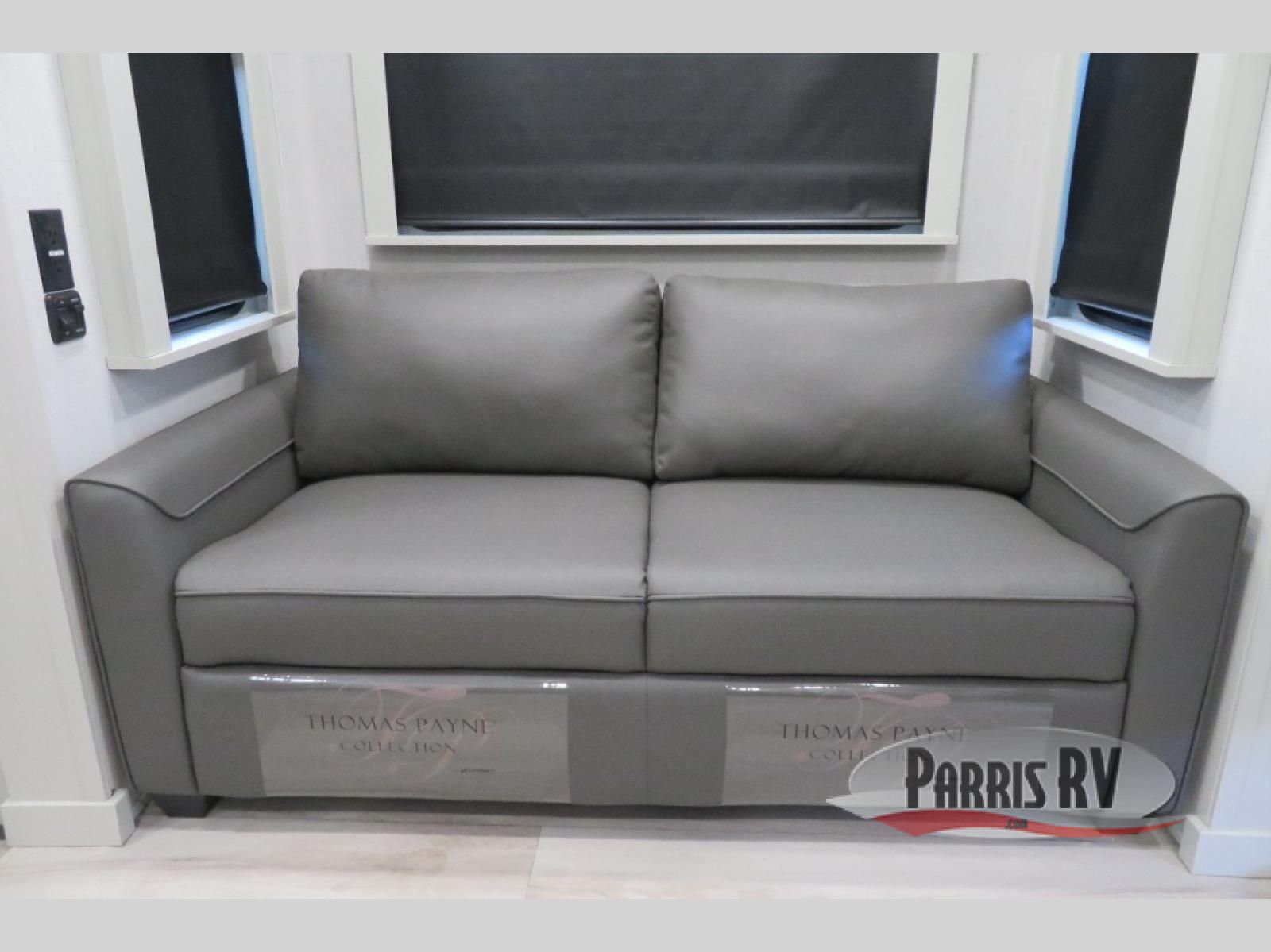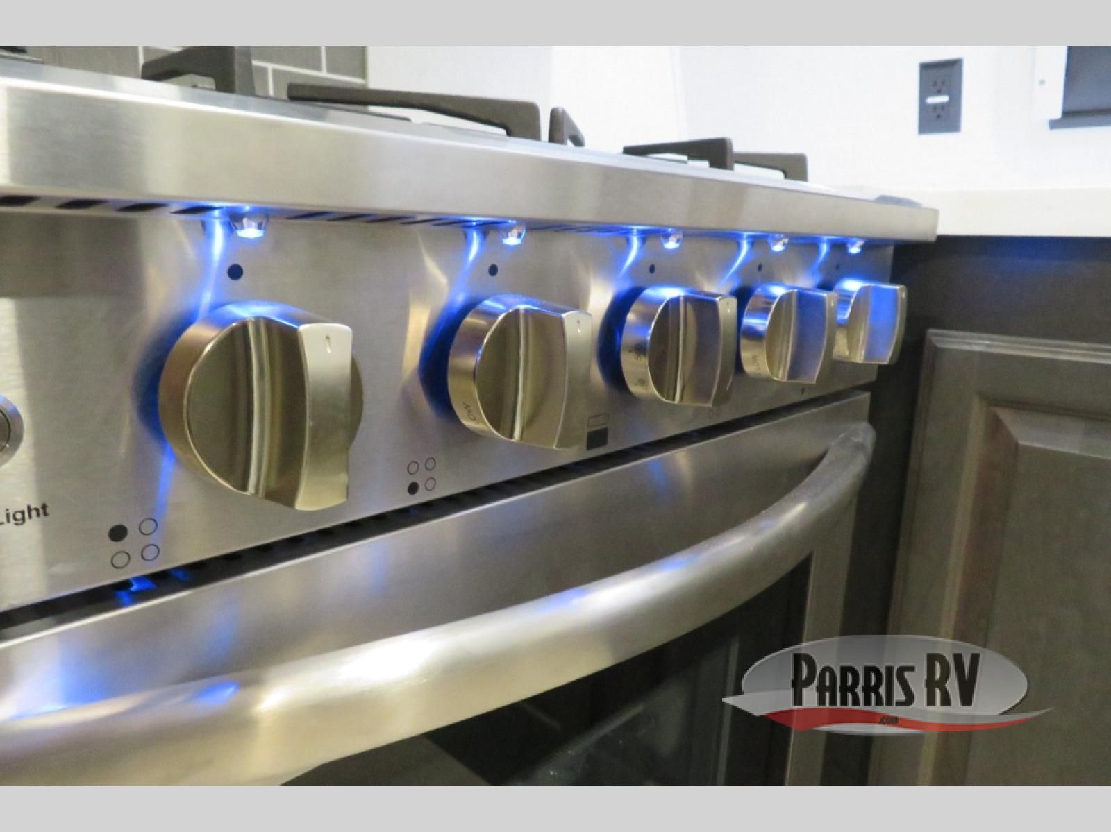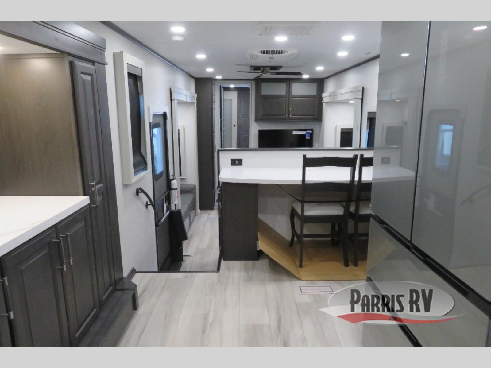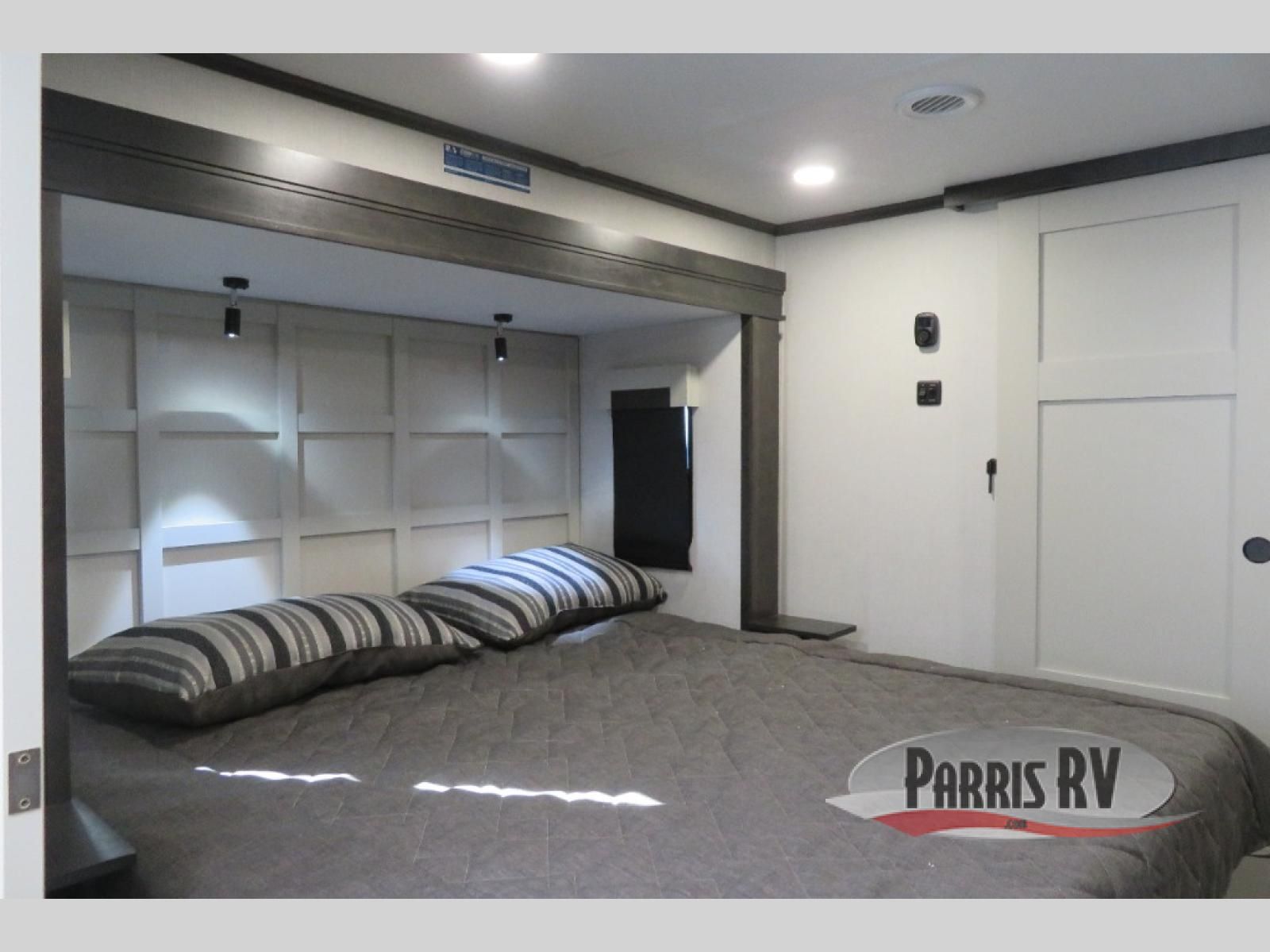 This fifth wheel is decked out in luxuries! The full rear bathroom has a walk-in shower to freshen up in each morning, a dual sink vanity for two to get ready at once, plus washer and dryer prep. You will enjoy a good night's rest on the king bed slide inside the private bedroom and others can sleep on the opposing tri-fold sofa sleeper slides in the living room. There is also a theater seating here, along with a fireplace and 50" LED TV for movie nights. The front kitchen is where it's really at in this fifth wheel; ample counter space, a bar top with stools, pull-out drawers, plus a pantry and closet for even more storage!