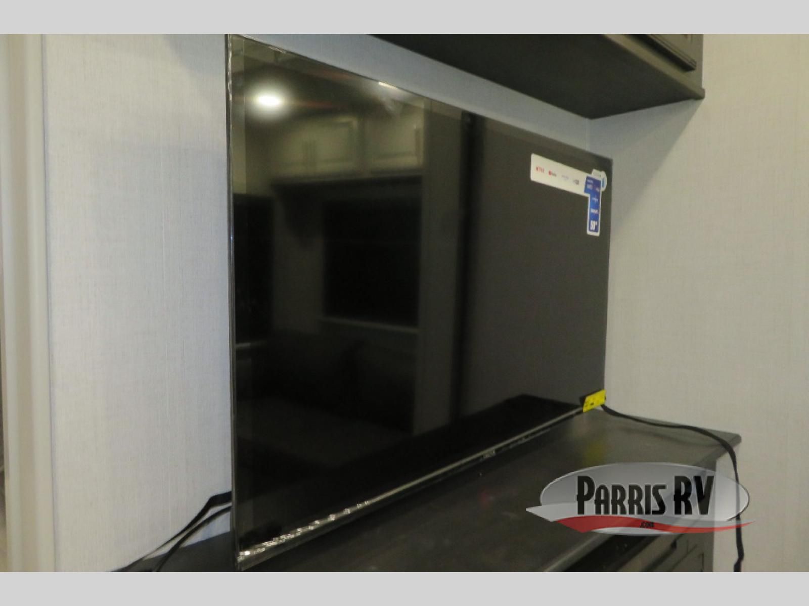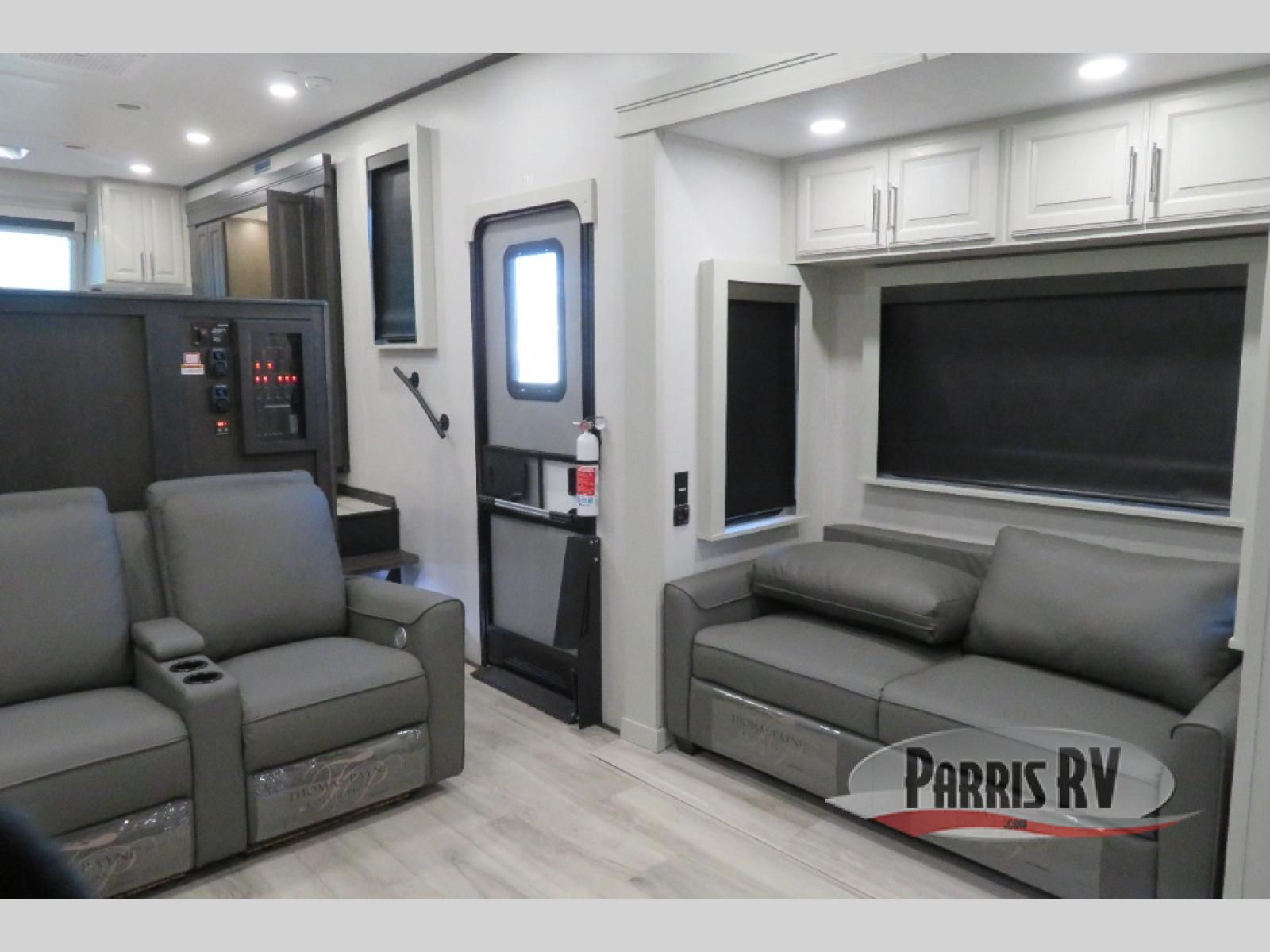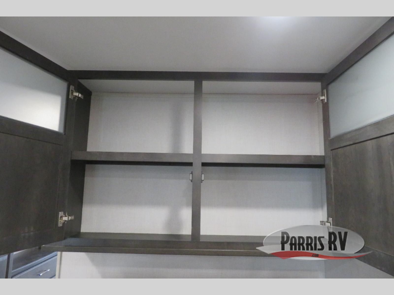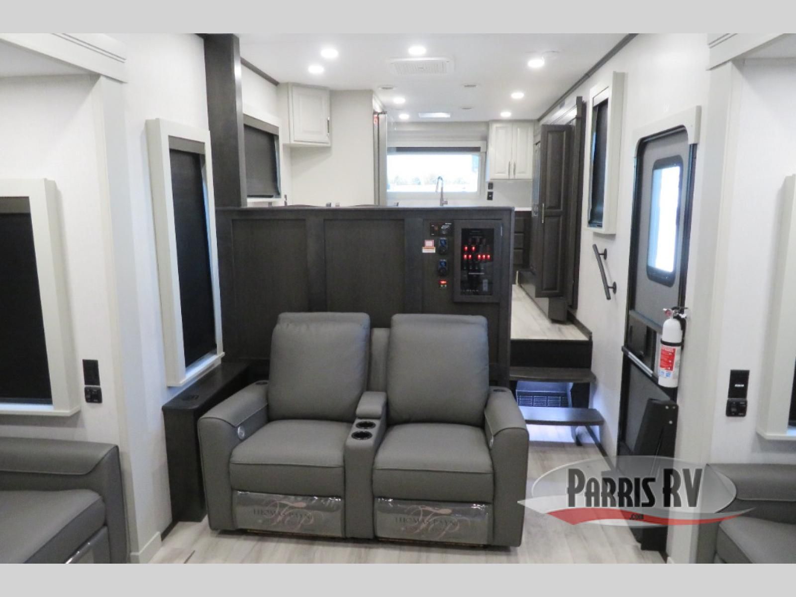 This fifth wheel is decked out in luxuries! The full rear bathroom has a walk-in shower to freshen up in each morning, a dual sink vanity for two to get ready at once, plus washer and dryer prep. You will enjoy a good night's rest on the king bed slide inside the private bedroom and others can sleep on the opposing tri-fold sofa sleeper slides in the living room. There is also a theater seating here, along with a fireplace and 50" LED TV for movie nights. The front kitchen is where it's really at in this fifth wheel; ample counter space, a bar top with stools, pull-out drawers, plus a pantry and closet for even more storage!
