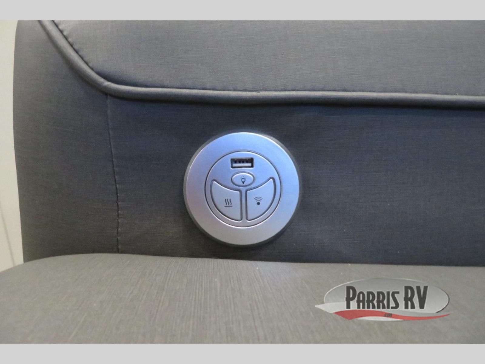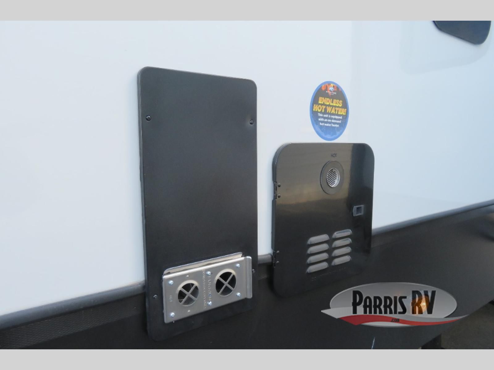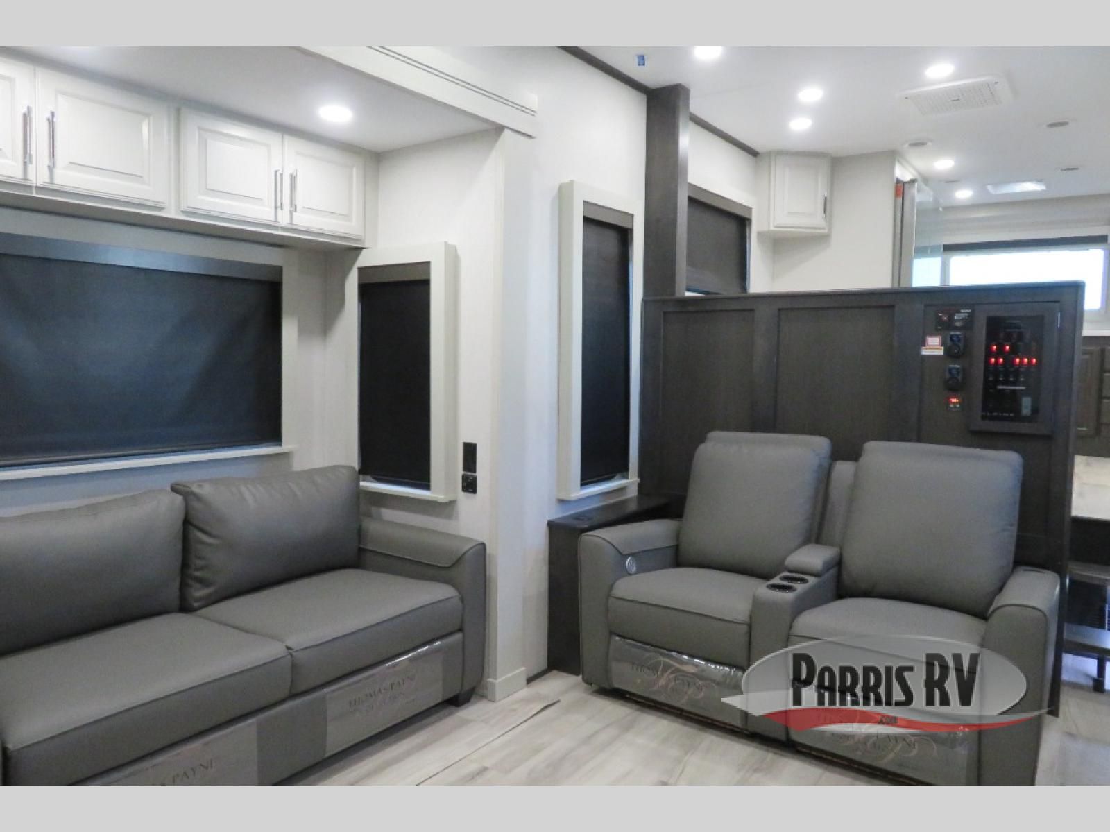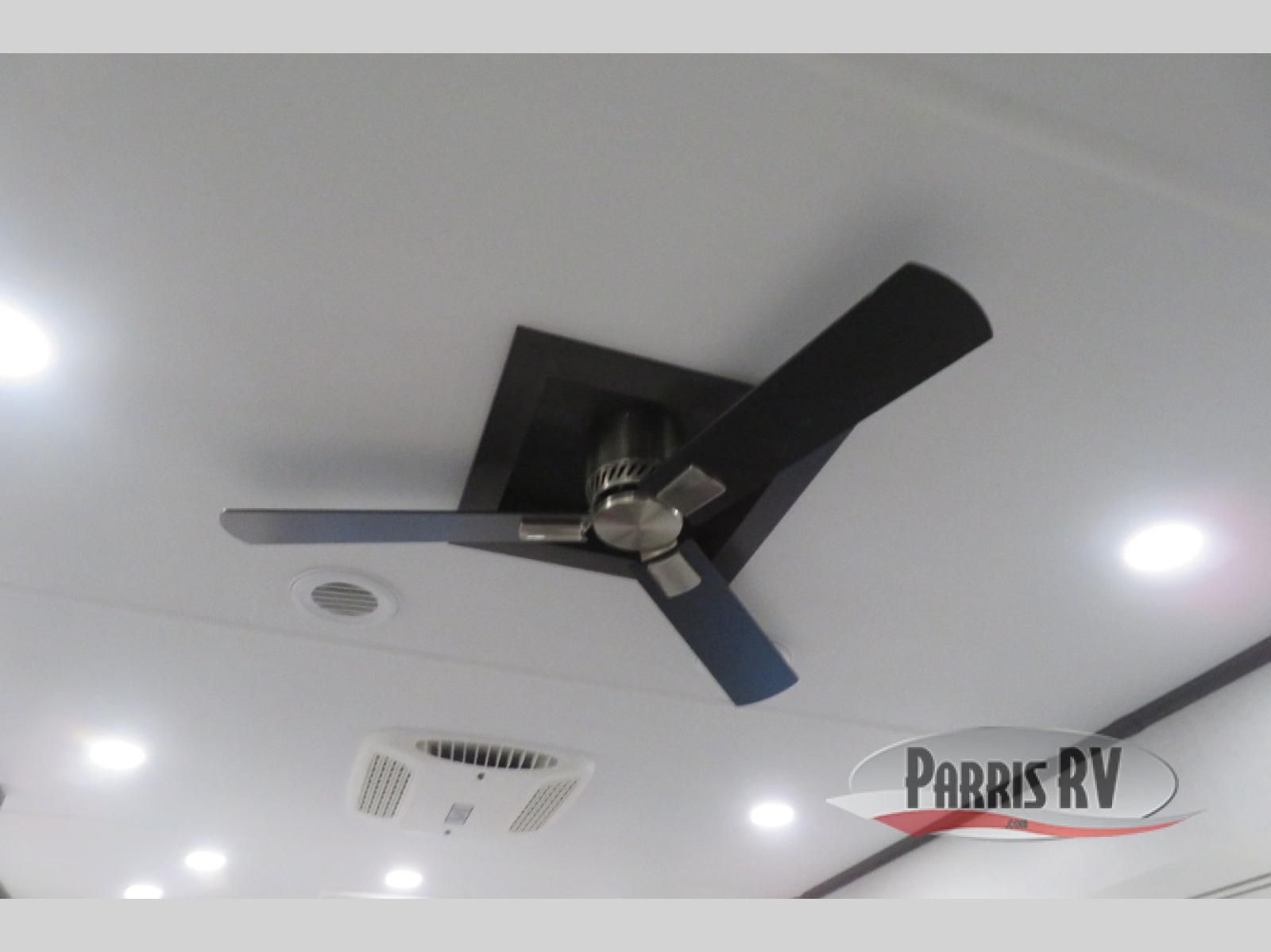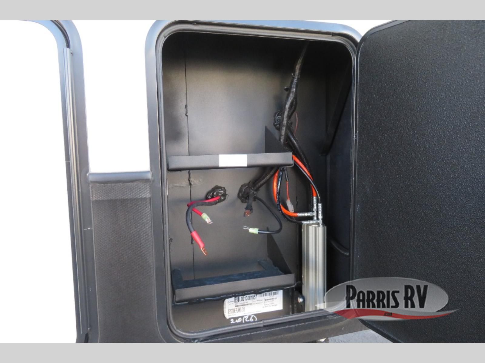 This fifth wheel is decked out in luxuries! The full rear bathroom has a walk-in shower to freshen up in each morning, a dual sink vanity for two to get ready at once, plus washer and dryer prep. You will enjoy a good night's rest on the king bed slide inside the private bedroom and others can sleep on the opposing tri-fold sofa sleeper slides in the living room. There is also a theater seating here, along with a fireplace and 50" LED TV for movie nights. The front kitchen is where it's really at in this fifth wheel; ample counter space, a bar top with stools, pull-out drawers, plus a pantry and closet for even more storage!