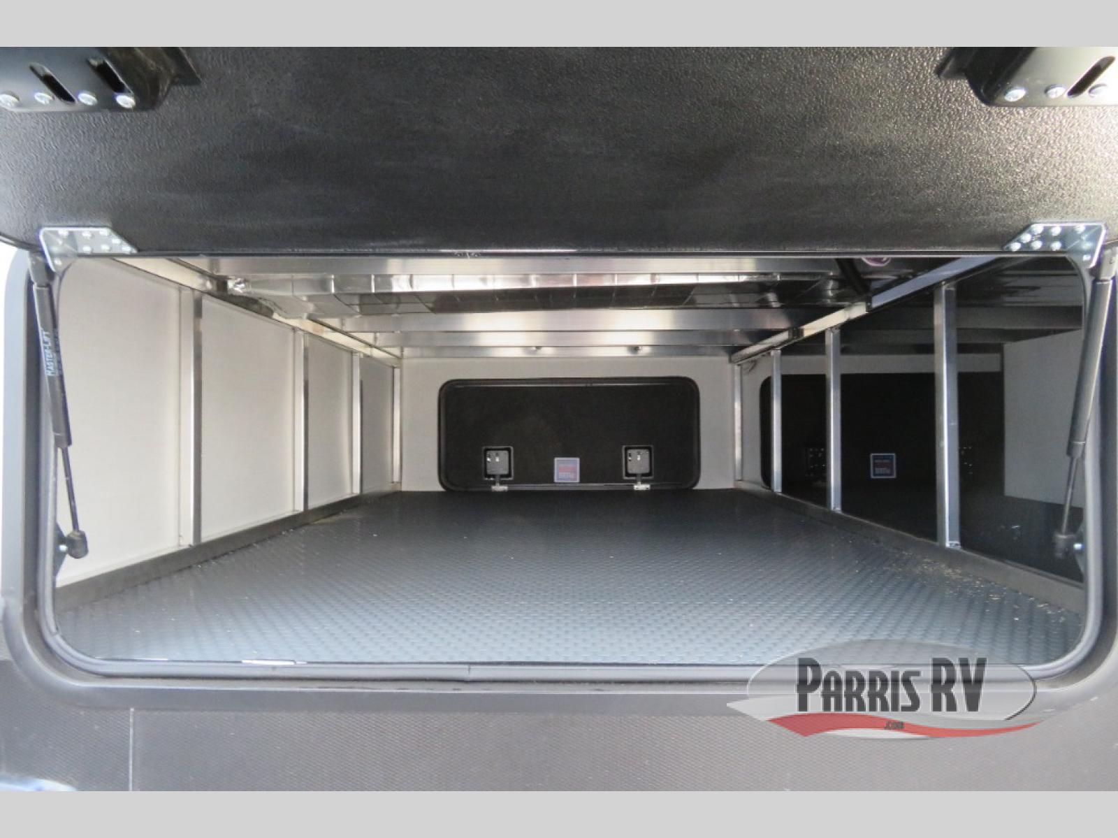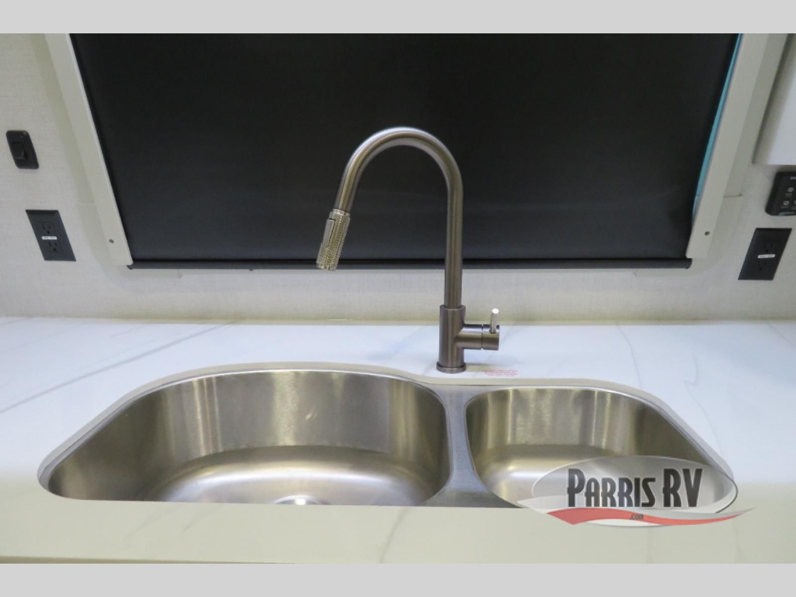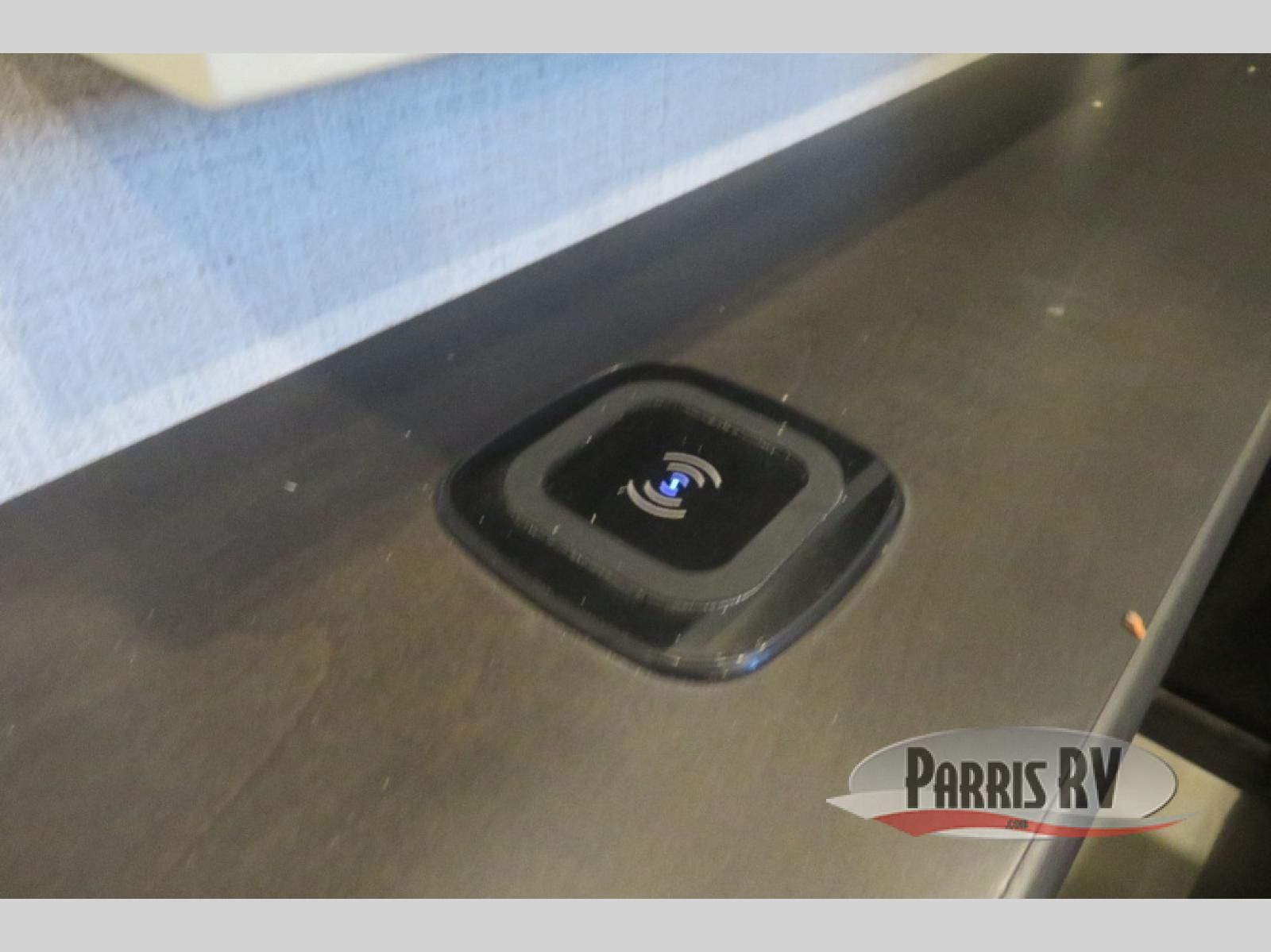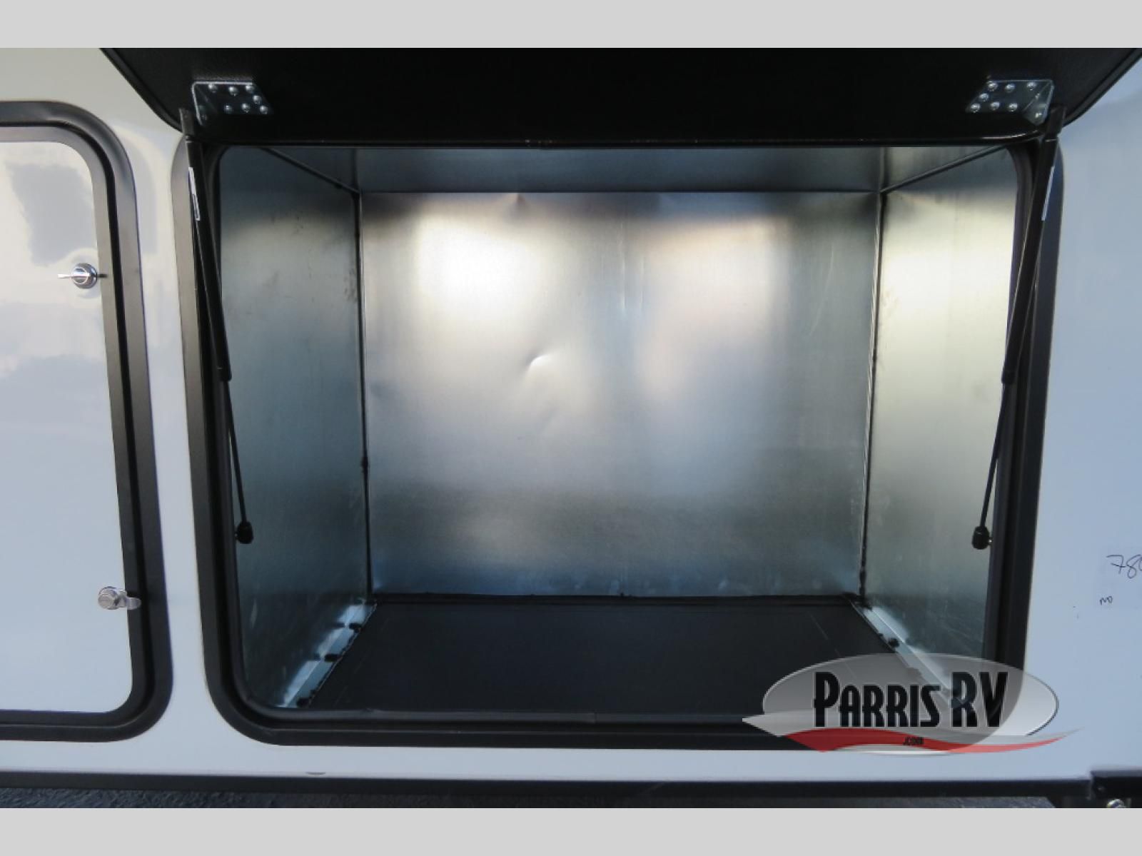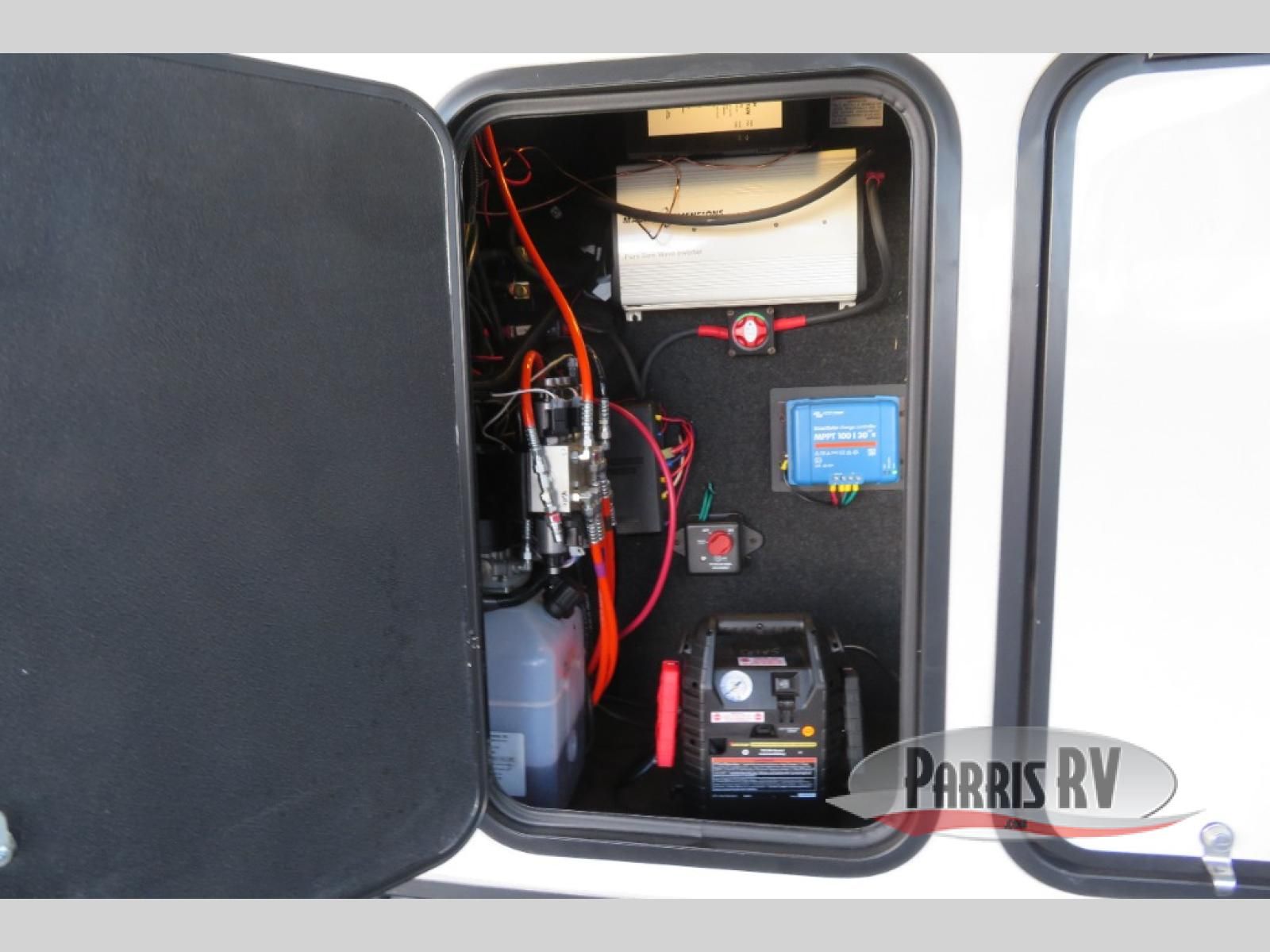 This fifth wheel is decked out in luxuries! The full rear bathroom has a walk-in shower to freshen up in each morning, a dual sink vanity for two to get ready at once, plus washer and dryer prep. You will enjoy a good night's rest on the king bed slide inside the private bedroom and others can sleep on the opposing tri-fold sofa sleeper slides in the living room. There is also a theater seating here, along with a fireplace and 50" LED TV for movie nights. The front kitchen is where it's really at in this fifth wheel; ample counter space, a bar top with stools, pull-out drawers, plus a pantry and closet for even more storage!