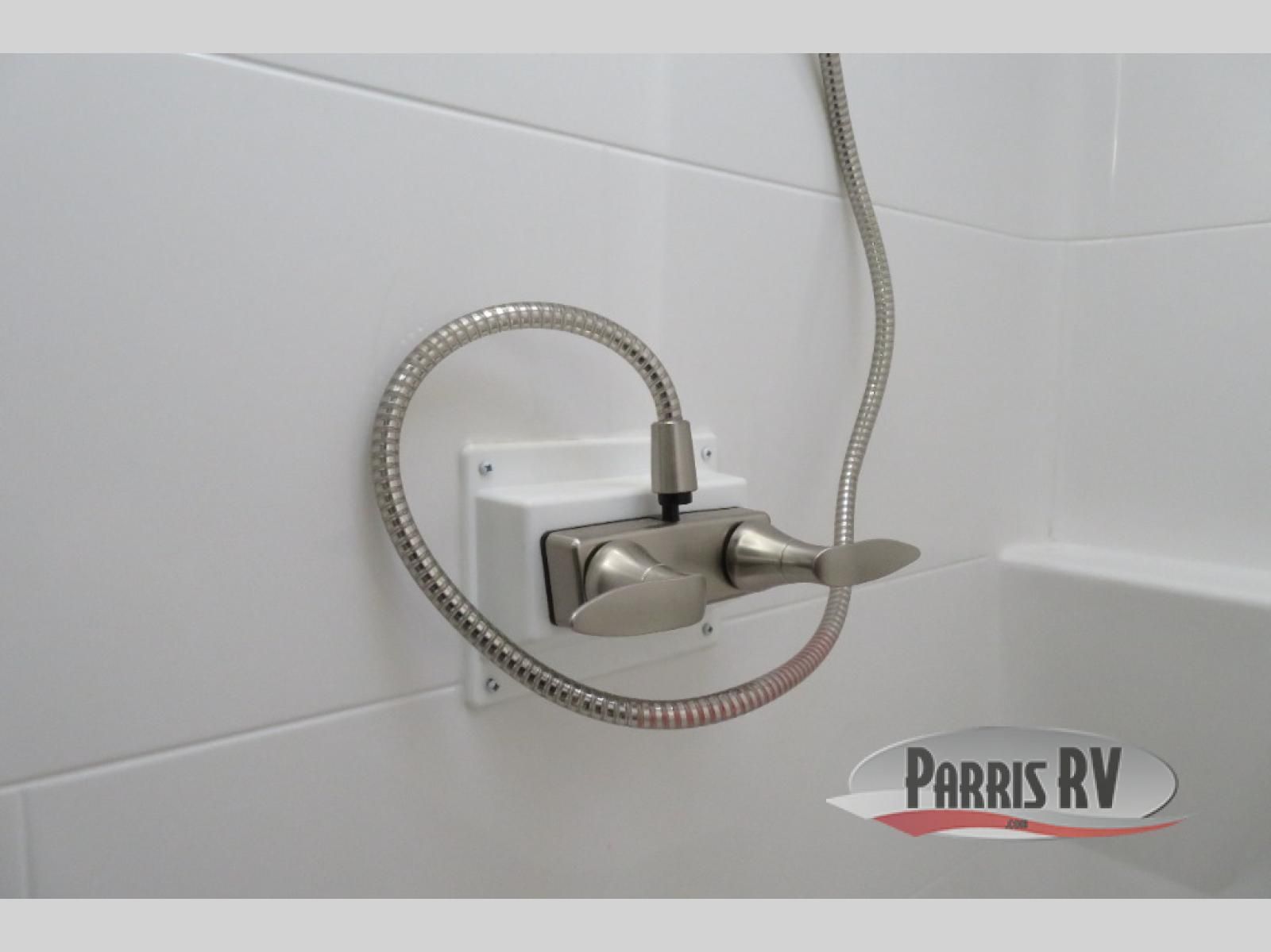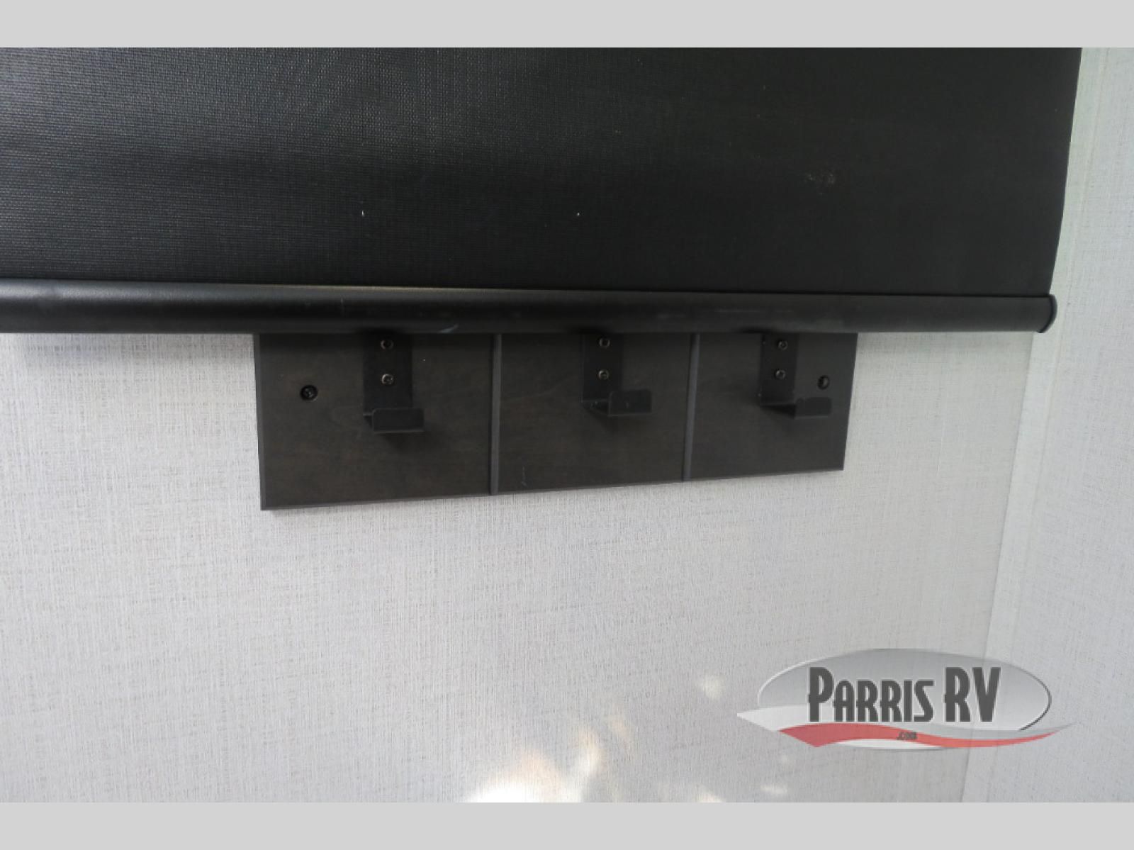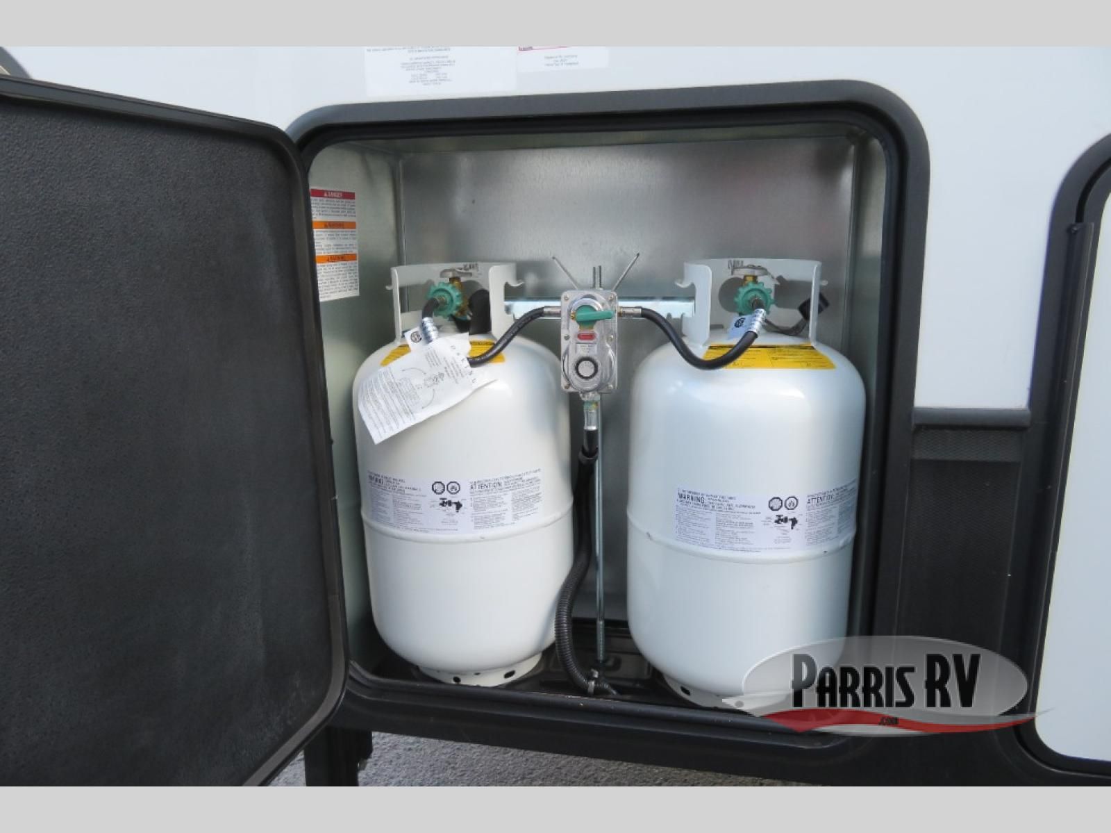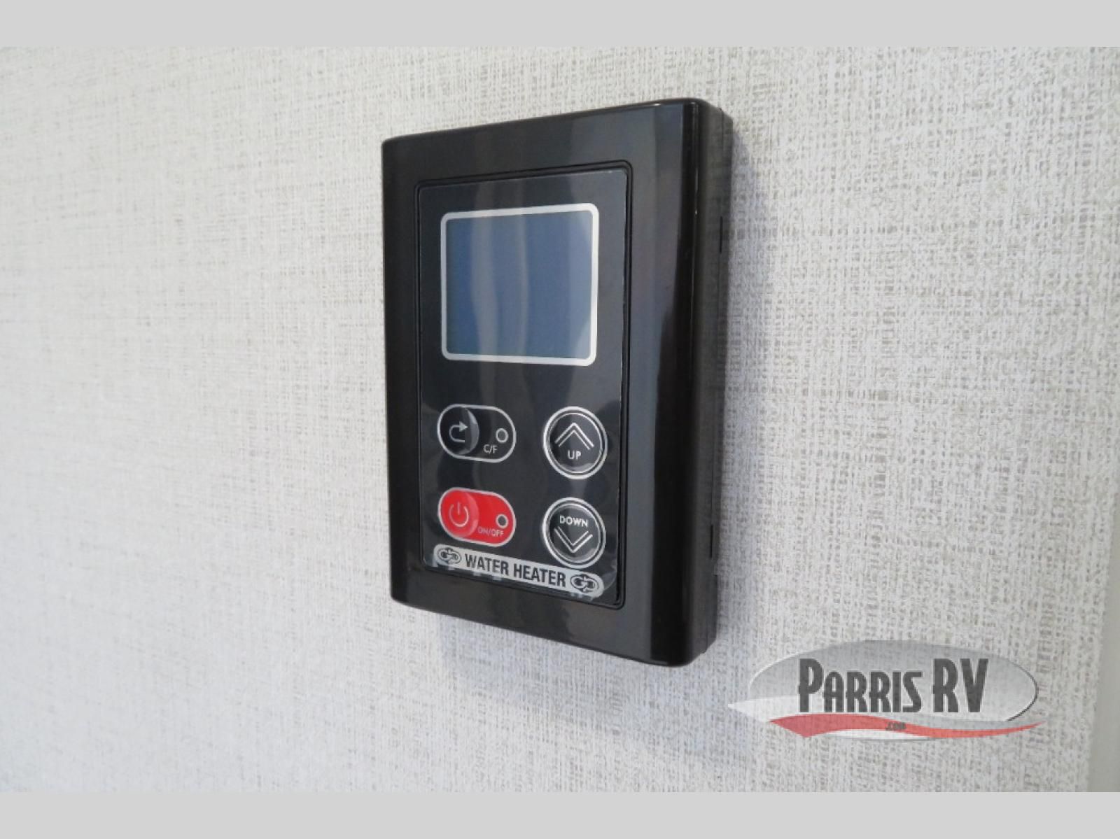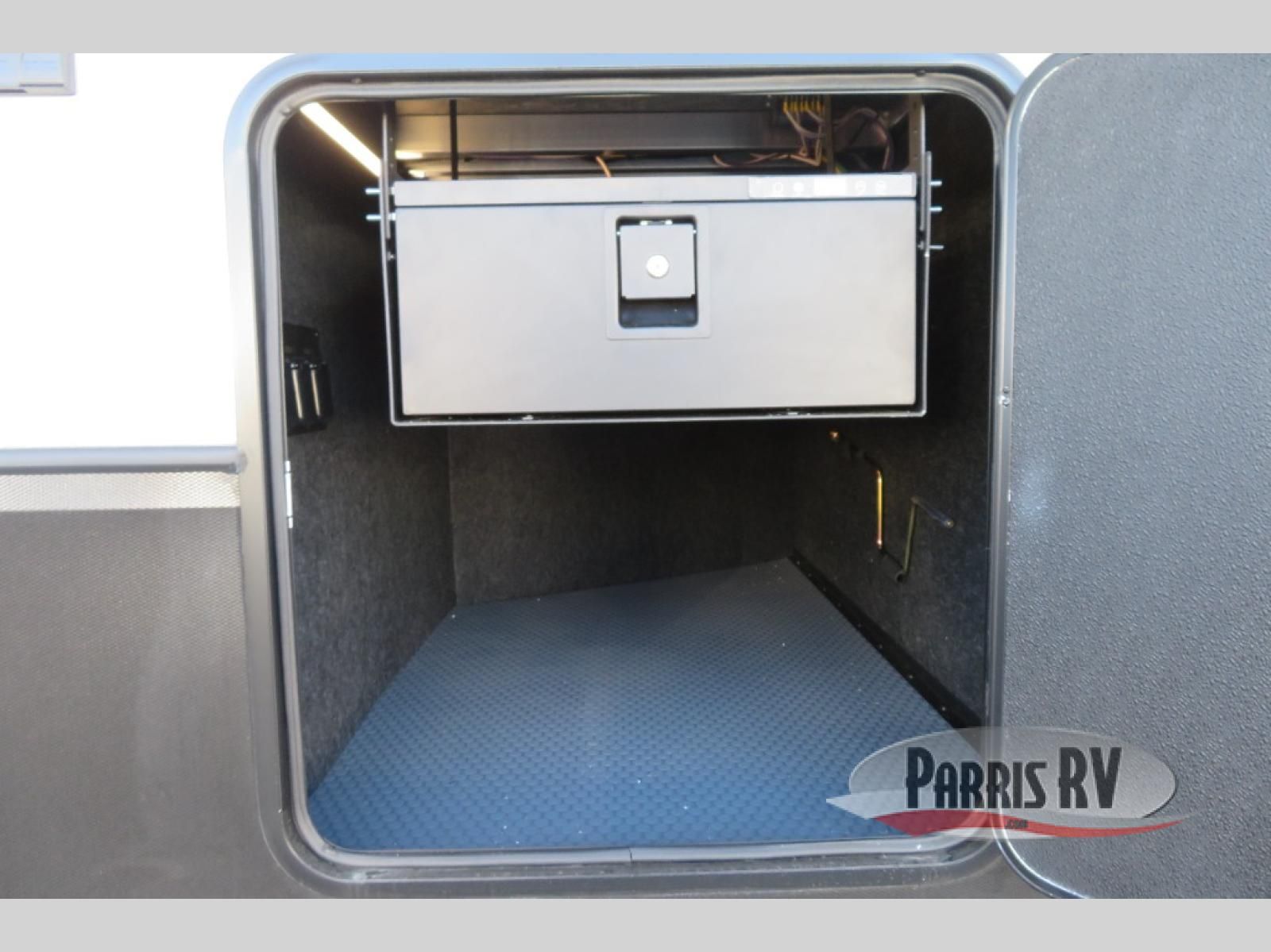 This fifth wheel is decked out in luxuries! The full rear bathroom has a walk-in shower to freshen up in each morning, a dual sink vanity for two to get ready at once, plus washer and dryer prep. You will enjoy a good night's rest on the king bed slide inside the private bedroom and others can sleep on the opposing tri-fold sofa sleeper slides in the living room. There is also a theater seating here, along with a fireplace and 50" LED TV for movie nights. The front kitchen is where it's really at in this fifth wheel; ample counter space, a bar top with stools, pull-out drawers, plus a pantry and closet for even more storage!