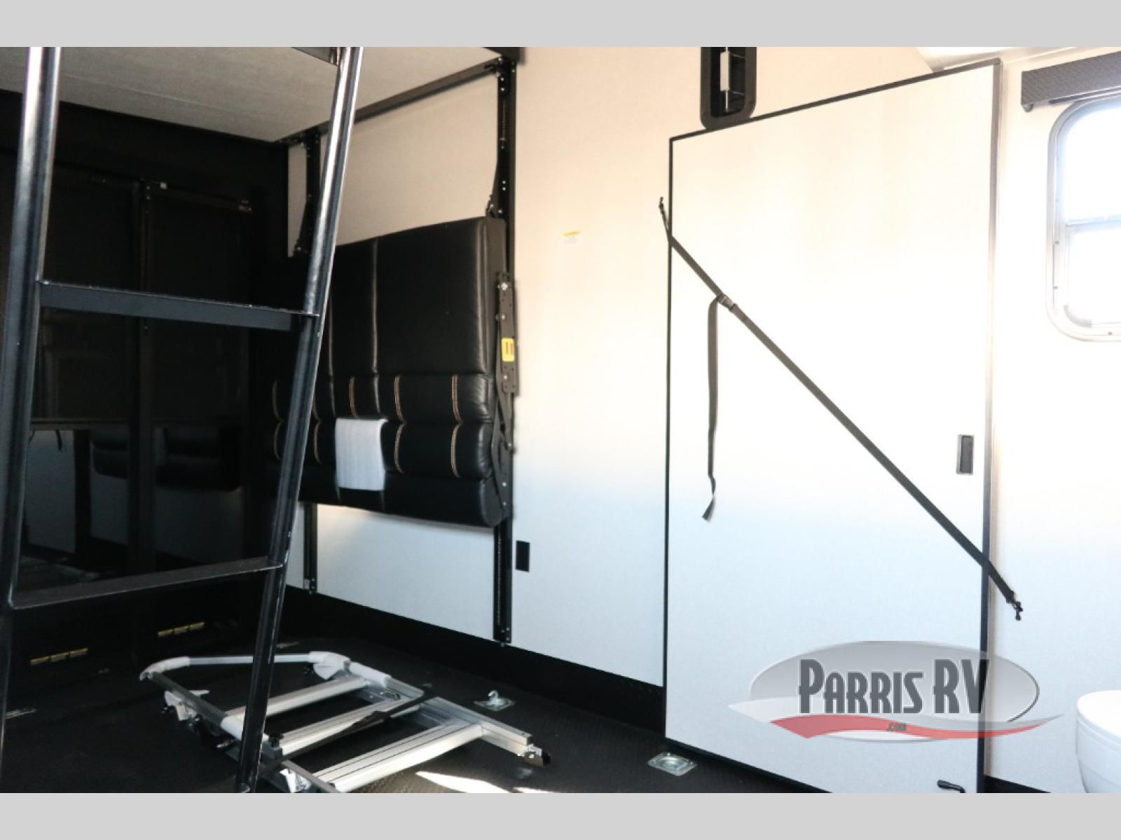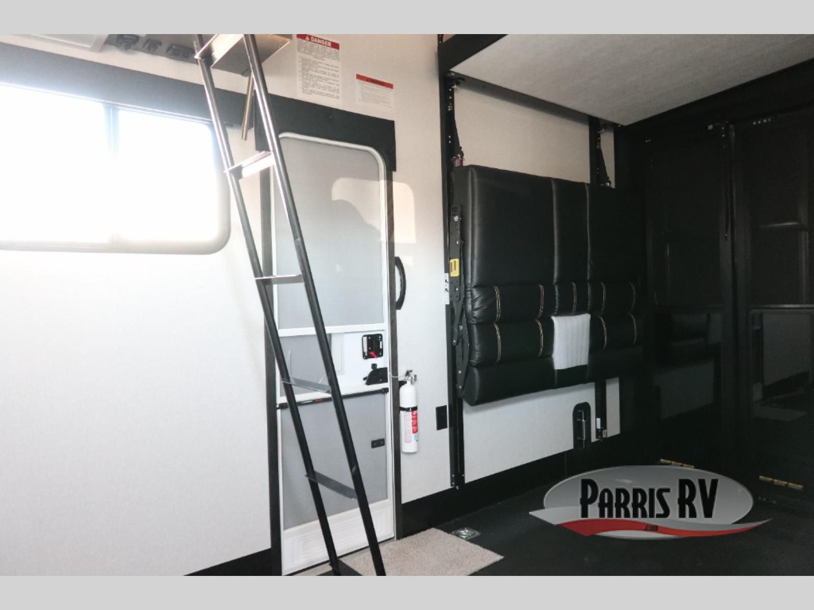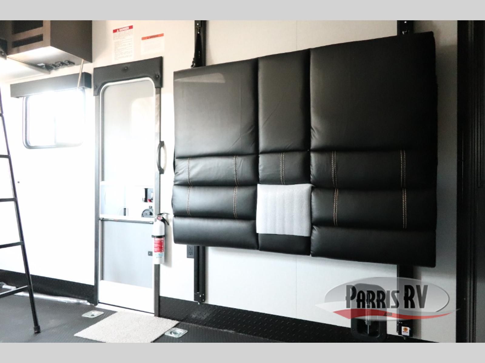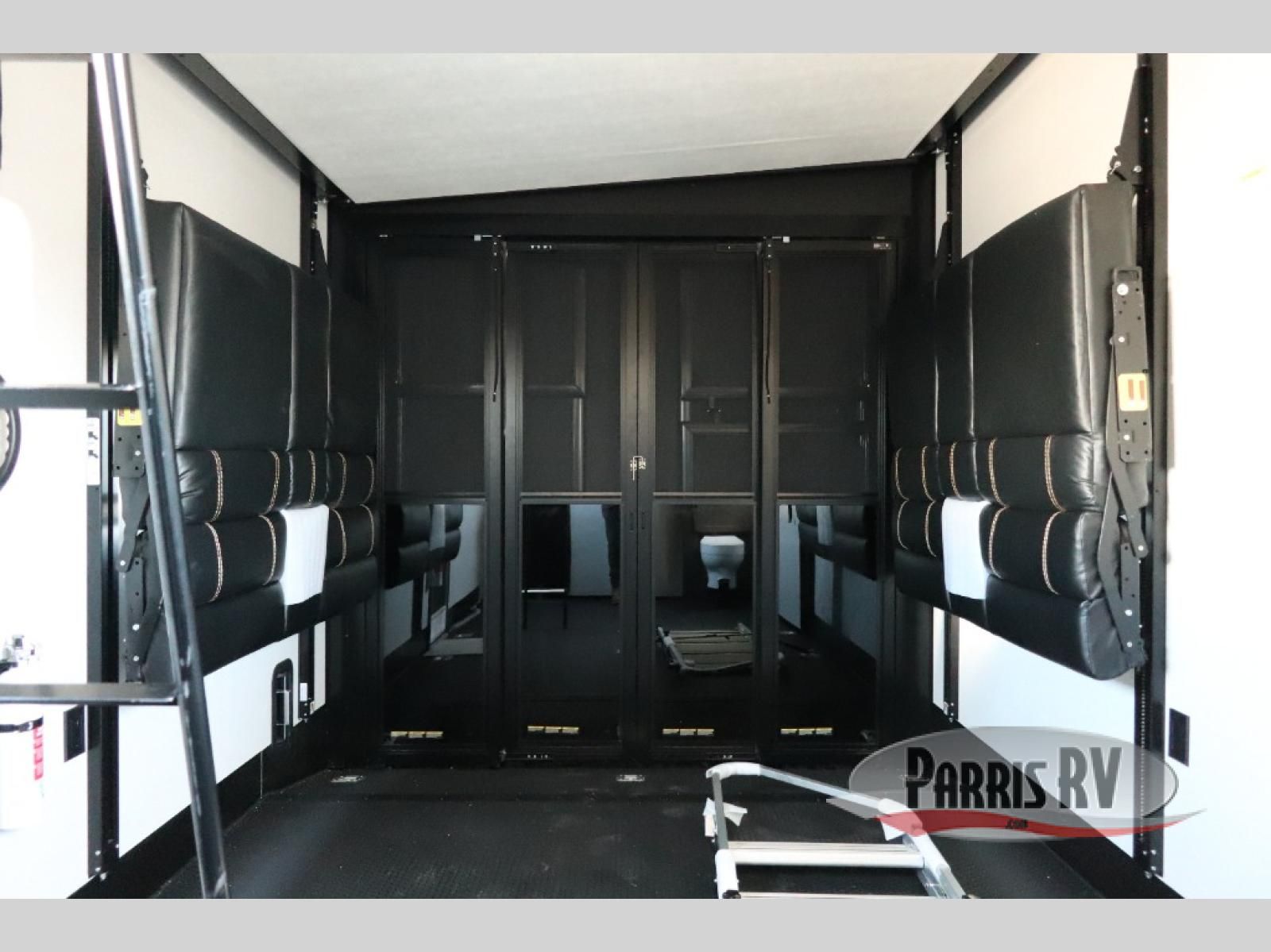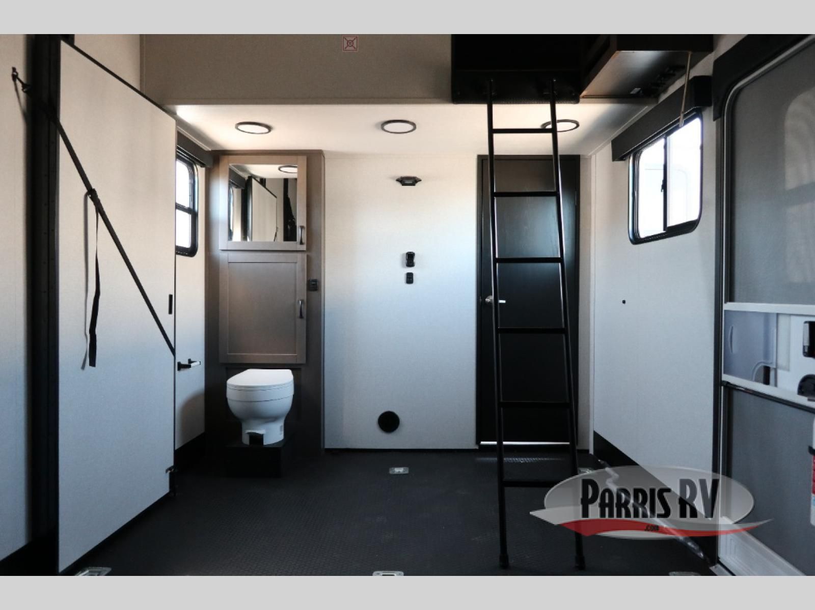 Get on the road with this toy hauler fifth wheel! The 14' garage is a playground for your toys, offering ample space for your ATV, motorcycle, or other gear. The loft above provides additional storage and an electric queen bed for a comfortable rest. The living room is a haven for relaxation, featuring an L-shaped sofa and a theater-style seat perfect for enjoying your favorite shows or movies on the TV. The kitchen is a culinary delight, equipped with a 12V refrigerator, microwave, overhead cabinets, and ample countertop space. The credenza with roll-out table is perfect for meal prep or serving, and the full bathroom provides a private space to freshen up, while the half bath option in the garage gives you more options. The cherry on top is that the front bedroom is a regal retreat, featuring a king bed, drawers, and a spacious walk-in closet.