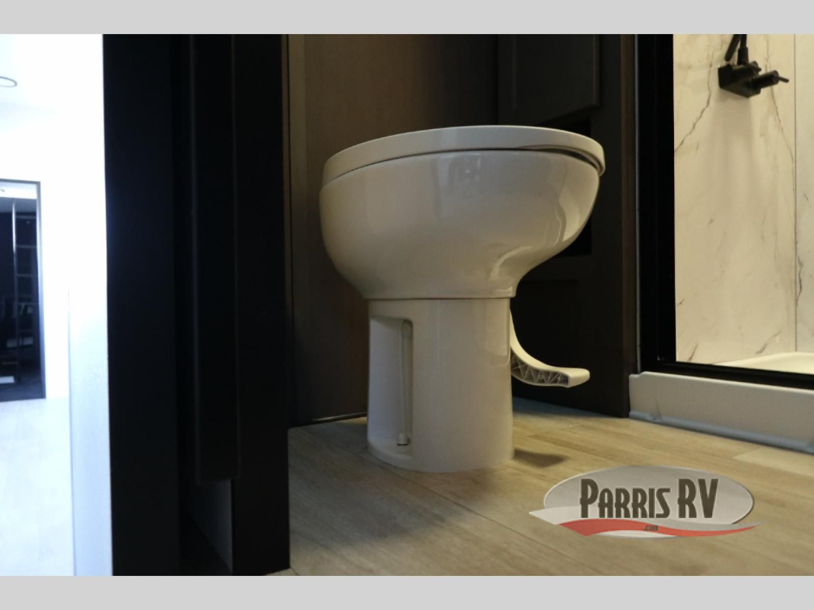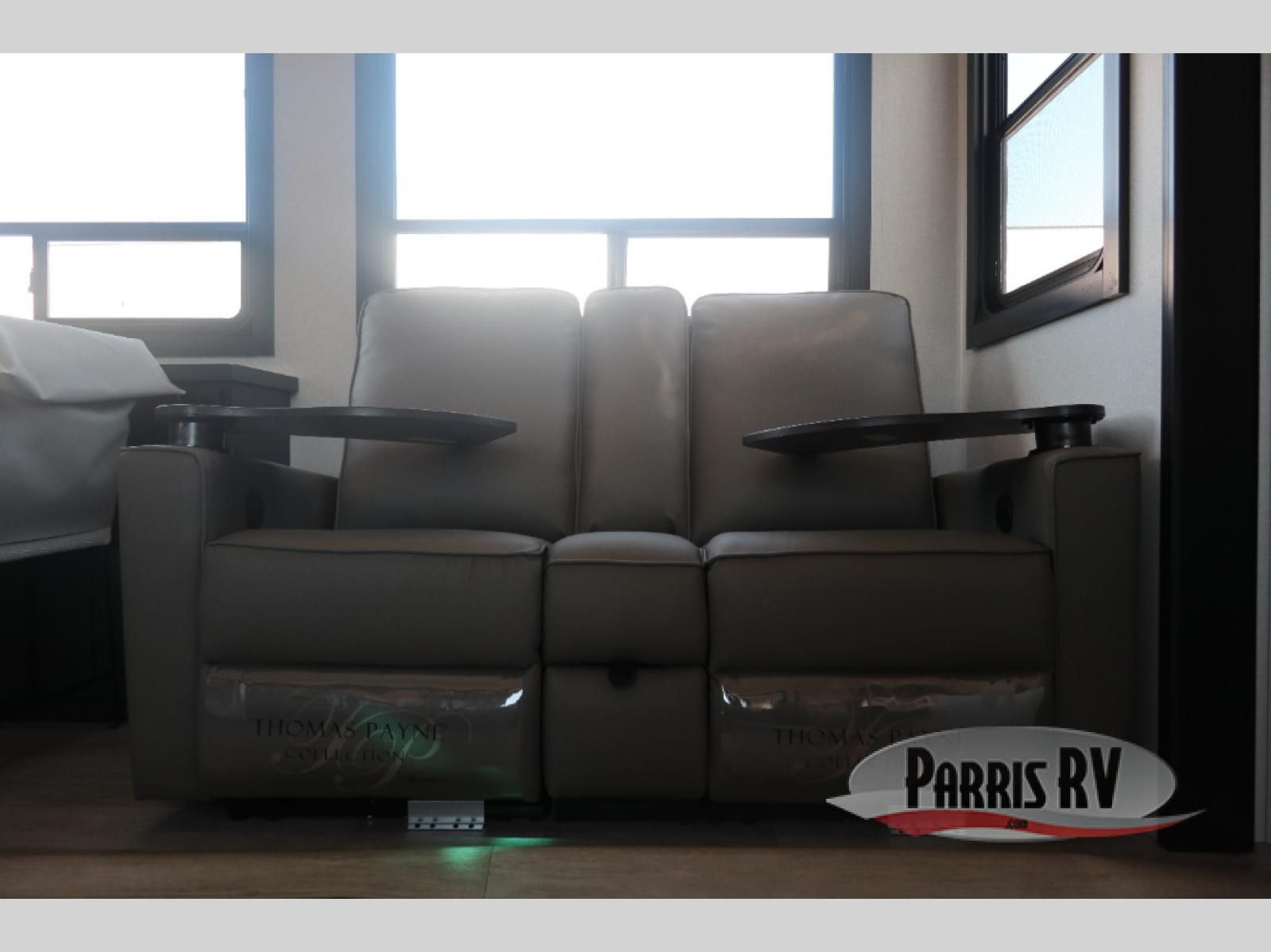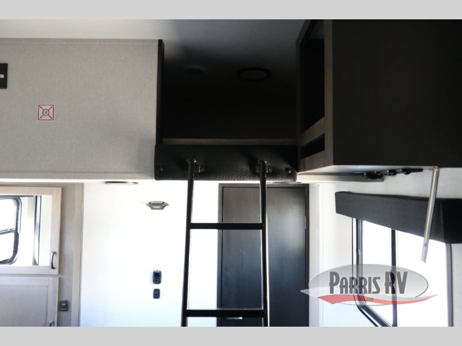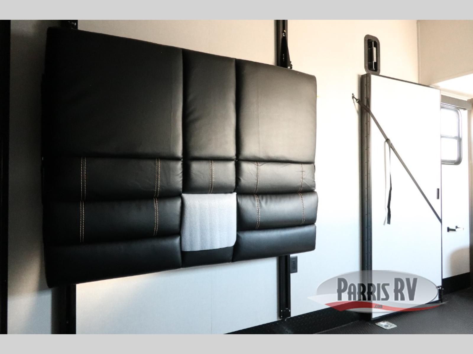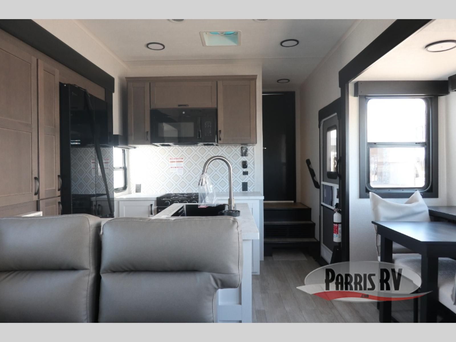 Get on the road with this toy hauler fifth wheel! The 14' garage is a playground for your toys, offering ample space for your ATV, motorcycle, or other gear. The loft above provides additional storage and an electric queen bed for a comfortable rest. The living room is a haven for relaxation, featuring an L-shaped sofa and a theater-style seat perfect for enjoying your favorite shows or movies on the TV. The kitchen is a culinary delight, equipped with a 12V refrigerator, microwave, overhead cabinets, and ample countertop space. The credenza with roll-out table is perfect for meal prep or serving, and the full bathroom provides a private space to freshen up, while the half bath option in the garage gives you more options. The cherry on top is that the front bedroom is a regal retreat, featuring a king bed, drawers, and a spacious walk-in closet.