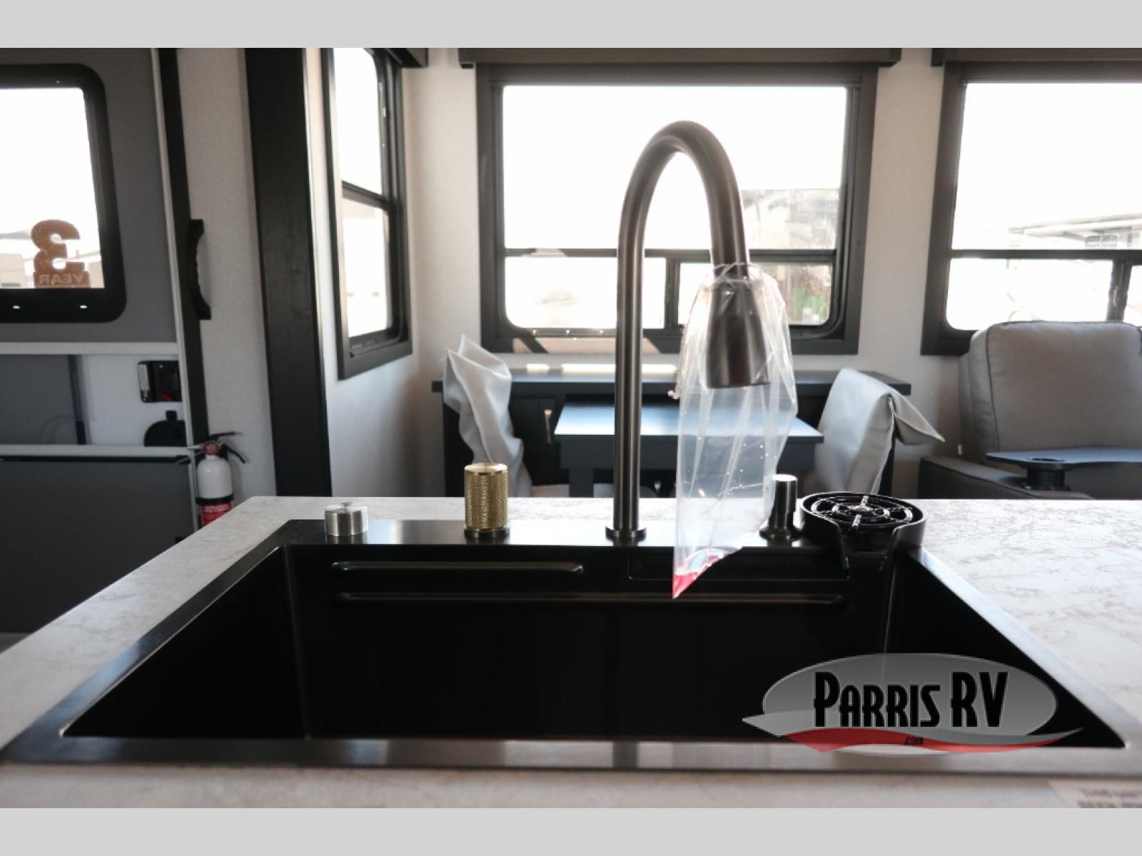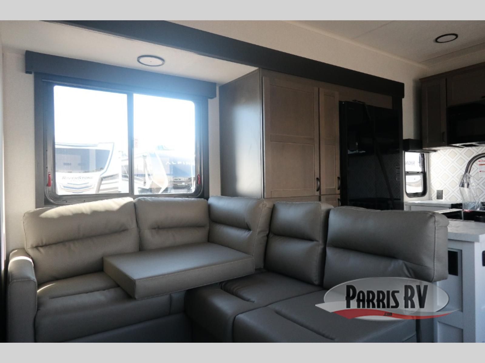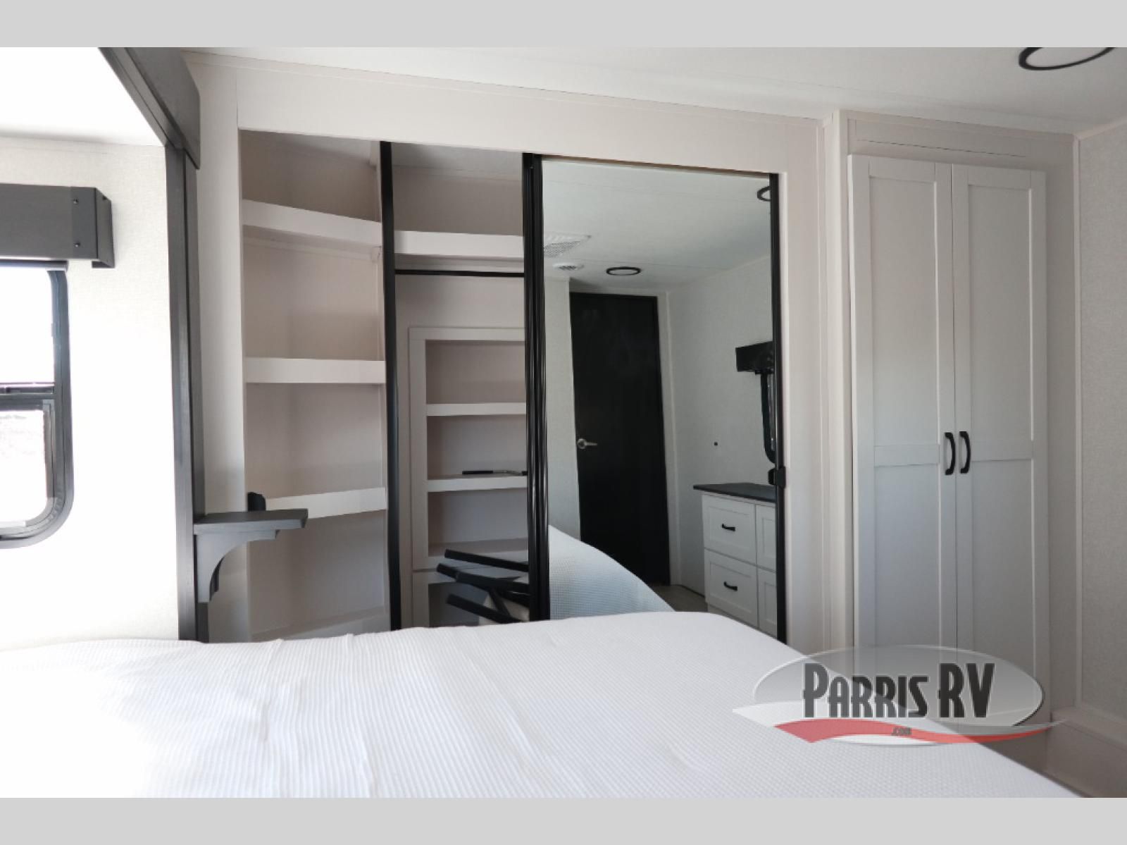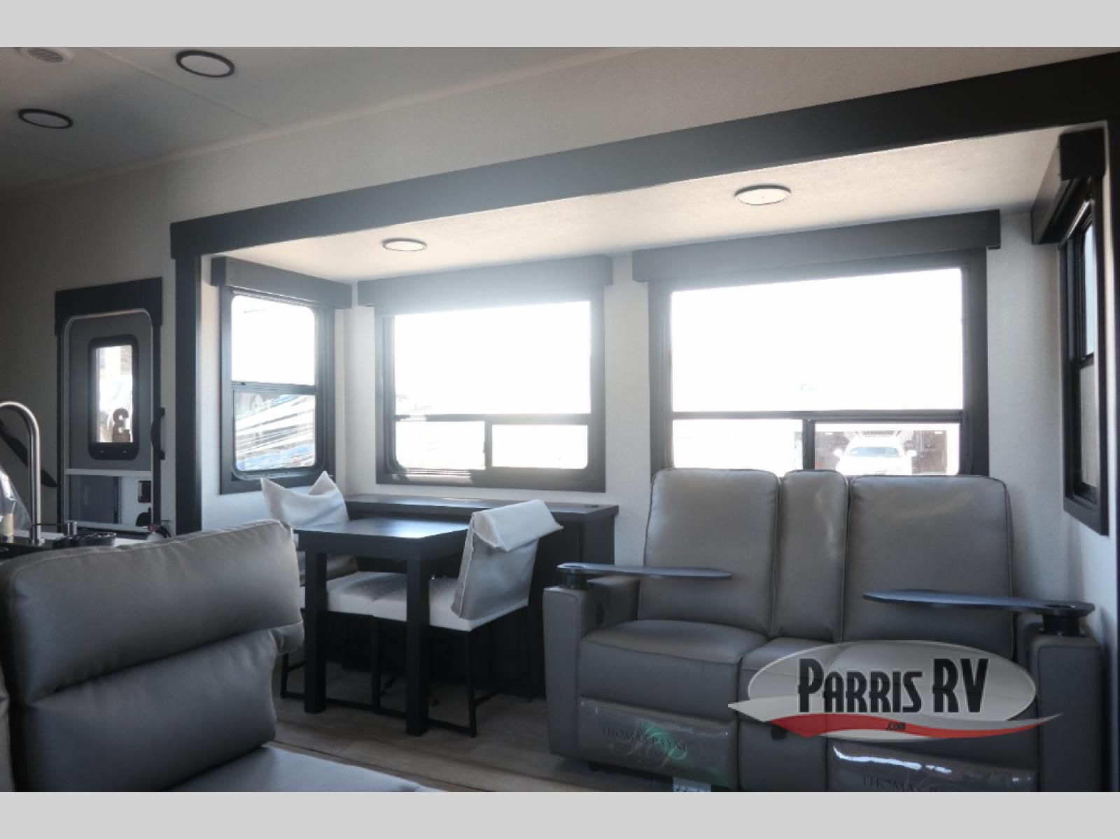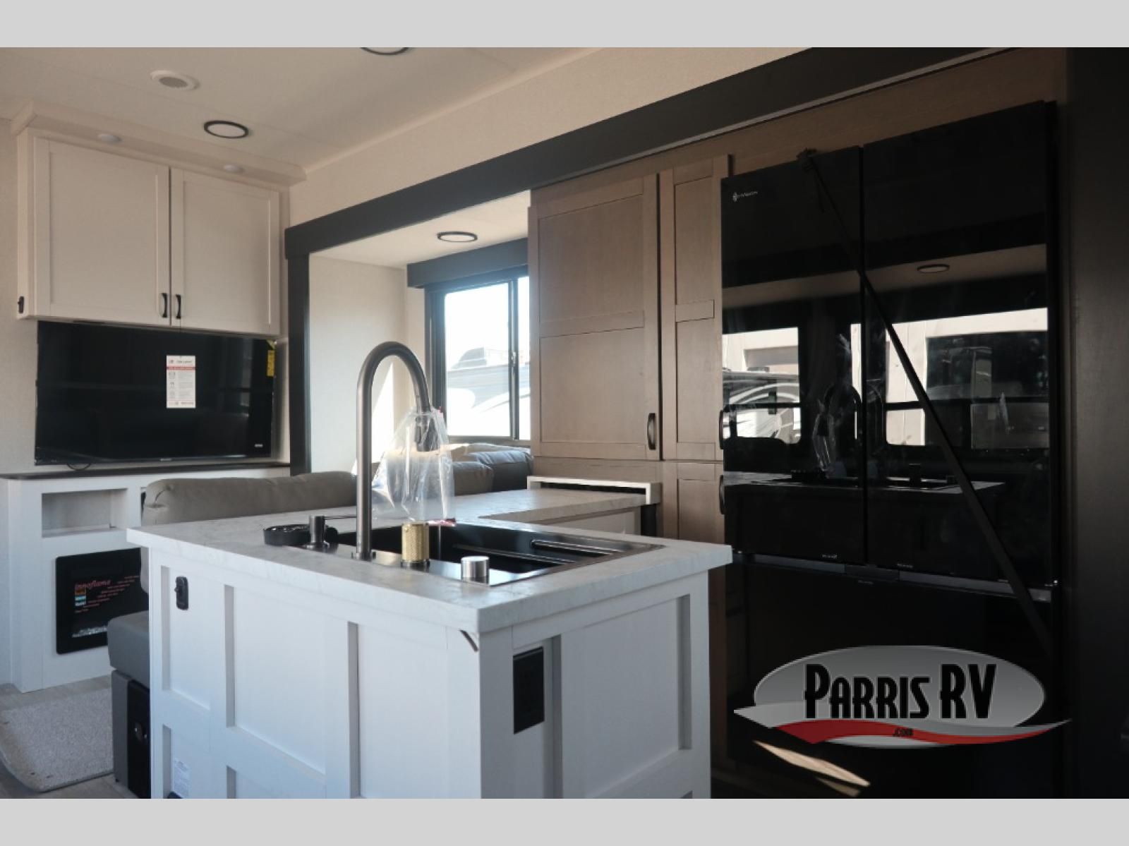 Get on the road with this toy hauler fifth wheel! The 14' garage is a playground for your toys, offering ample space for your ATV, motorcycle, or other gear. The loft above provides additional storage and an electric queen bed for a comfortable rest. The living room is a haven for relaxation, featuring an L-shaped sofa and a theater-style seat perfect for enjoying your favorite shows or movies on the TV. The kitchen is a culinary delight, equipped with a 12V refrigerator, microwave, overhead cabinets, and ample countertop space. The credenza with roll-out table is perfect for meal prep or serving, and the full bathroom provides a private space to freshen up, while the half bath option in the garage gives you more options. The cherry on top is that the front bedroom is a regal retreat, featuring a king bed, drawers, and a spacious walk-in closet.
