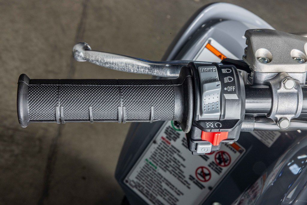 Thumb throttle lever has ergonomic shape for less fatigue and handlebar-mounted flip-type parking brake lever is simple to use.