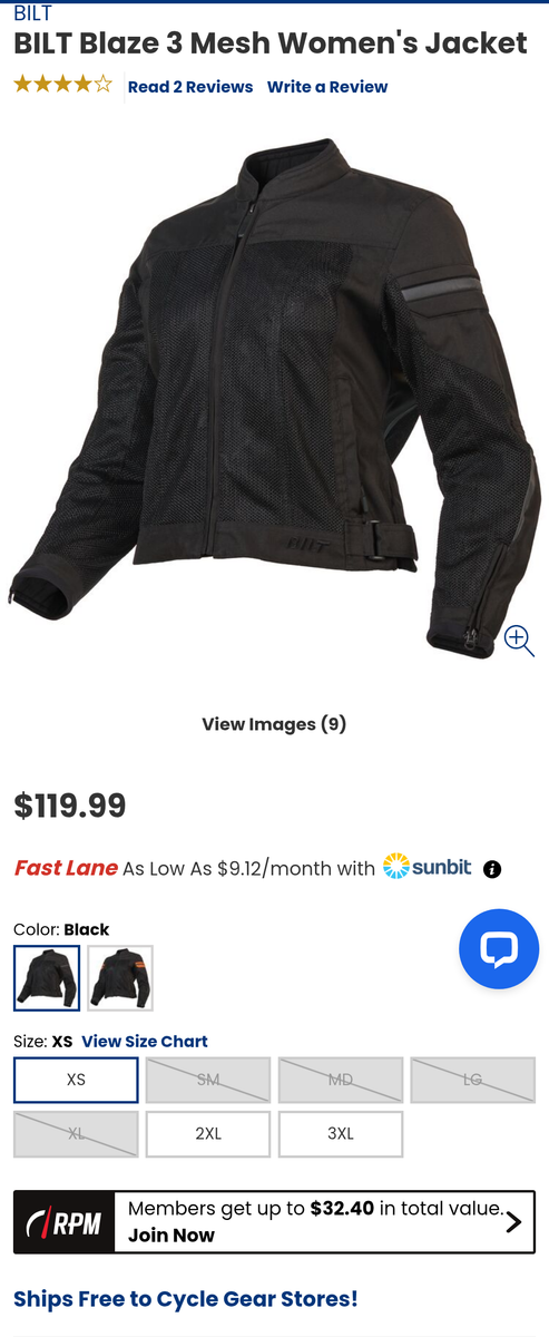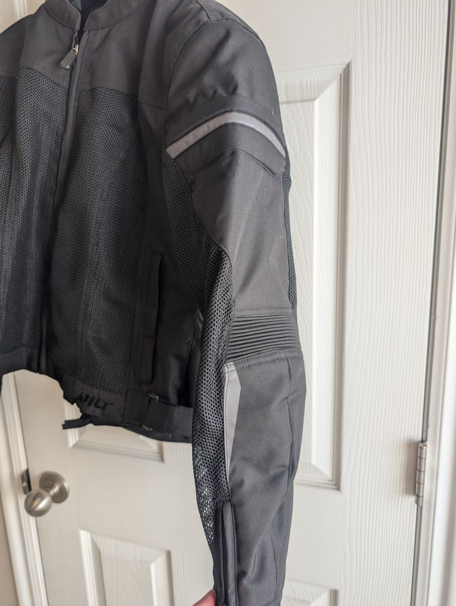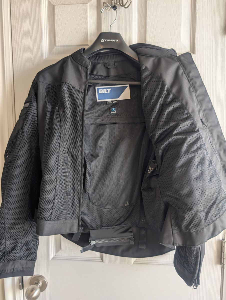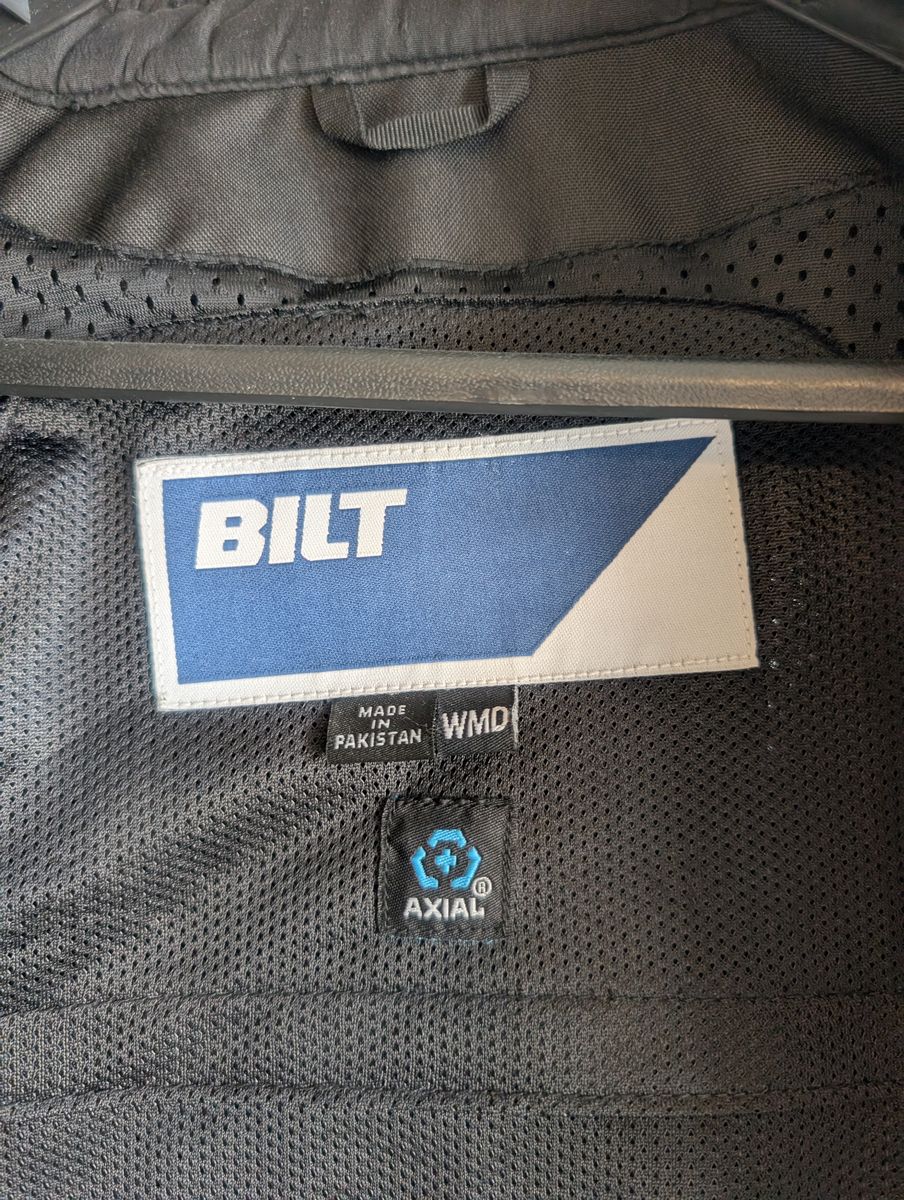 BILT Blaze 3 Mesh Women's Jacket, size: Womens Medium. purchased at cycle gear this past summer, only worn a couple of times. Looks new with no damage, never been in accident. No longer need jacket. Construction: Airflow mesh inner lining, 600D Oxford textile chassis, Ultra-high-flow mesh panels. Ventilation: Airflow mesh upper torso, inner arm, full back and underarms. Full mesh inner liner Protection & Safety: Vented AXIAL AX1 CE Level 1 shoulder and elbow armor, Pocket for optional AXIAL back protector. Humanoid form reflective details Comfort: Hook and loop closure at waist adjustment points, Neoprene comfort rolled collar and cuffs, Revised upper chest and arm tailoring Pockets: Zip entry front pocket, Inside zipper pocket Other Features: YKK custom BILT zipper pulls, Belt connector loops and short connection zipper to link Blaze 3 Pants
