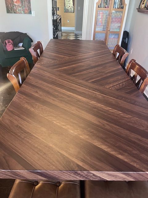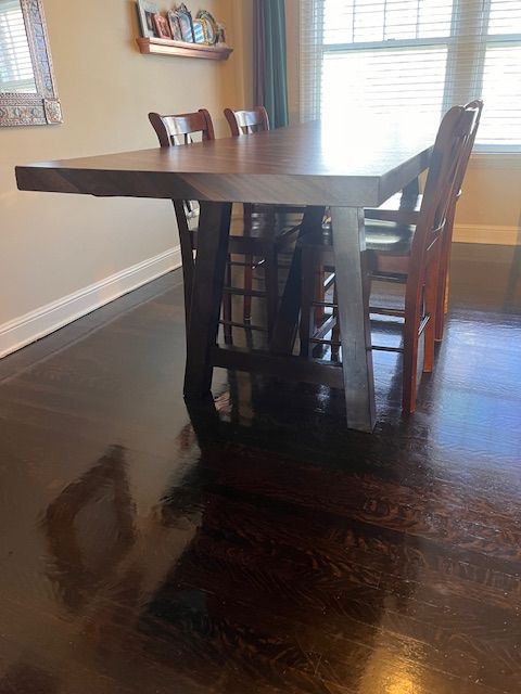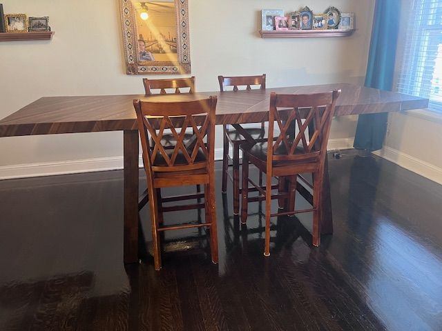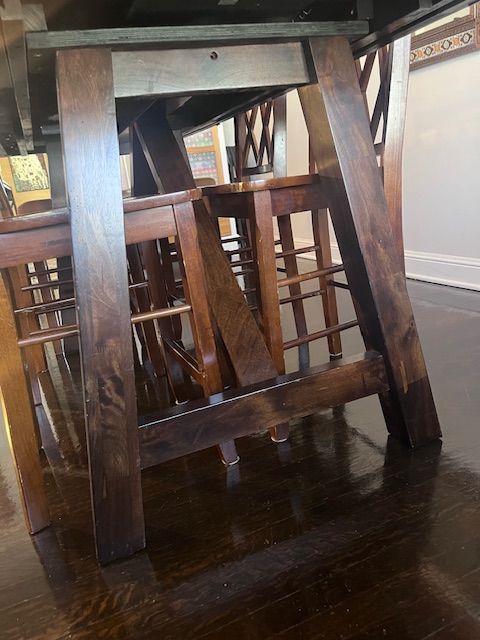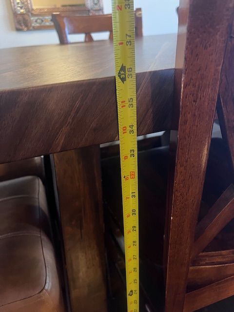 ApplePayPerfect for large family gatherings! Bought a new home and don't have space, or I'd never sell it. Comfortably seats 8 people. I use two bar stools on each end. Legs are solid wood, top is veneer (currently covered with faux wood application). 36 H, 36 depth, 107 length. Stunning addition to any dining room!