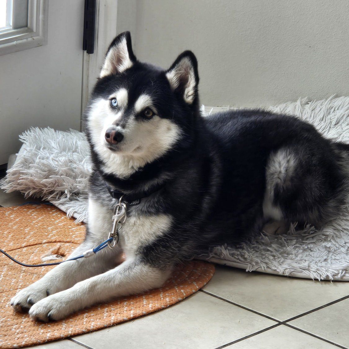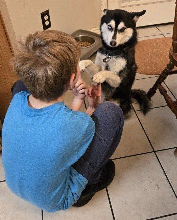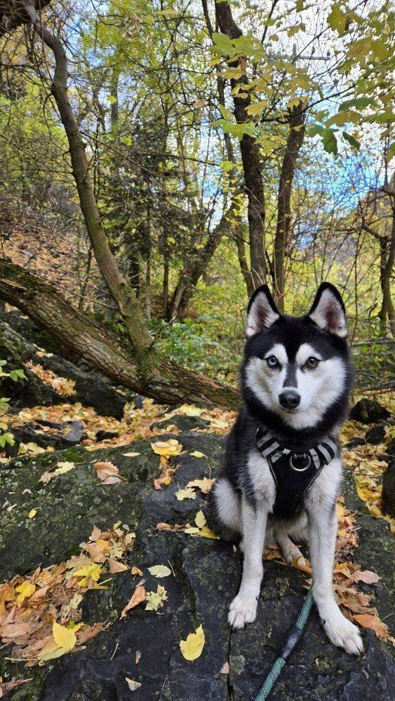 Scout's an F2B Pomsky (both parents were Pomskies - half husky, half pomeranian). His mom looked like him, but a tiny bit fluffier, and smaller. His dad, looks like him but a bit bigger and has the reddish brown & white combo, not black and white. He's a very friendly dog, and is especially drawn to the ladies. Scout weighs around 20 pounds, and reminds us of a mini husky with his shorter fur than most pomskies we've met... which has been great for maintenance! He is current on all shots.