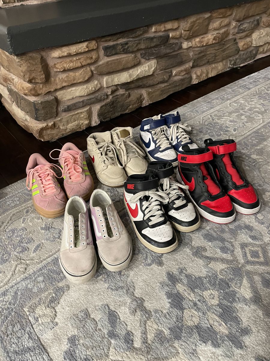Nikes - Black and red size 6, $30 Nikes - black, white and red size 4, $30 Vans - pink size 3, $20 Nikes - blue and white size 3.5, $30 Jordans - crème size 4, $30 Adidas - pink size 3.5, $25