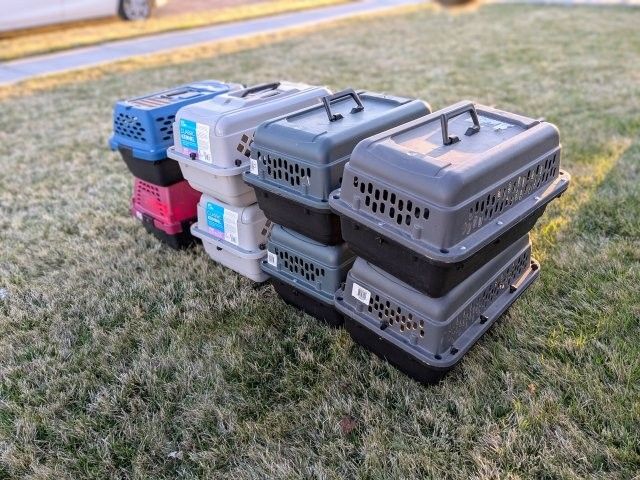 Multiple small carriers for you to select, Fits pets 7" to 9" tall, Up to 10 lbs. Chihuahuas, Small Animals and Kittens. Dimensions about: 19"L x 13"W. x 12"H. Great condition.