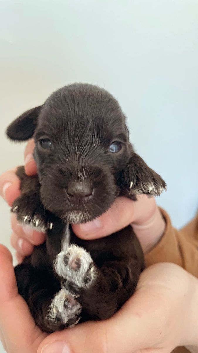 VenmoGorgeous miniature schnauzer litter. Only two weeks old. We have all the most sought-after colors: two solid liver/brown girls, one phantom/ beige and brown tri-colored girl, one full white girl and one full black male.