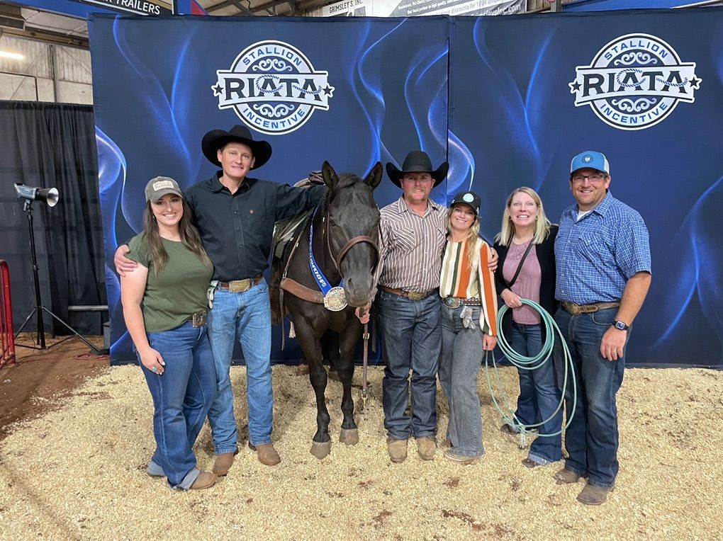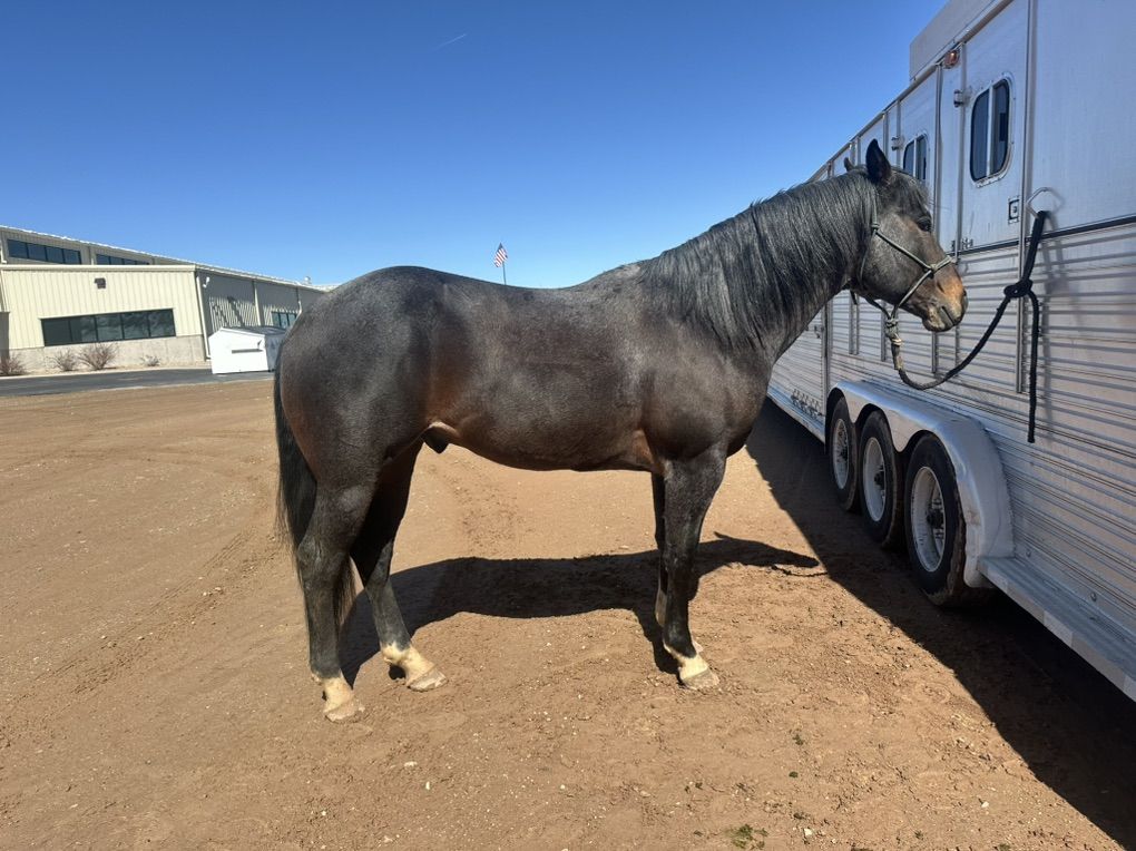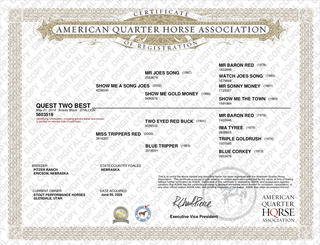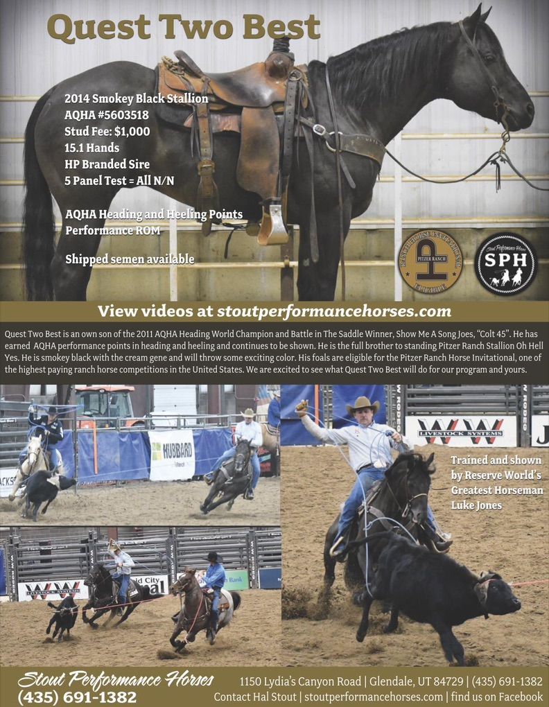 Quest Two Best is a 2014 smokey black AQHA stallion and throws lots of color (blacks, buckskins, palominos). He is a son of AQHA World Champion head horse Show Me A Song Joes. He is 15.1 hands and is 5 panel N/N. He won the 8.5 Riata Buckle Championship heeling in 2024. He has over $18,000 in official lifetime earnings (not counting jackpot and unofficial roping winnings). He has speed, athleticism and a great mind. His live cover breed fee is $1,000 with no other fees except mare care. We also offer shipped semen.