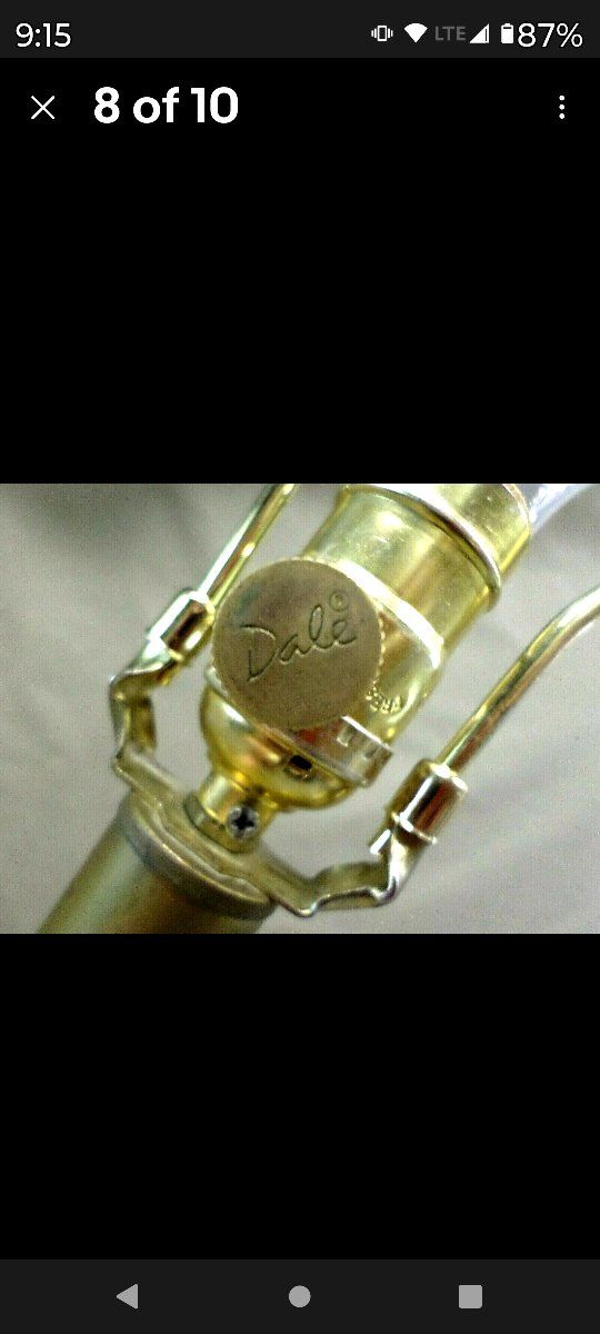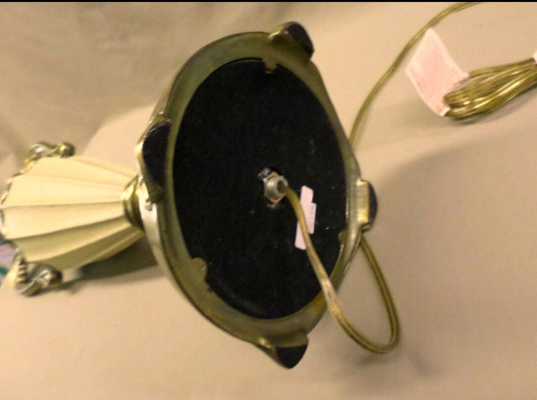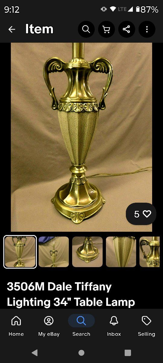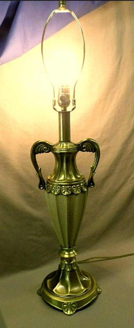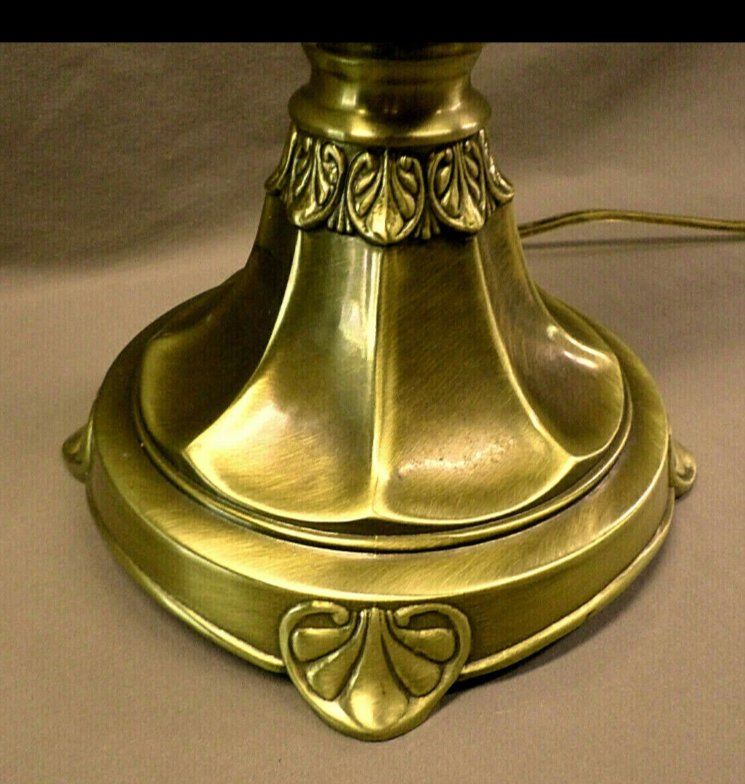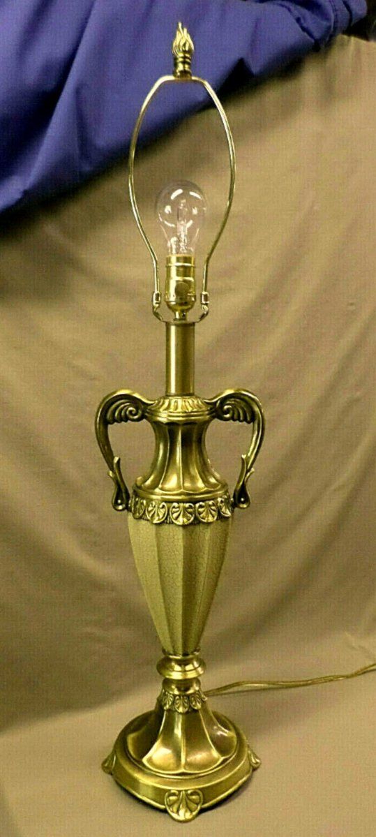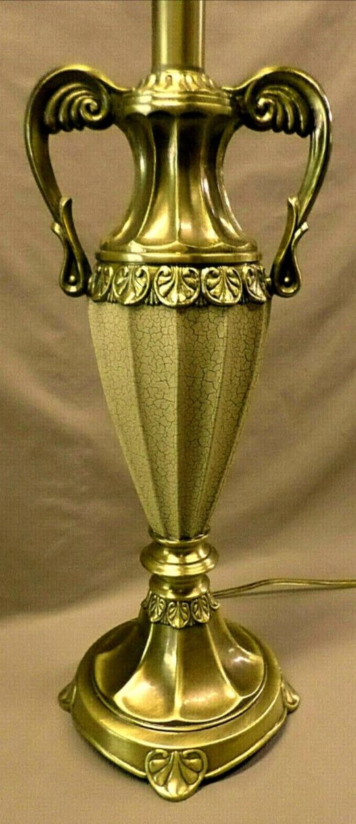 PayPalTHIS BEAUTIFUL VINTAGE DALE TIFFANY LAMP STANDS 34 1/2" TALL TO THE TOP OF THE FINIAL AND 24 1/2" TALL TO THE TOP OF THE BULB SOCKET. THE BRASS METAL MEASURES 7 1/2" ACROSS AT THE "ARMS" . THE BASE IS 6 3/4" ACROSS AND 7 3/4" ACROSS AT THE FEET. IT IS IN EXCELLENT CONDITION. THE ENTIRE LAMP IS BRASS AND THE MIDDLE TAN COLORED URN HAS A CRACKLED LEATHER TYPE FINISH OVER THE METAL.