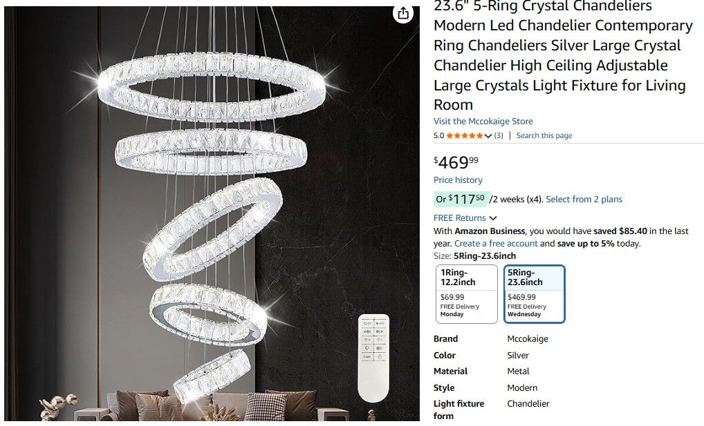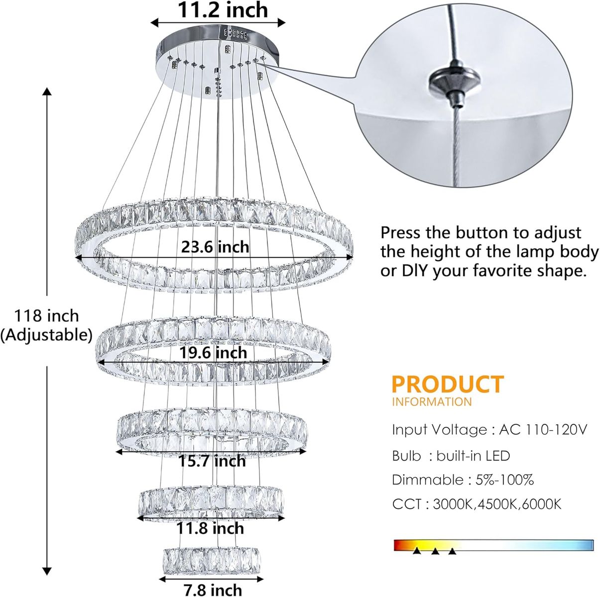 About this item - [Size and Design] The maximum ring width of this crystal chandelier is 23.6 inches, the size of the minimum ring is 7.8 inches, and the size of the ceiling plate is 11.2 inches. This crystal modern LED chandelier is in modern minimalist style and made of high quality k9 crystal material. It is suitable to dress up your upscale and elegant modern home.