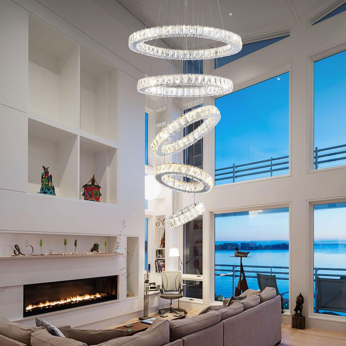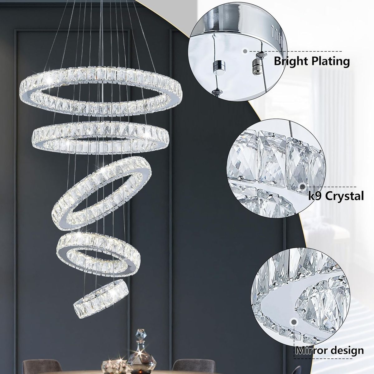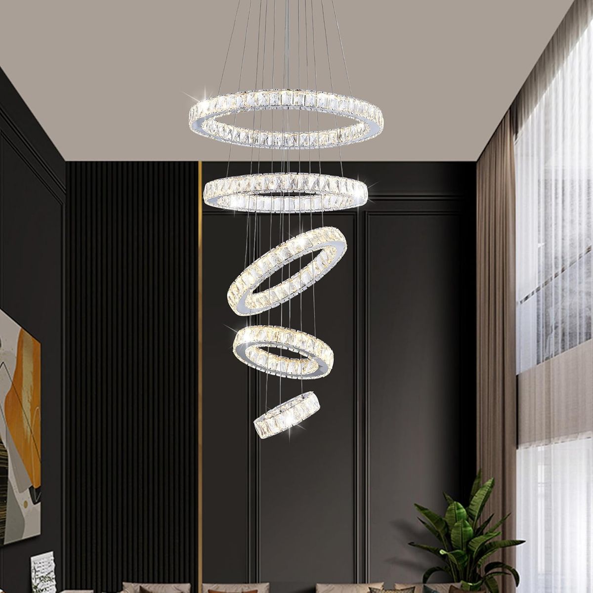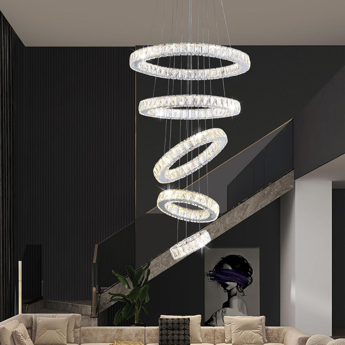 ApplePay23.6" 5-Ring Crystal Chandeliers Modern Led Chandelier Contemporary Ring Chandeliers Silver Large Crystal Chandelier High Ceiling Adjustable Large Crystals Light Fixture for Living Room