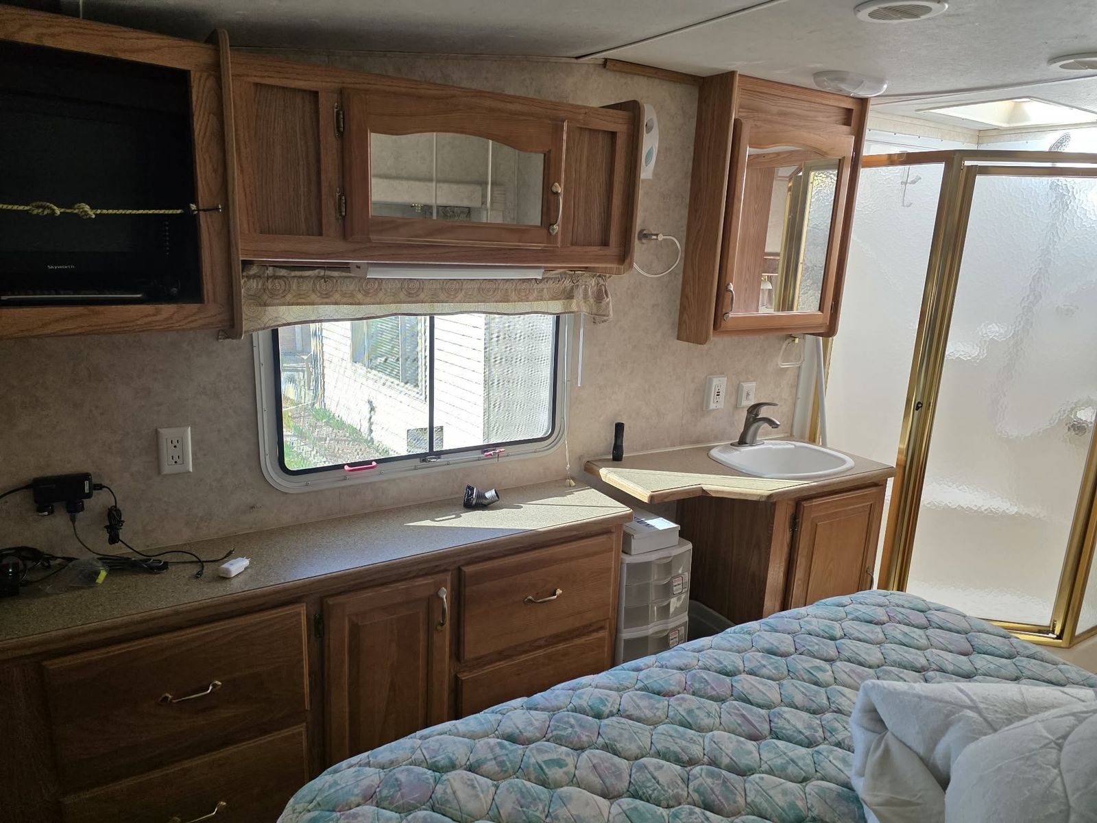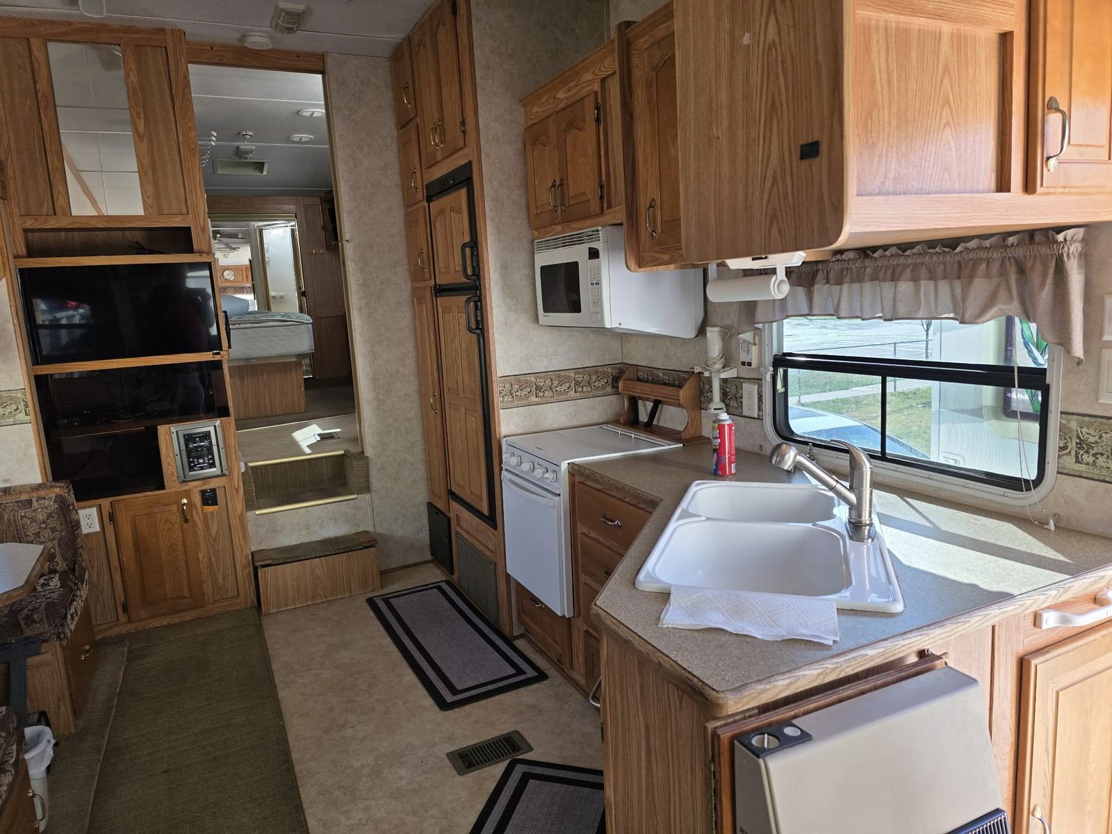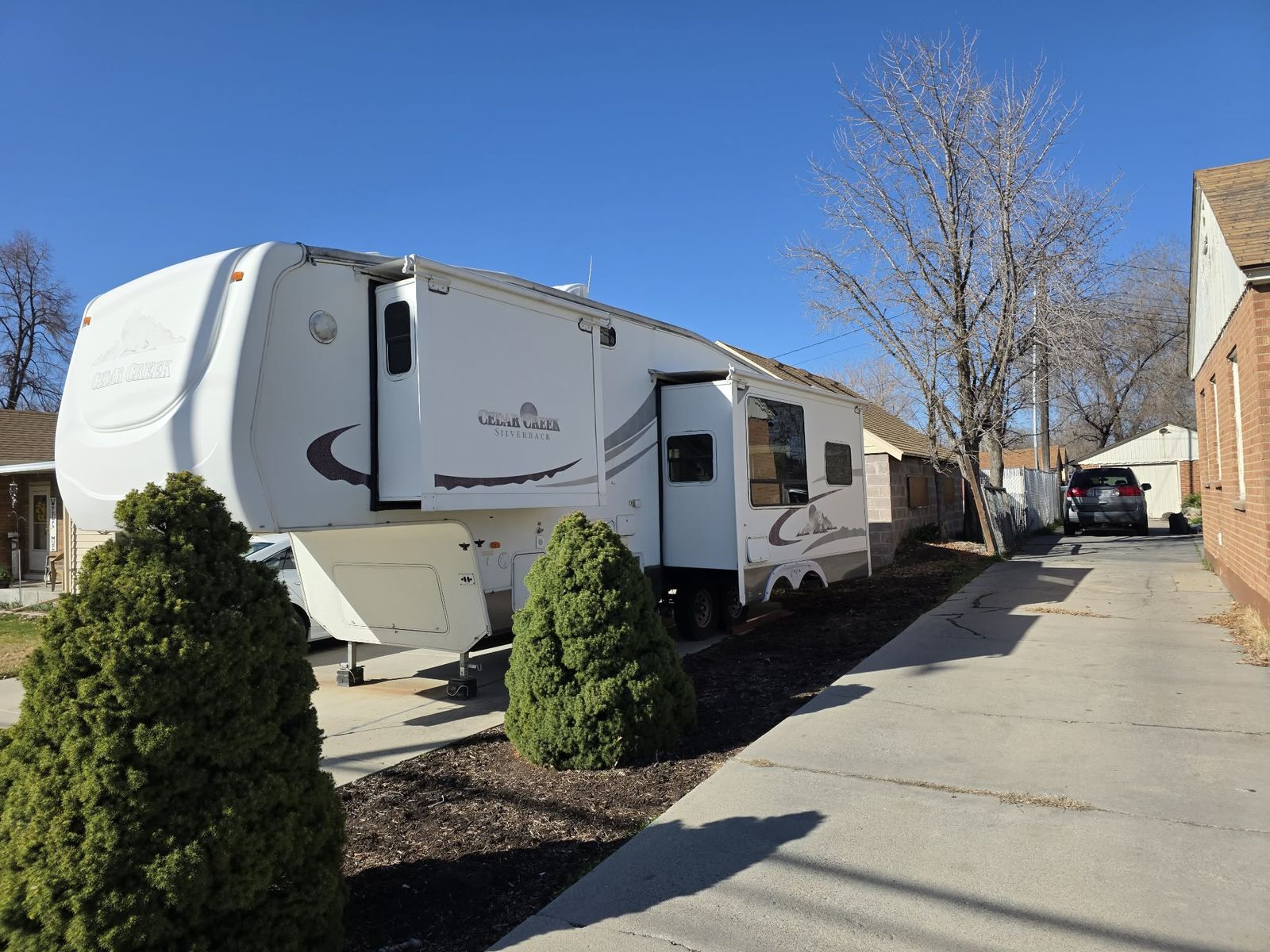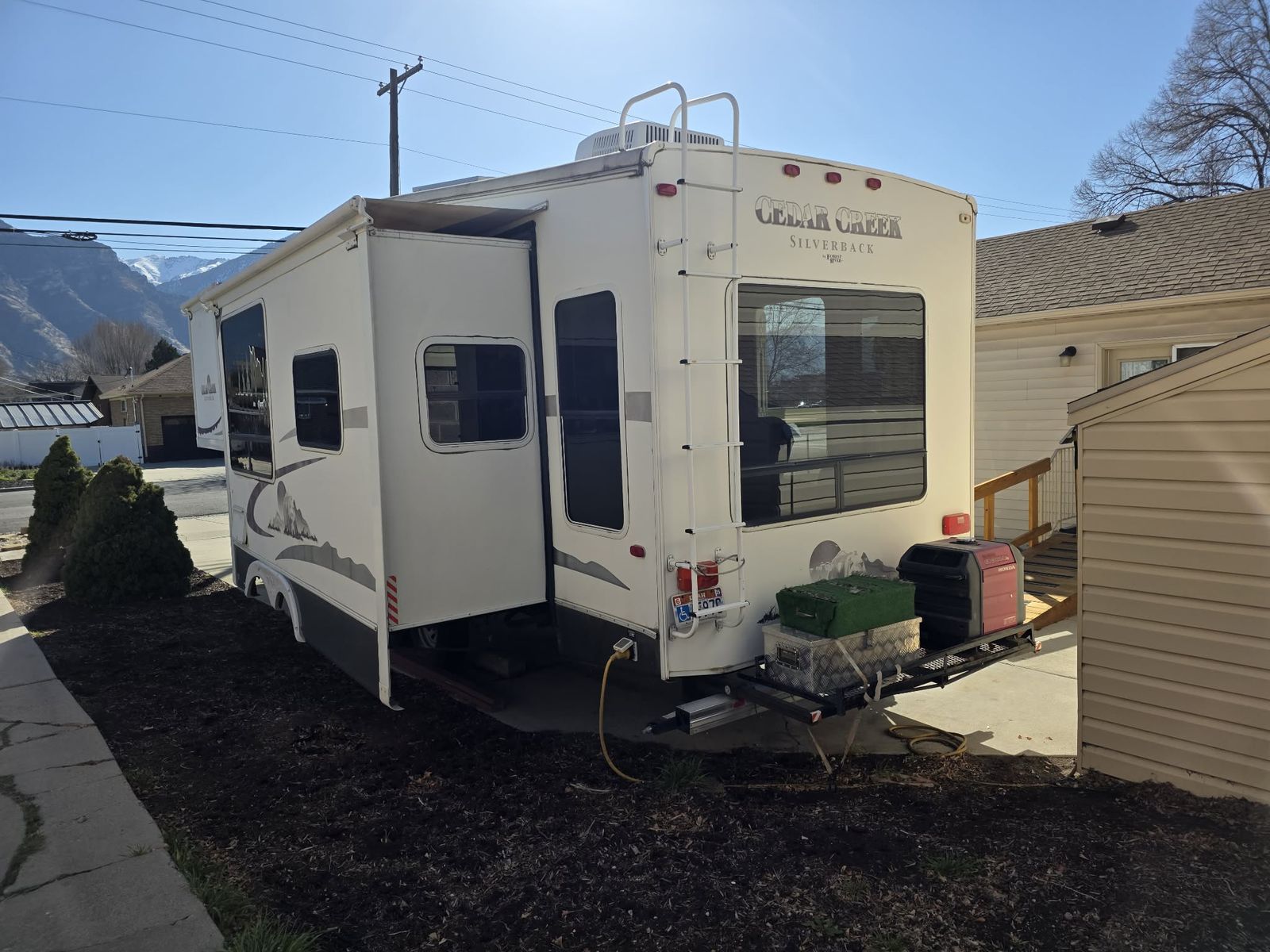 The 2005 Cedar Creek Silverback 29LRLBS is a 32-foot rear-kitchen fifth wheel featuring solid construction with aluminum-framed, laminated fiberglass walls. Known for its spacious layout and queen-size slide-out bedroom, it offers substantial counter space and a large rear window. Key Specifications & Features: Length: Approximately 32 feet. Weight: Around 10,070 lbs (dry/base weight). Construction: Aluminum studs, fiberglass exterior. Layout: Rear kitchen with a bedroom slide-out. Amenities: Includes central A/C, electric front jacks, spare tire, and microwave, Honda EU3000 Generator, Solar Panels and Satellite Dome Interior Features: Known for honey oak wood tones, a large rear window.
