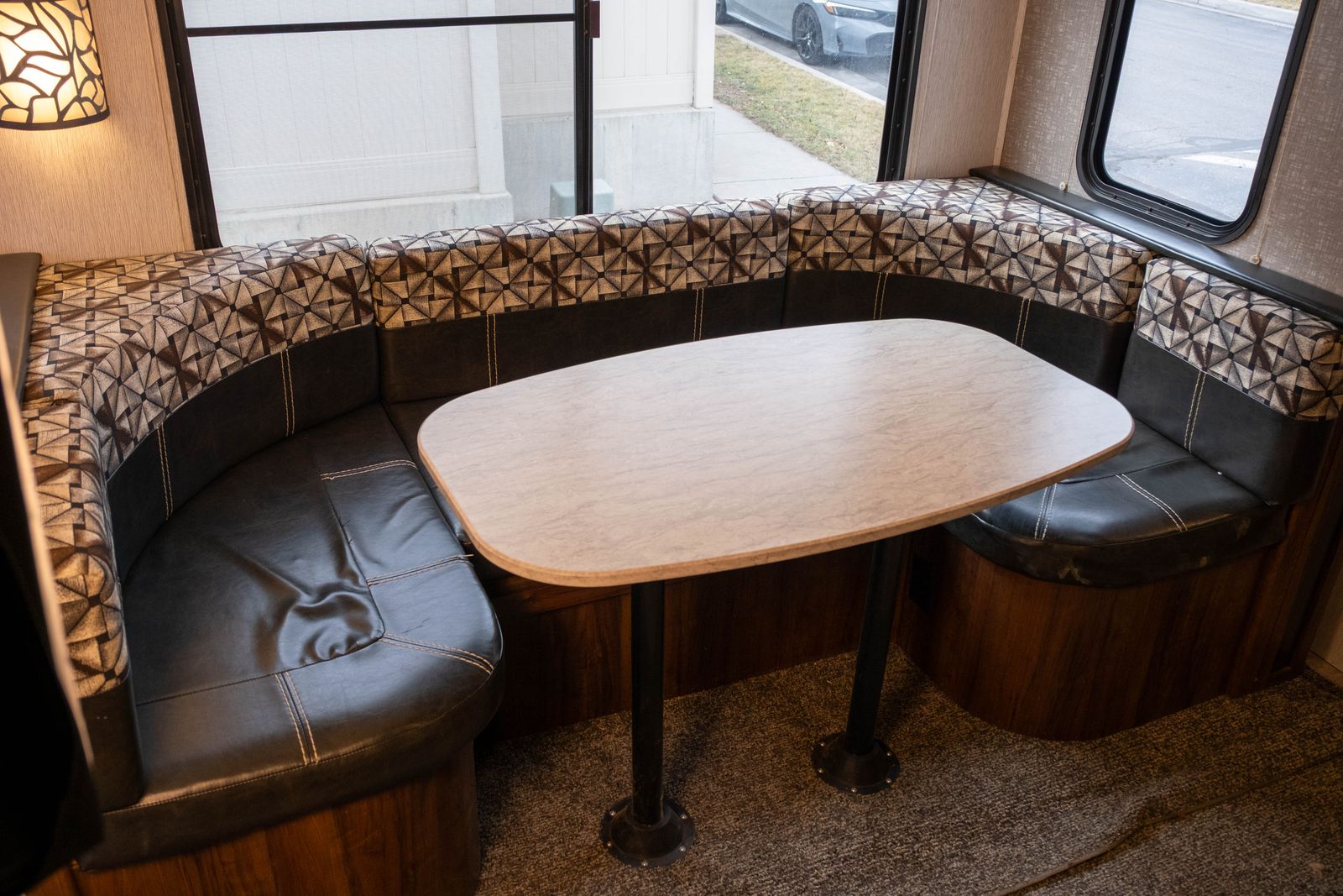 Living Area: U-shaped dinette in a slide-out, sofa, and overhead cabinets.